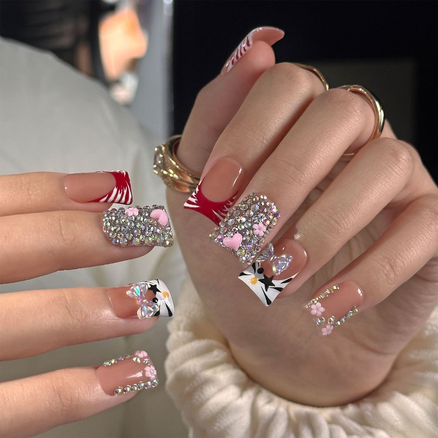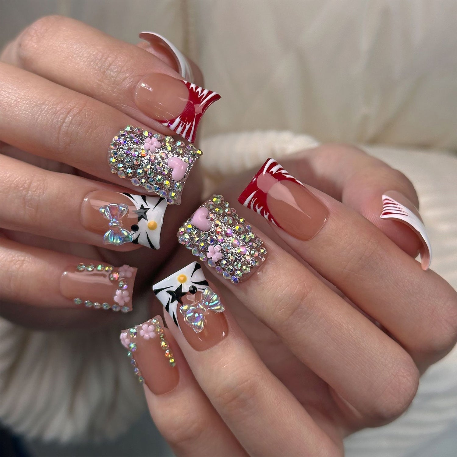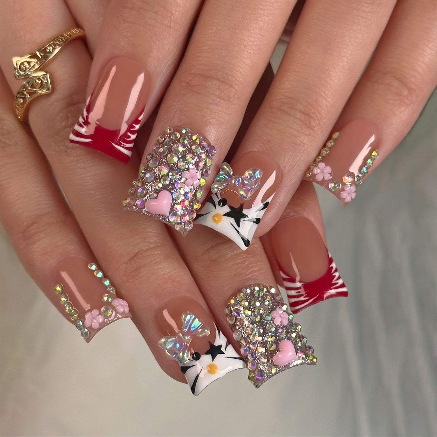 This design is a sweet blend of vibrant red, classic nude, and playful stripes. It's a whimsical, glittery look with tiny hearts and daisies that feel like a fun Valentine's Day treat.
