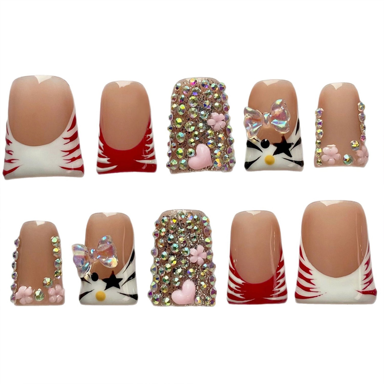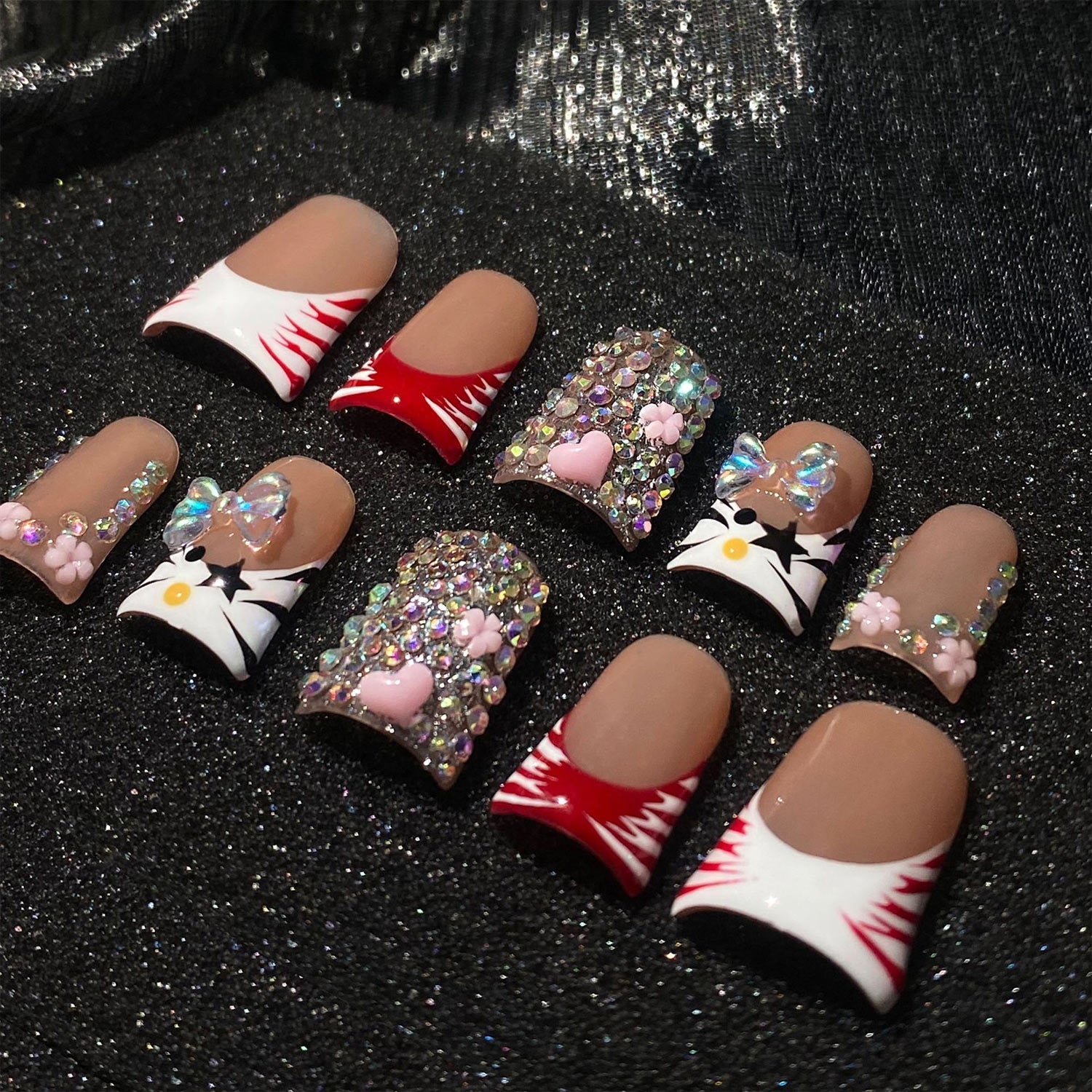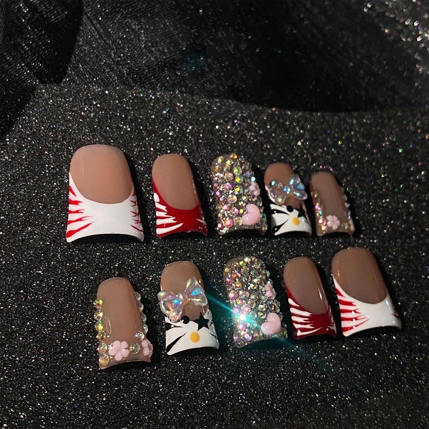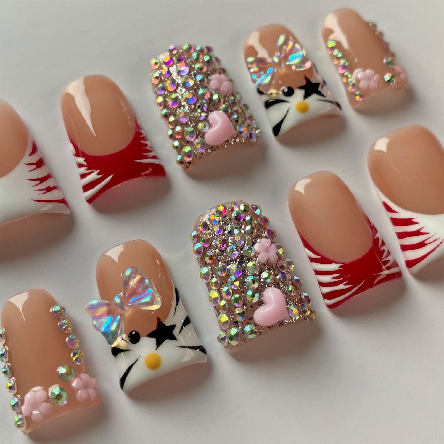 This design is a sweet blend of vibrant red, classic nude, and playful stripes. It's a whimsical, glittery look with tiny hearts and daisies that feel like a fun Valentine's Day treat.