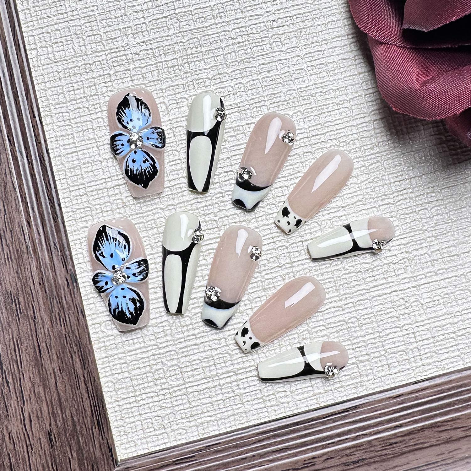 This manicure feels both vintage and modern, with its black and white color palette and playful, hand-painted details. The three-dimensional butterfly adds a charming and whimsical touch that makes the design truly pop.