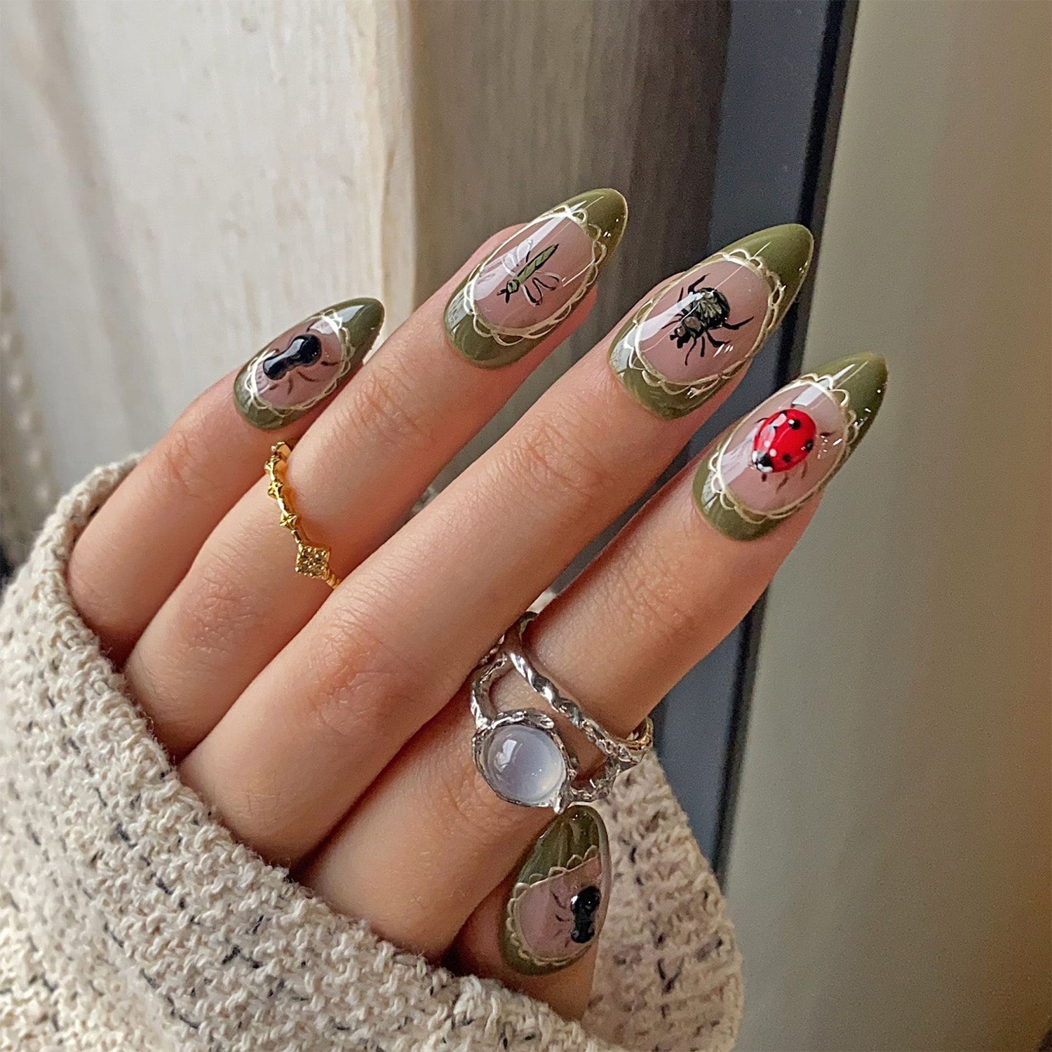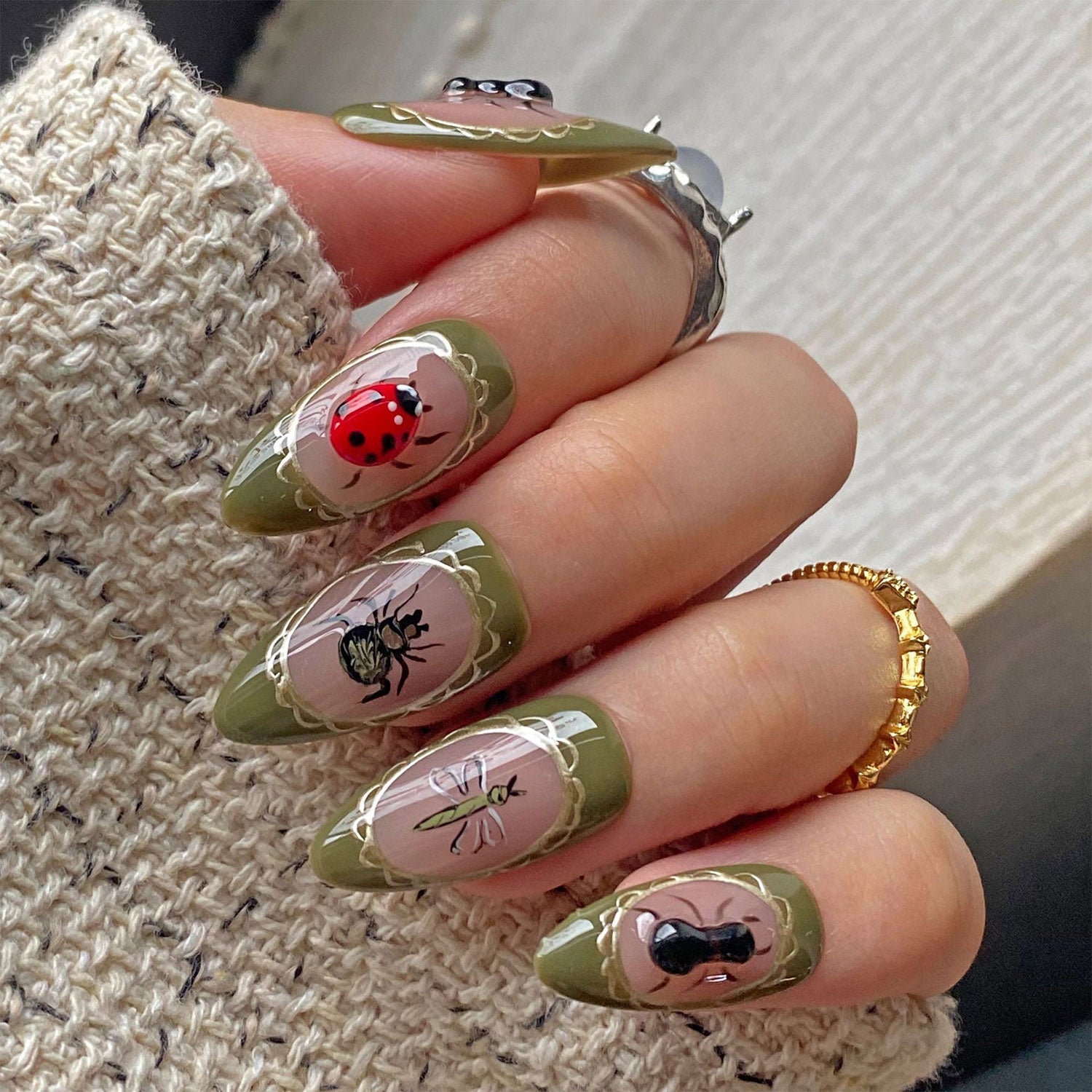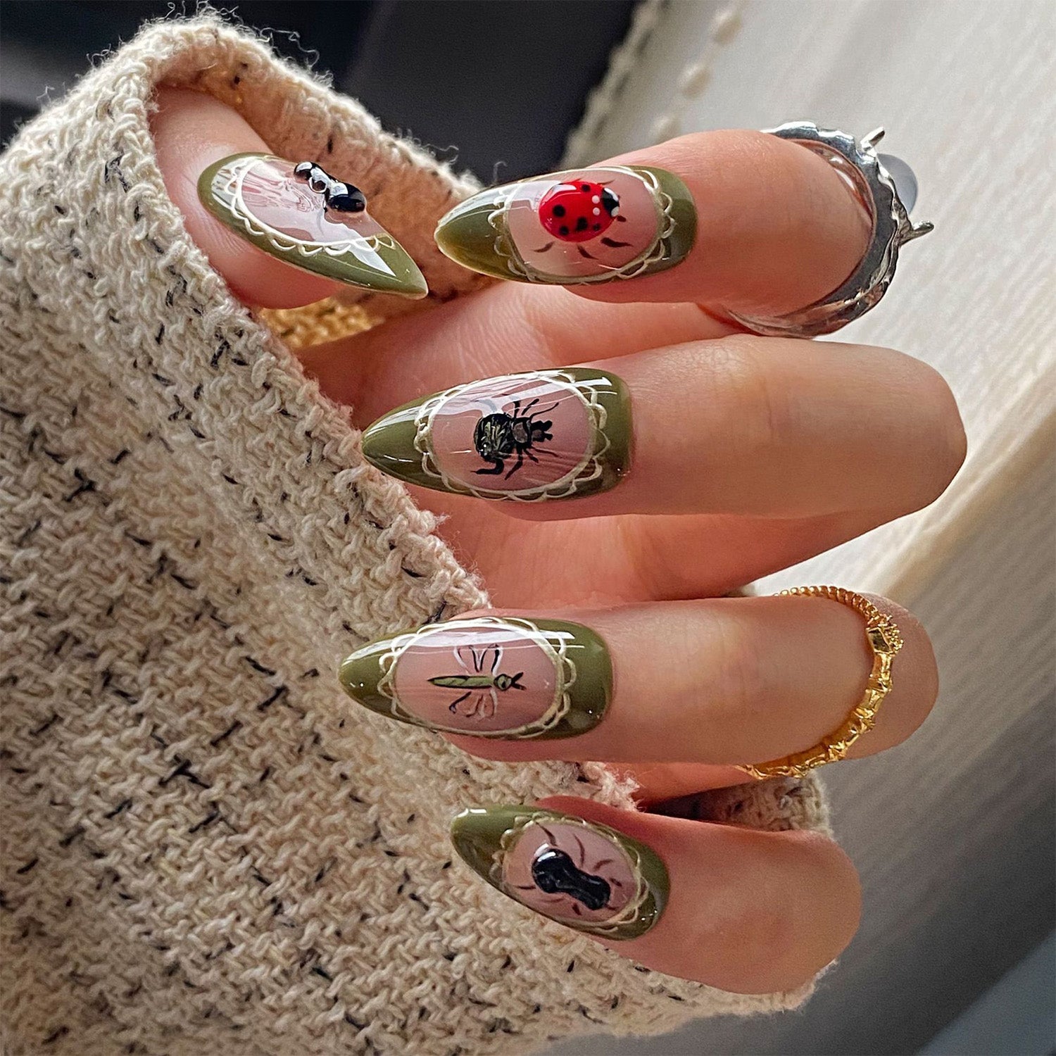 These nails capture the secret, buzzing life of a hidden garden with whimsical charm. Earthy tones and delicate insect portraits create the feel of miniature artworks discovered on a nature walk.
