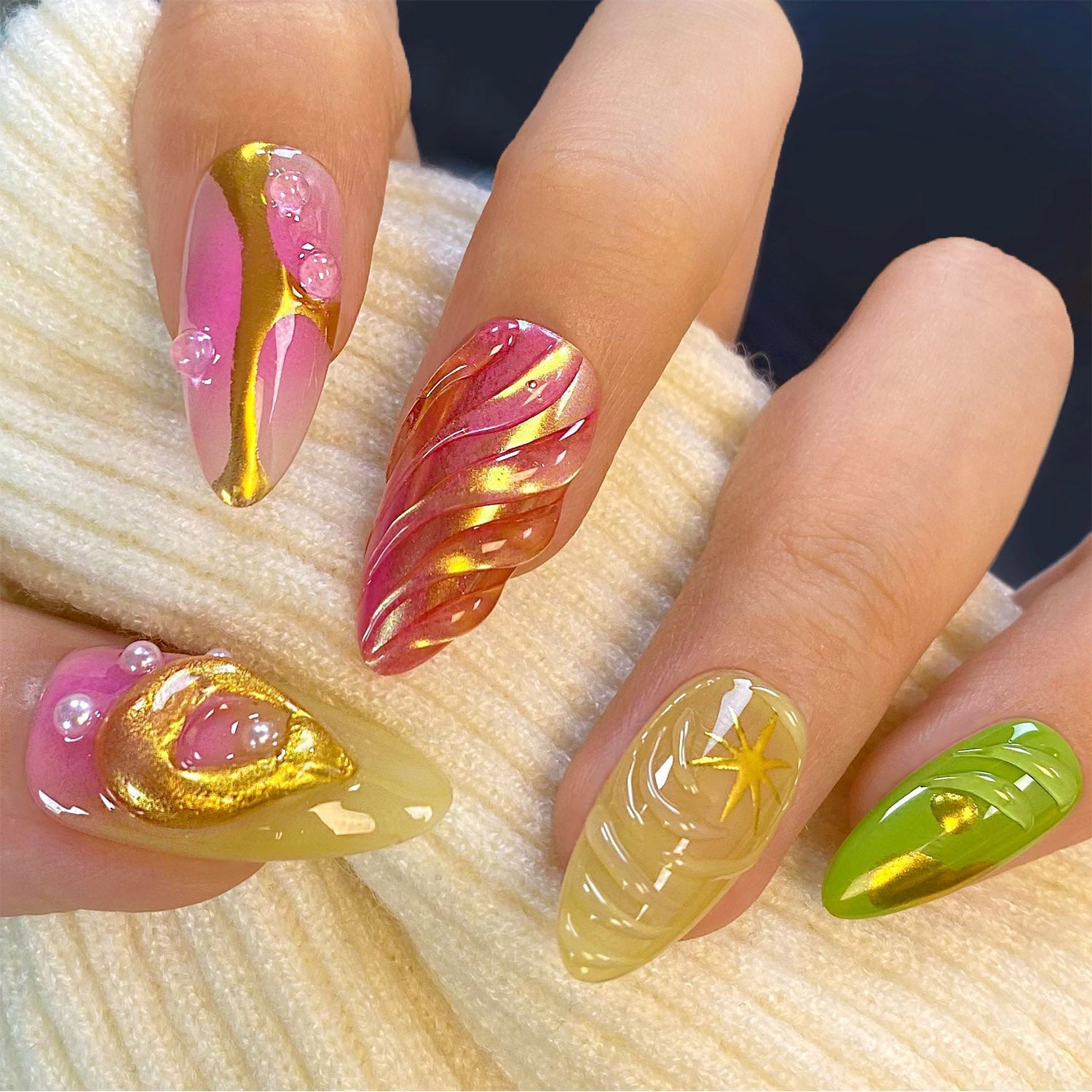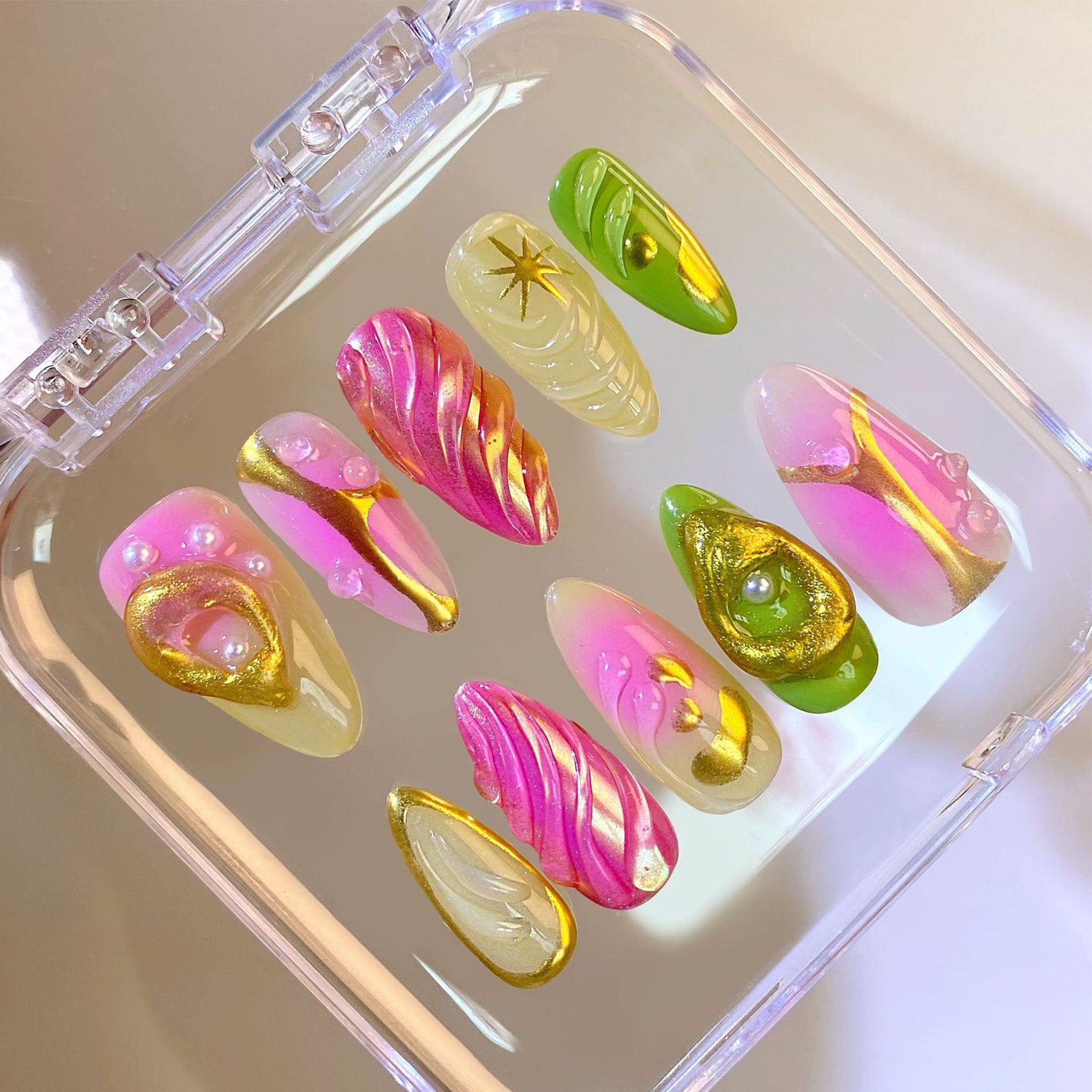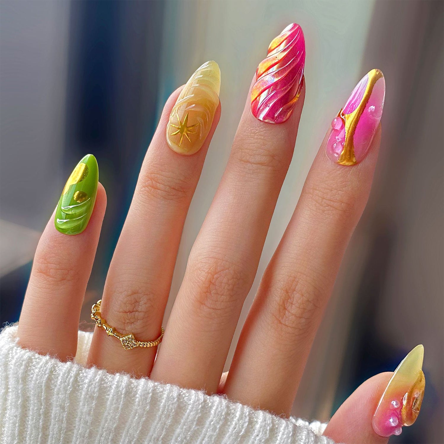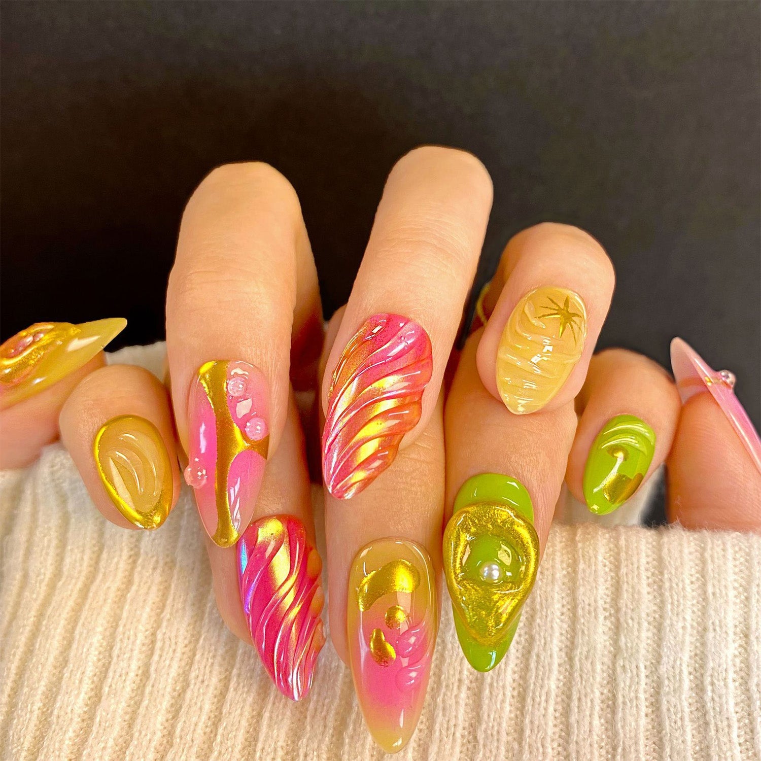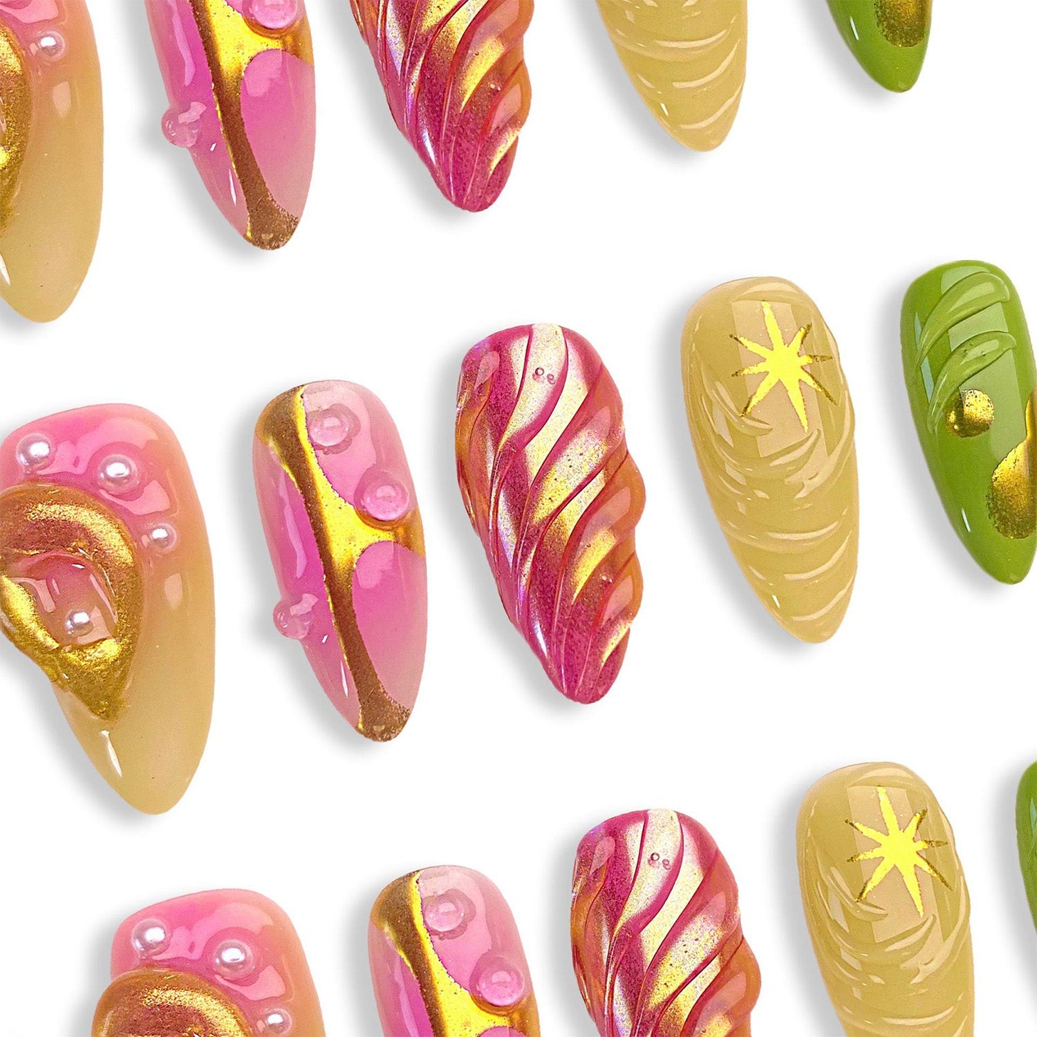 Each nail captures a surreal sunset, with liquid gold dripping over luminous pink and yellow skies. The design reflects a dynamic dance of light, echoing the fleeting beauty of twilight.