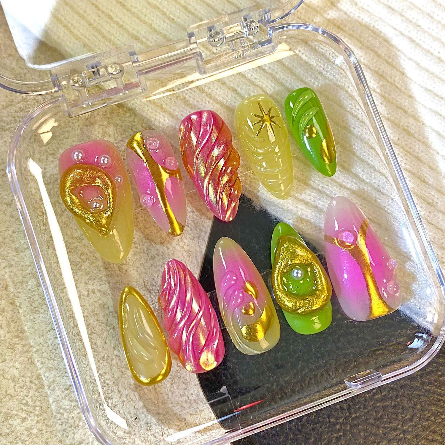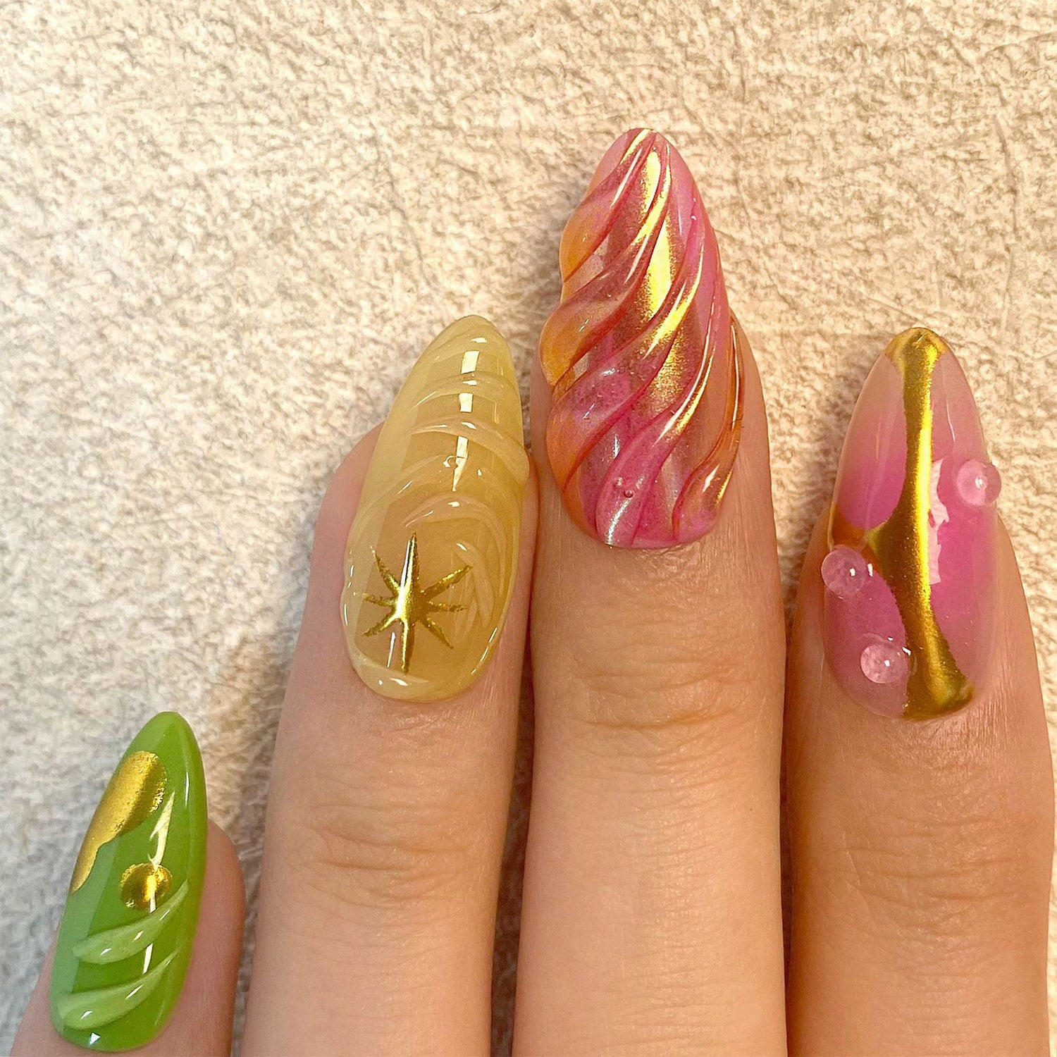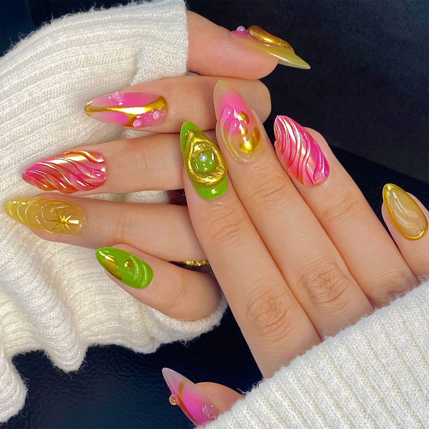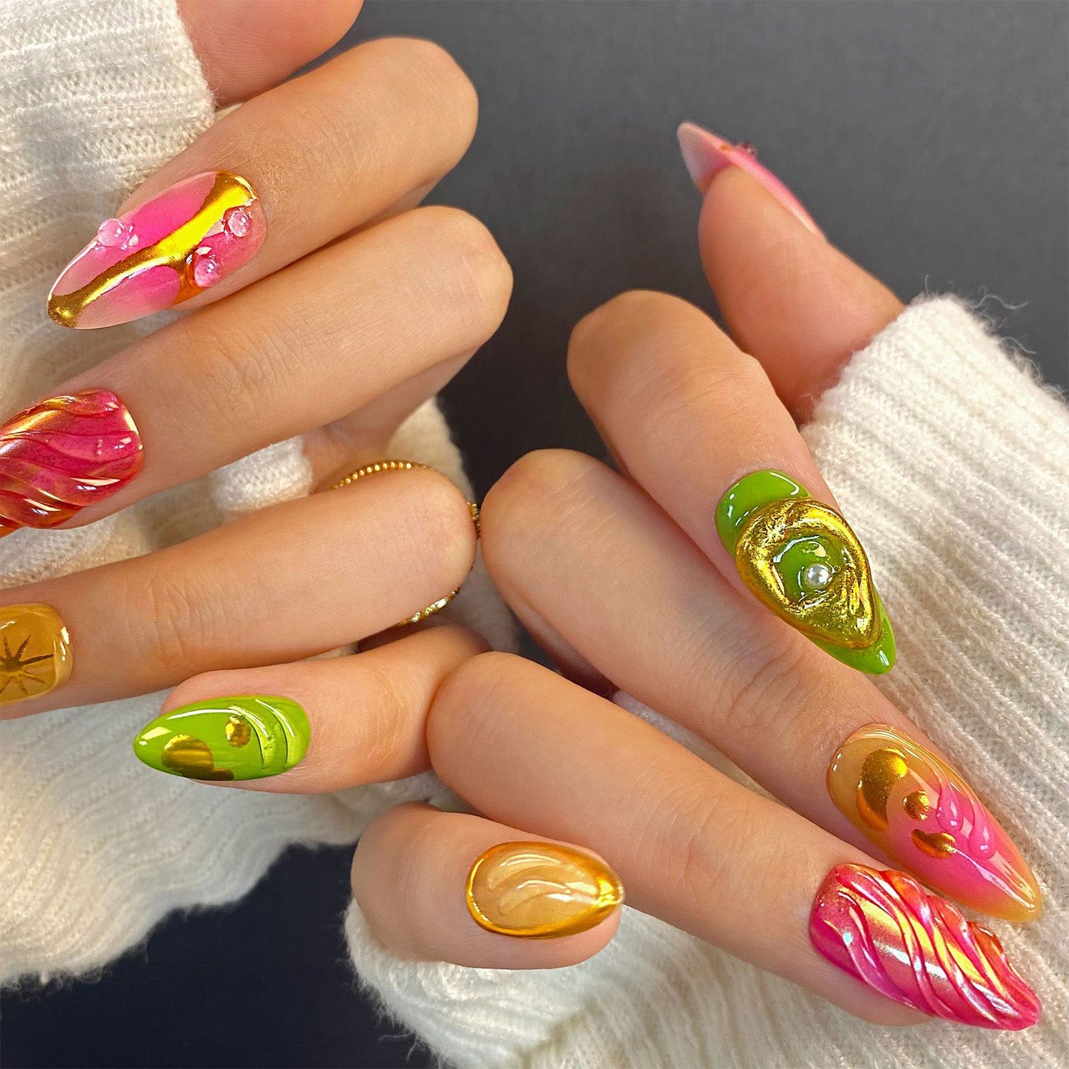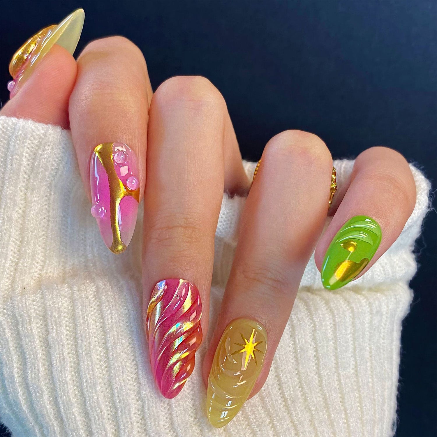 Each nail captures a surreal sunset, with liquid gold dripping over luminous pink and yellow skies. The design reflects a dynamic dance of light, echoing the fleeting beauty of twilight.