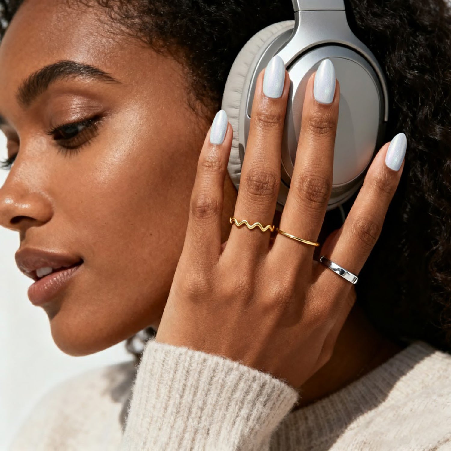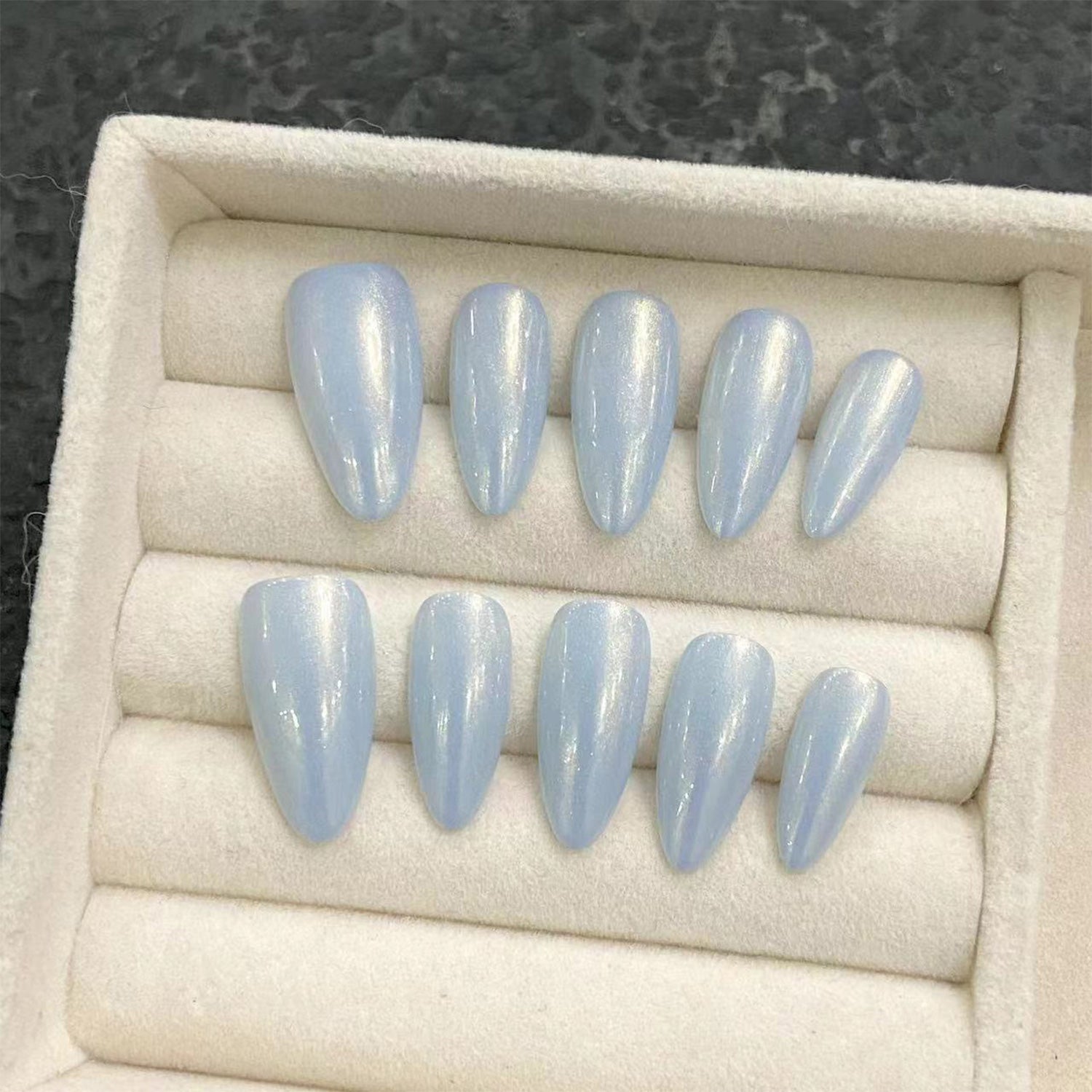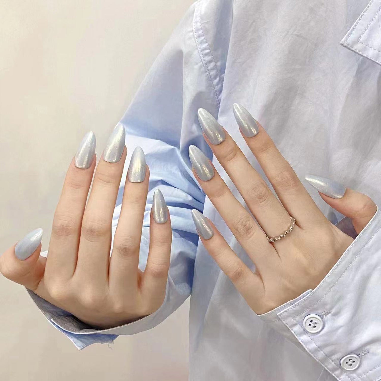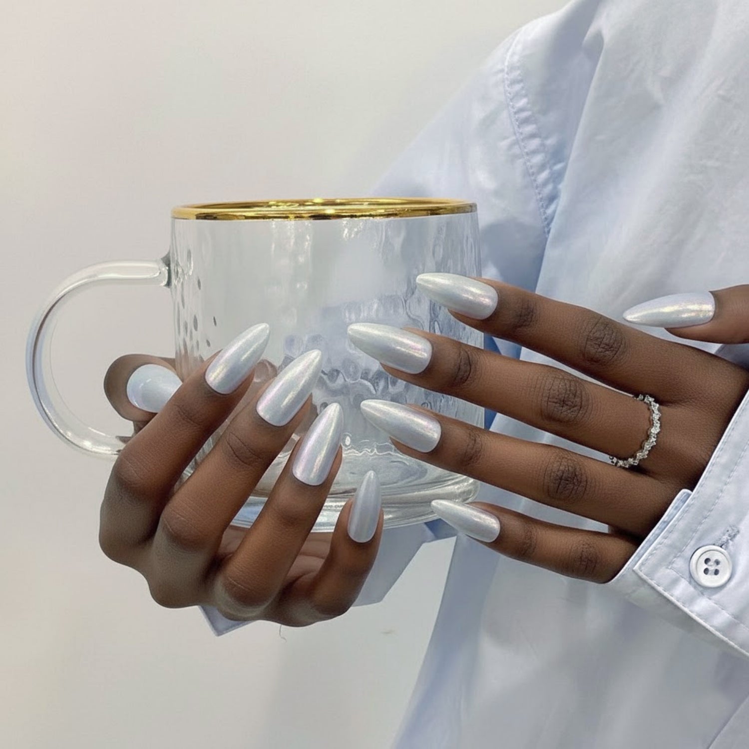 This mesmerizing manicure features sharp almond nails coated in luminous pearlescent chrome. An iridescent sheen adds a captivating, icy effect.