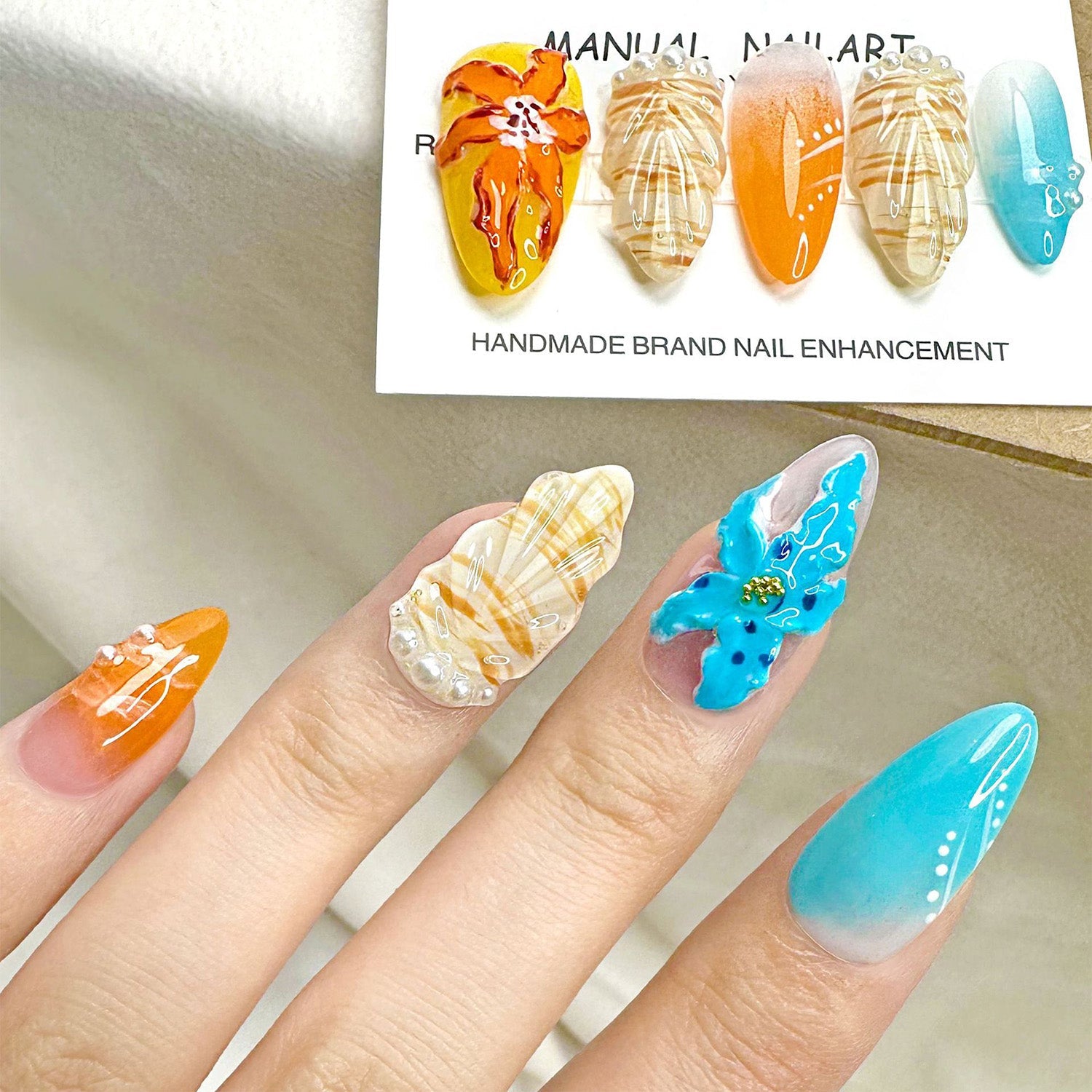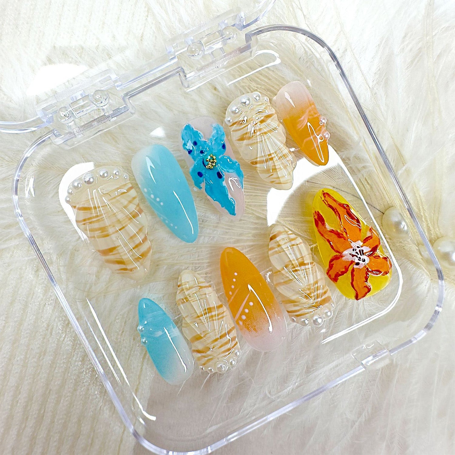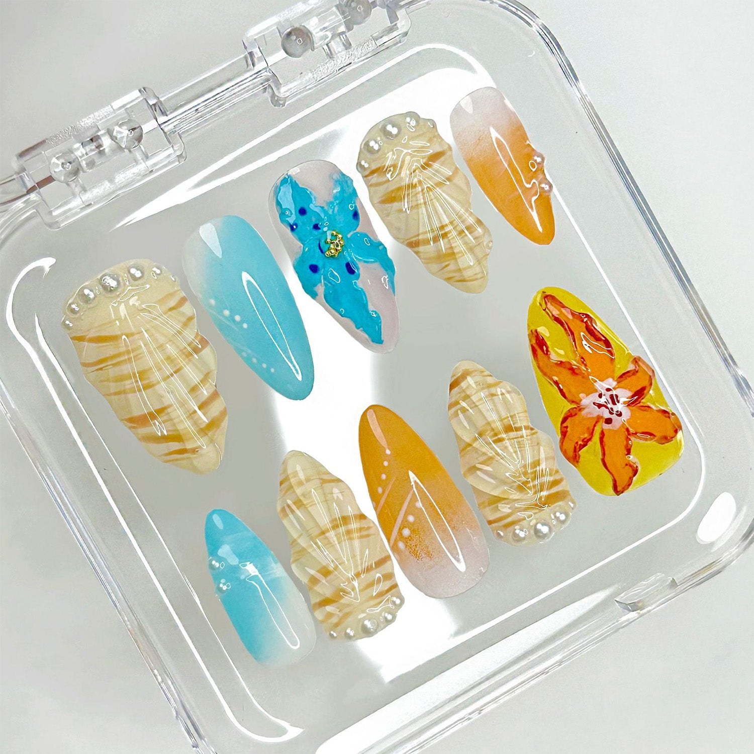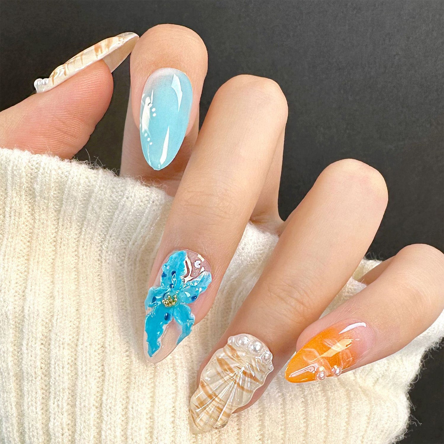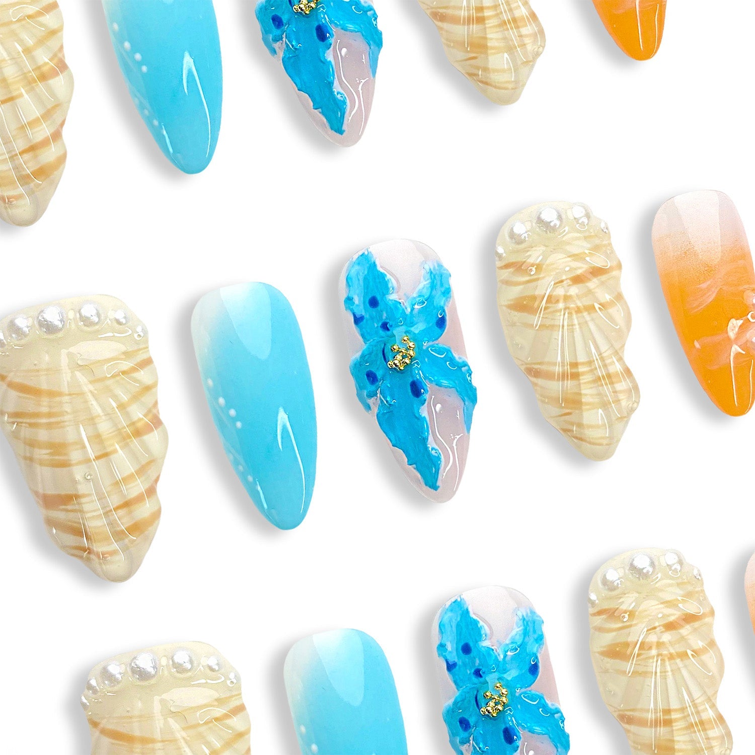 Each nail features sea-worn textures and pearlescent shimmer, creating a delicate, ocean-inspired look. Tranquil blues and warm sandy tones blend to evoke the calm of the shore.