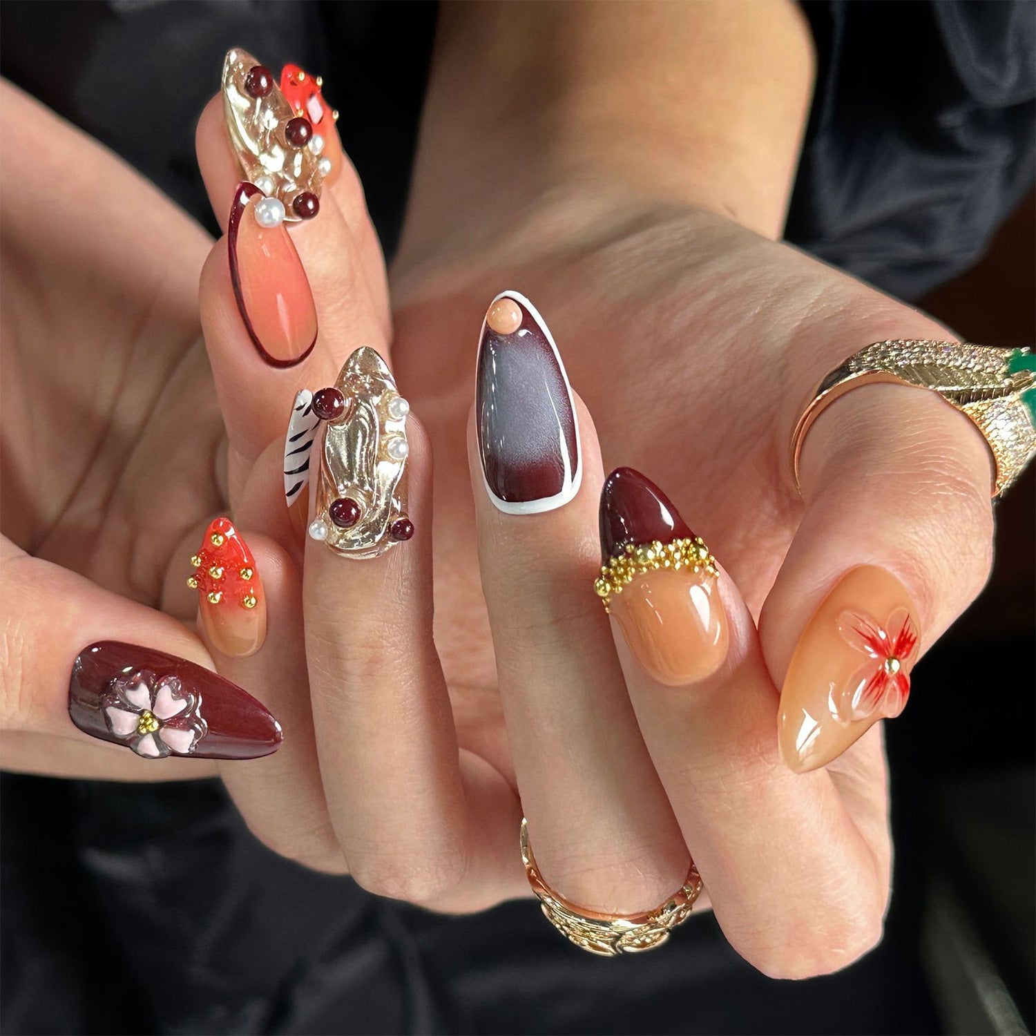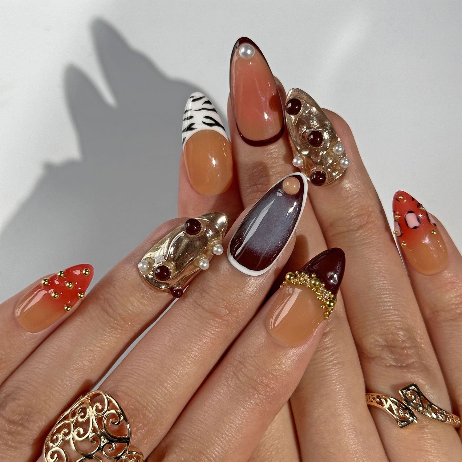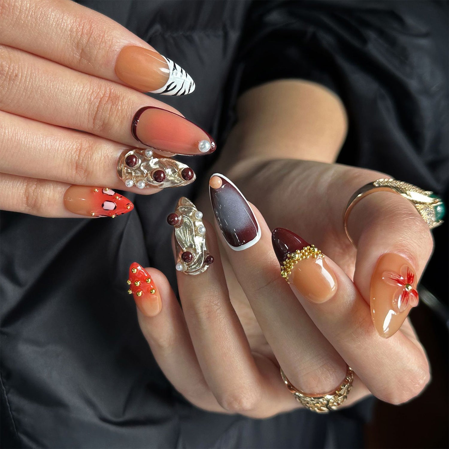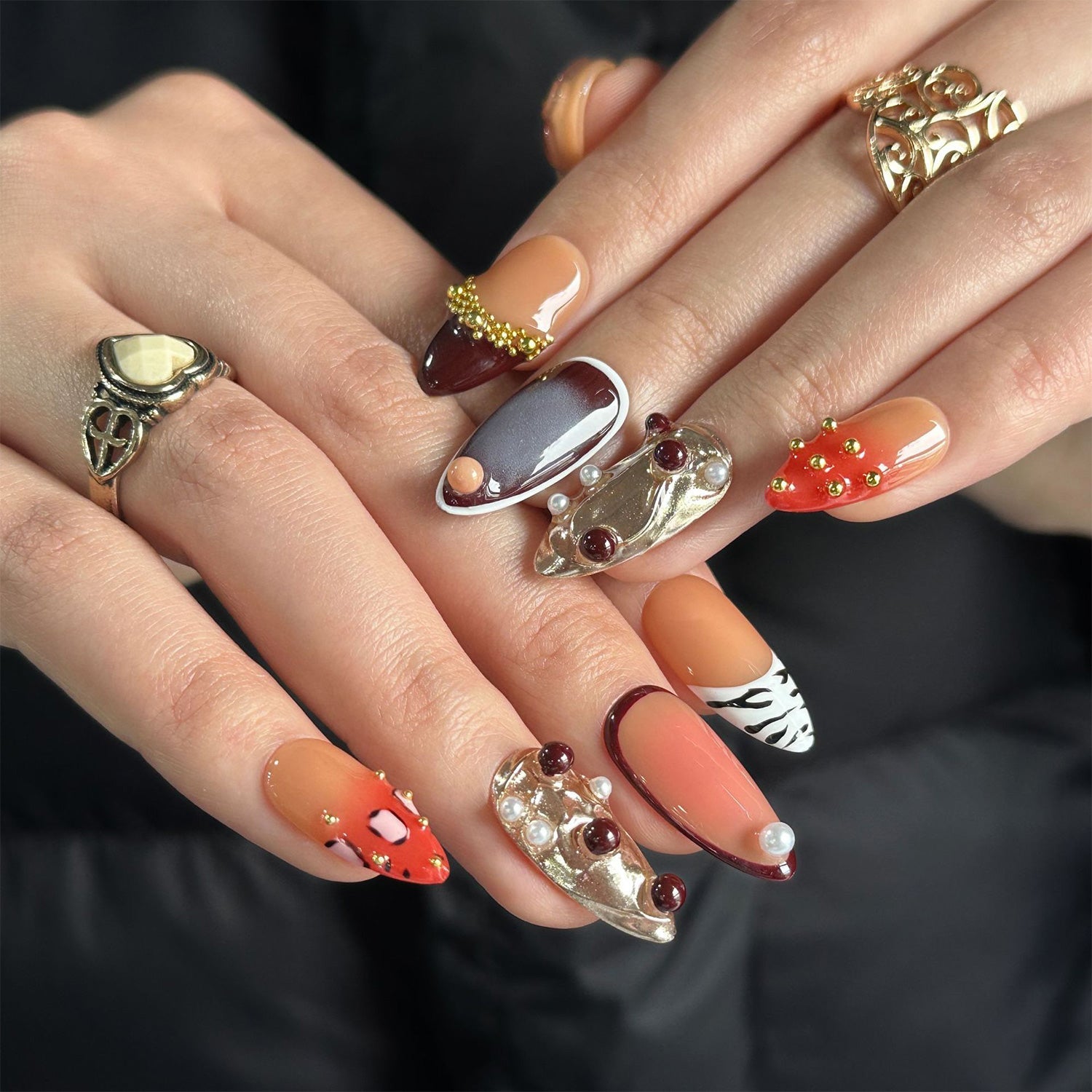 These nails blend deep earth tones with intricate organic shapes and gold accents. The design creates an eclectic harmony of textures and colors, celebrating the rich journey of a shared life.