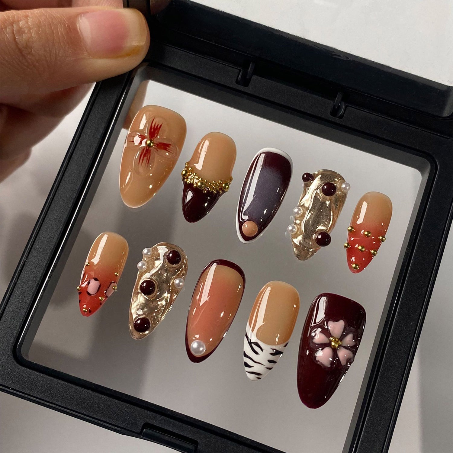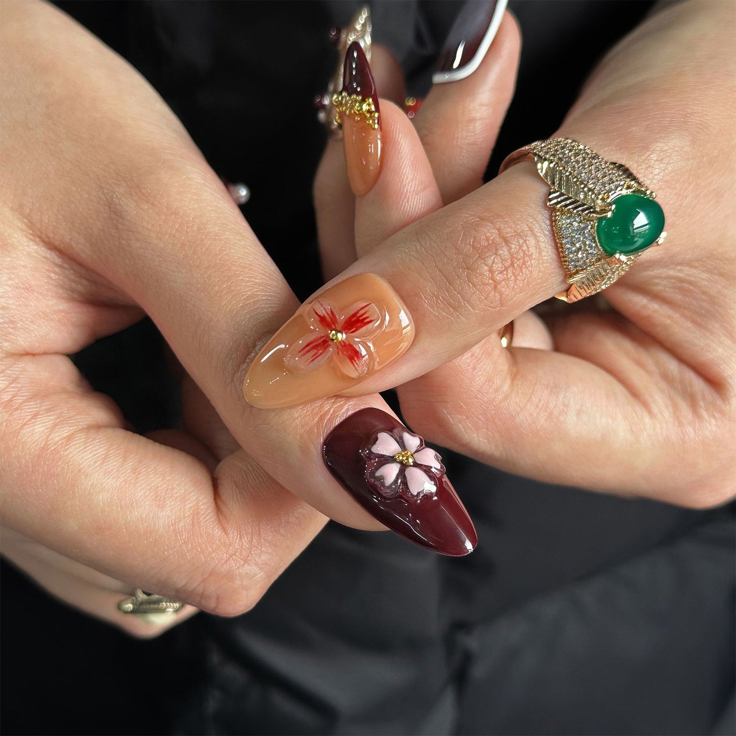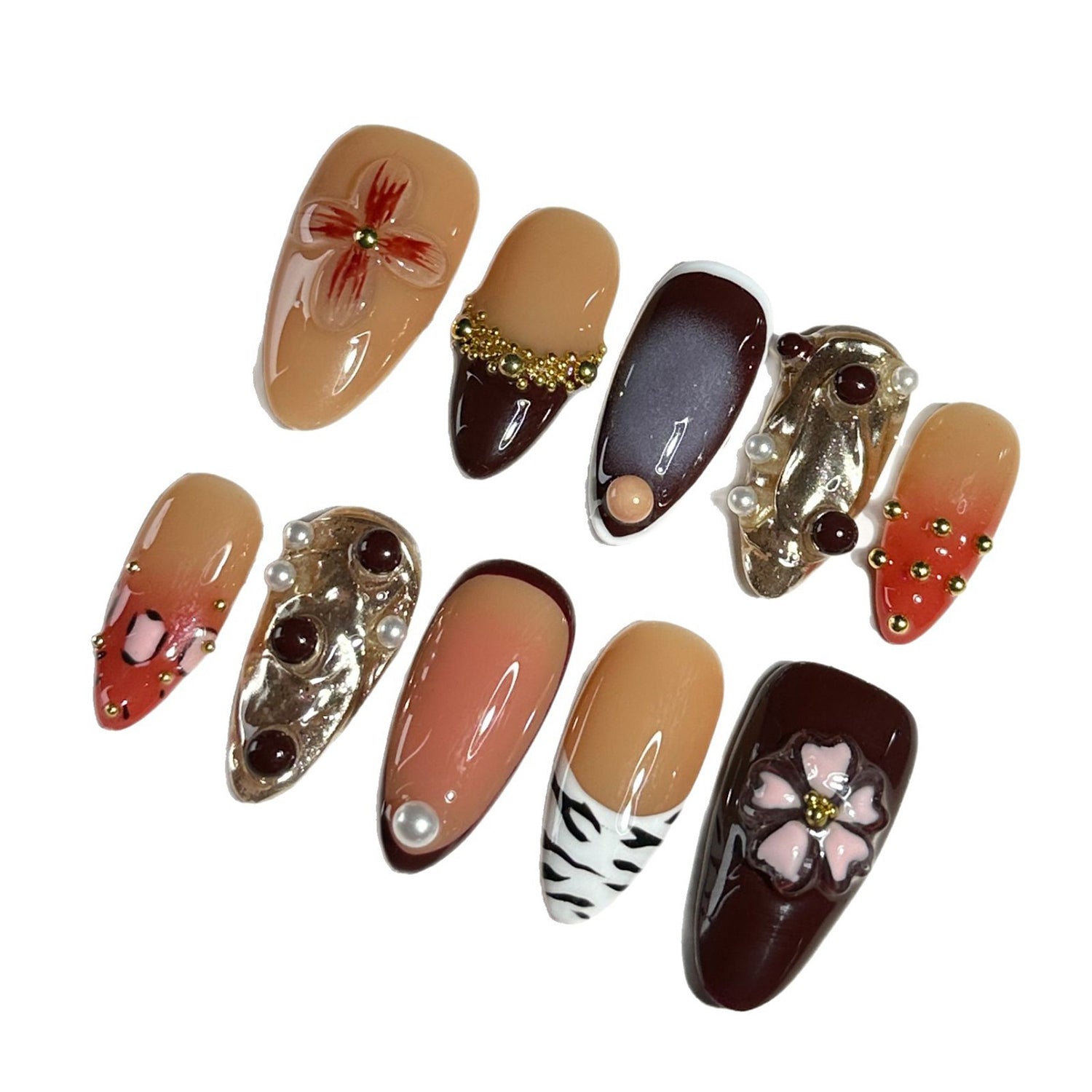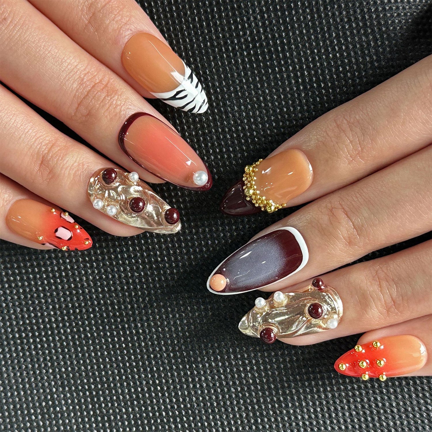 These nails blend deep earth tones with intricate organic shapes and gold accents. The design creates an eclectic harmony of textures and colors, celebrating the rich journey of a shared life.