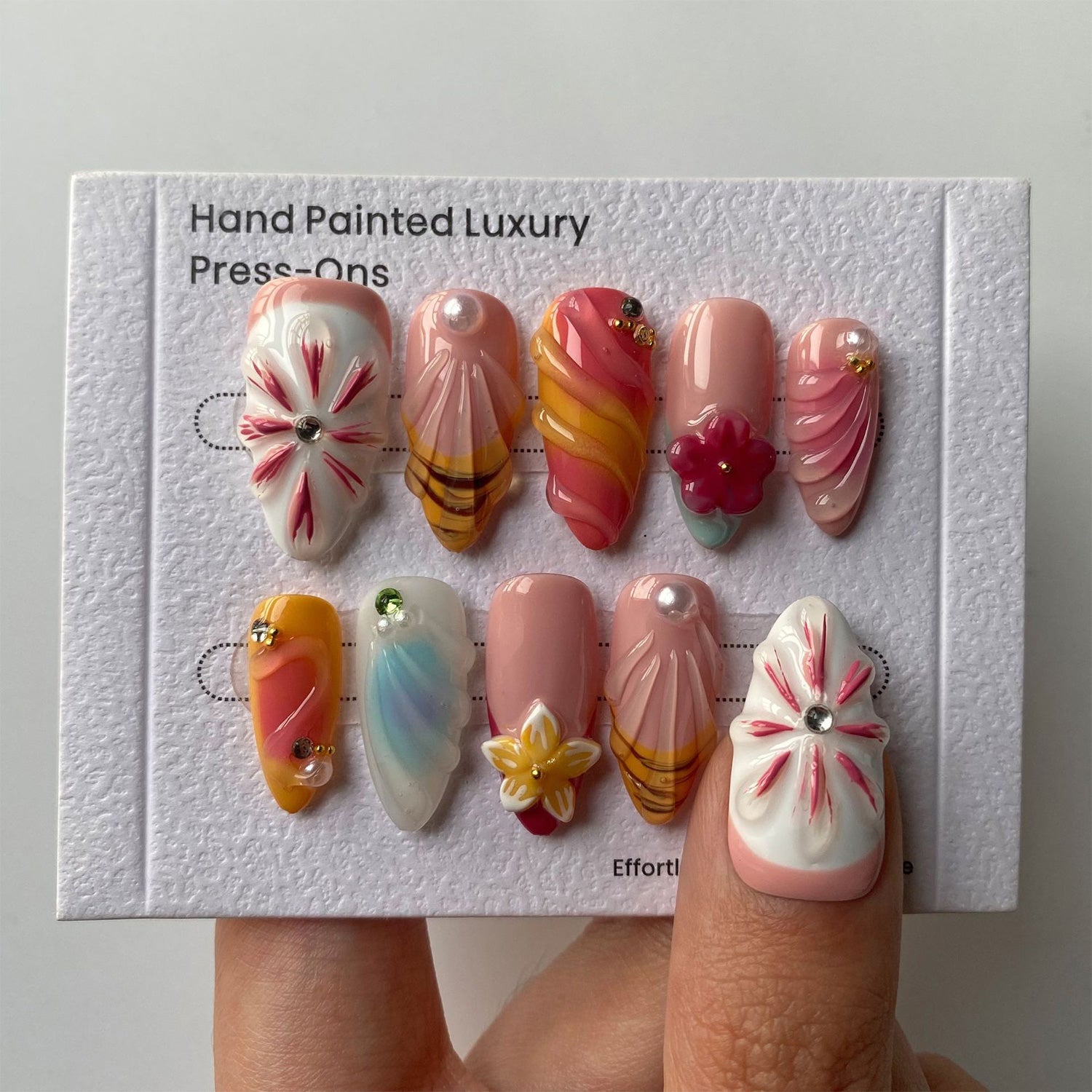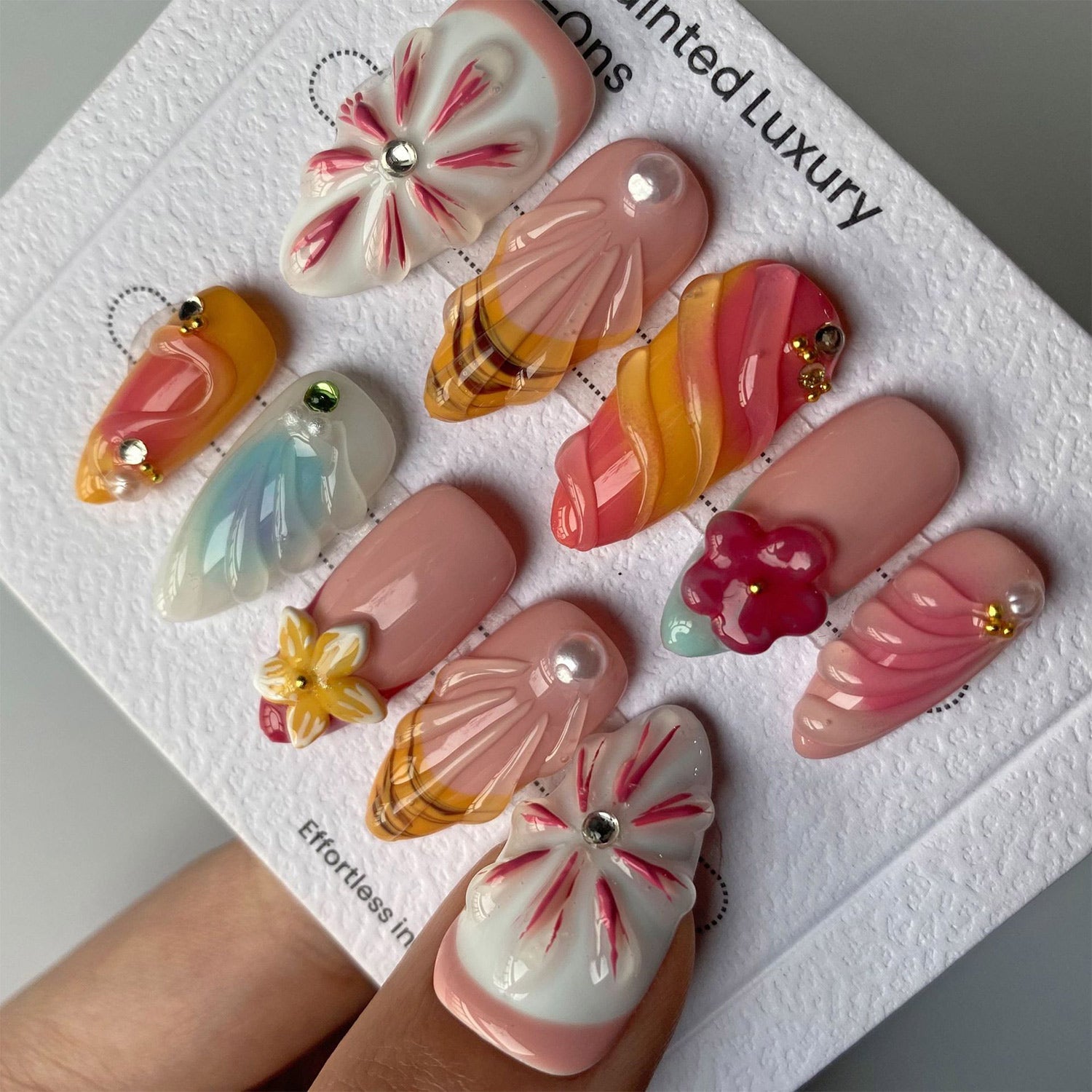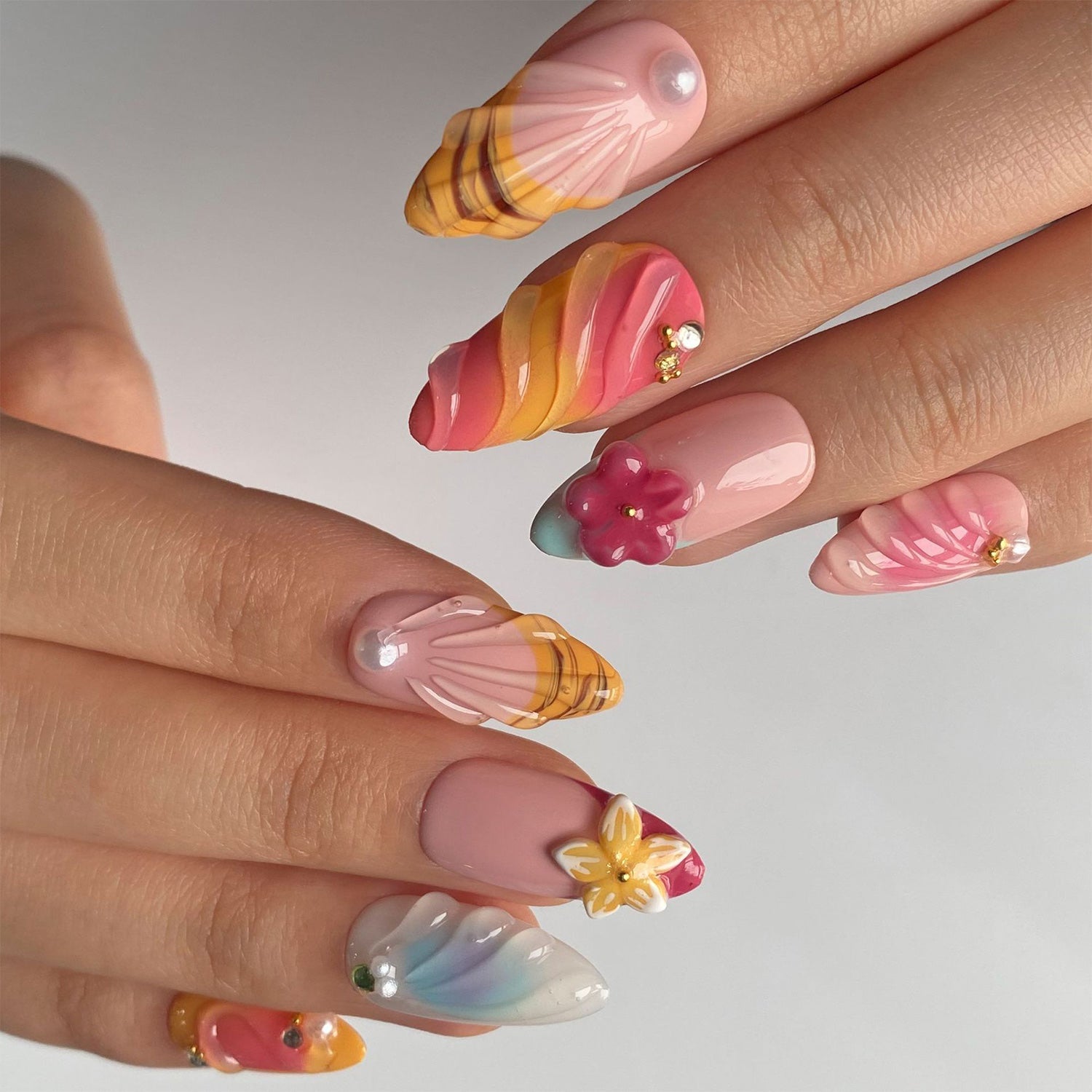 These nails tell the story of the shore’s gentle magic, from iridescent shells to soft, colorful flowers. The design celebrates a serene escape, where two hearts move in peaceful harmony.