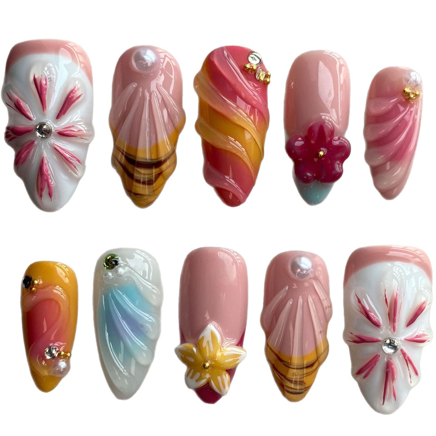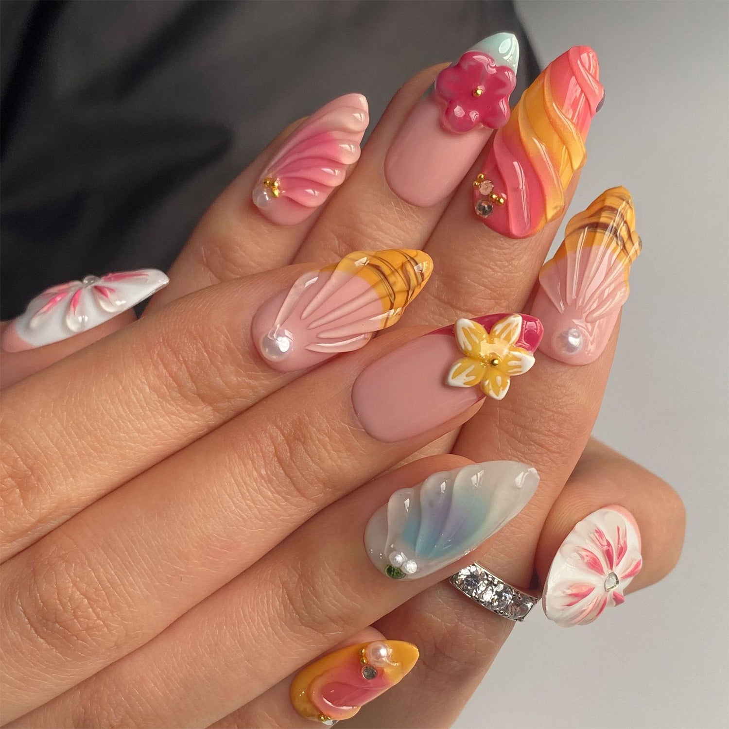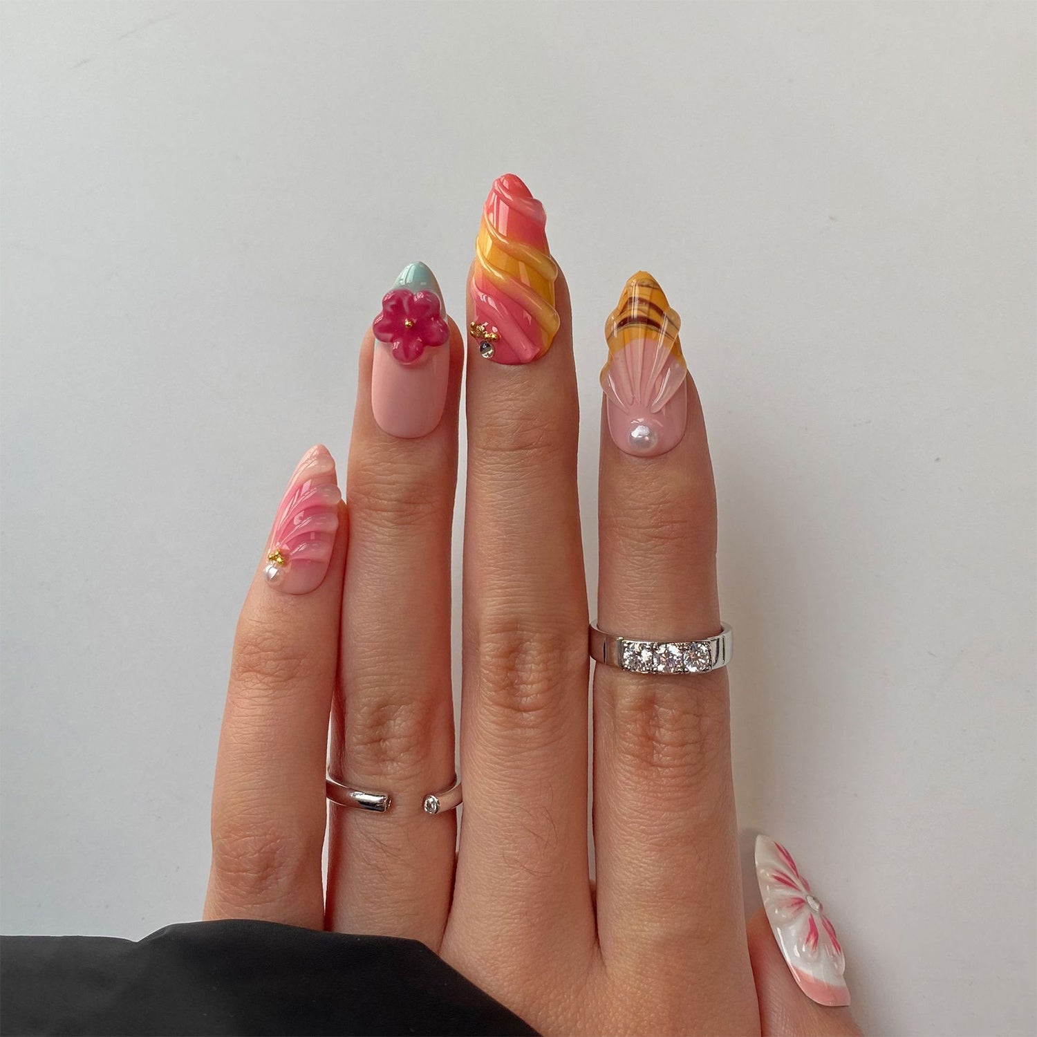 These nails tell the story of the shore’s gentle magic, from iridescent shells to soft, colorful flowers. The design celebrates a serene escape, where two hearts move in peaceful harmony.