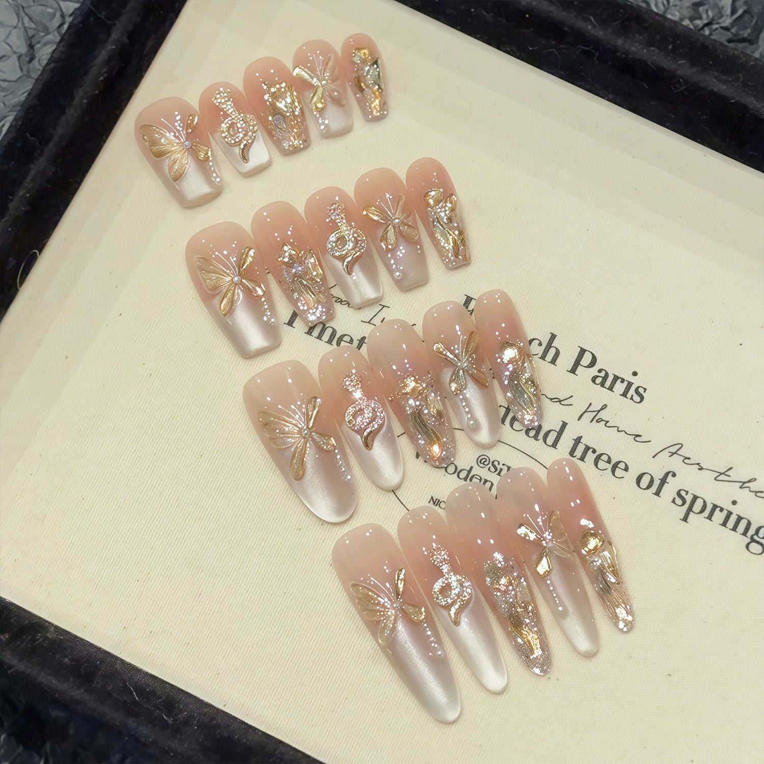 This opulent design combines shimmering gold foil with sculpted accents, creating a striking, high-fashion nail statement.