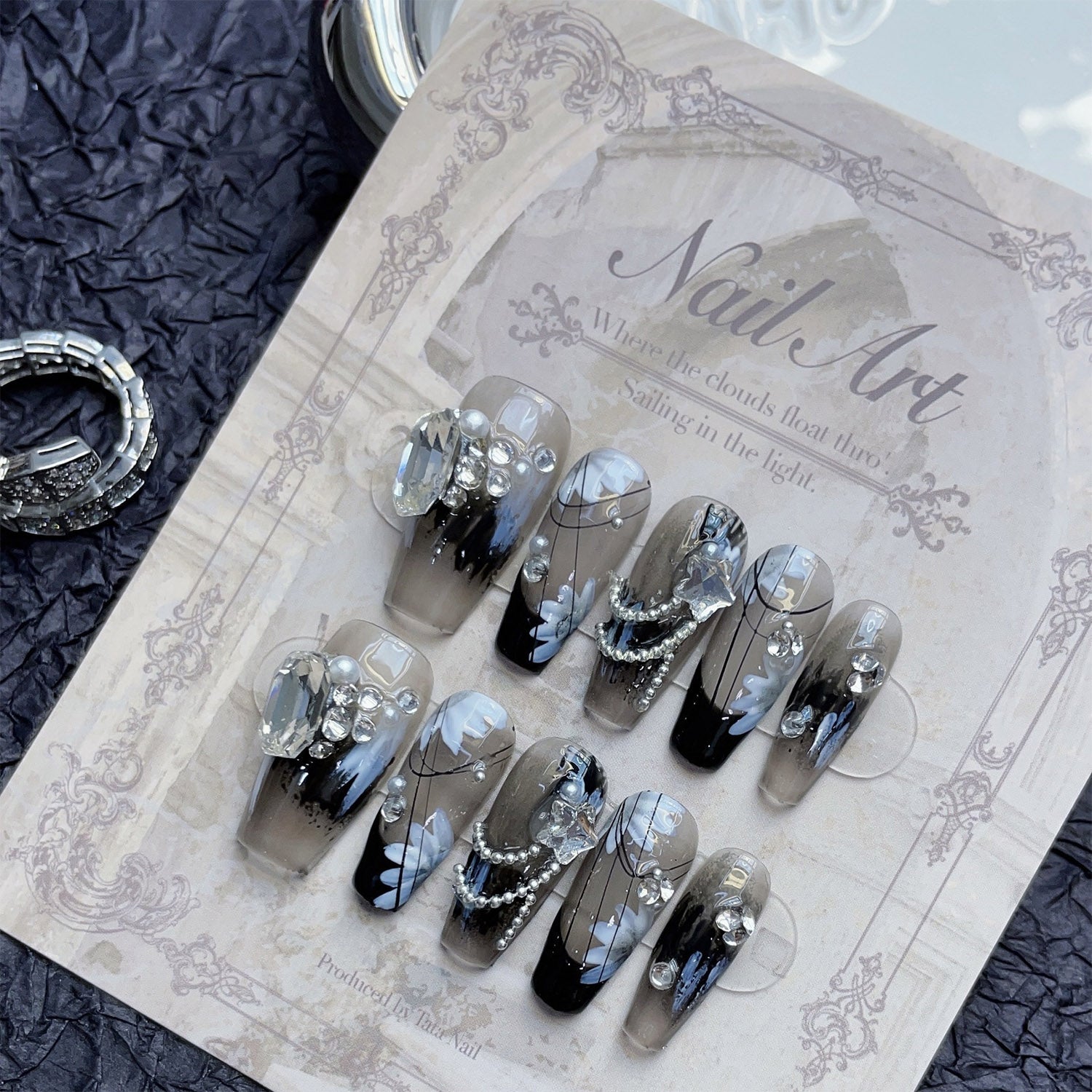 This set has a dark and sophisticated palette, blending a glossy black with a soft gray and white ombré. The chunky, detailed silver charms give this look a powerful, dramatic aesthetic.