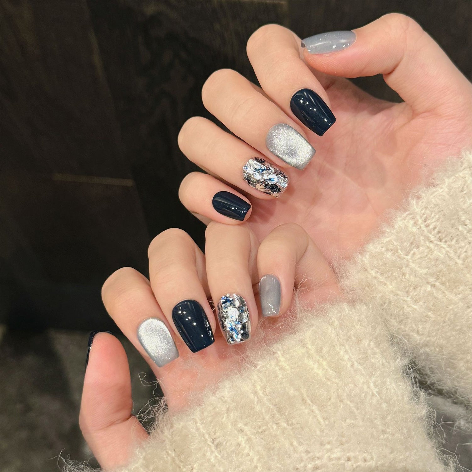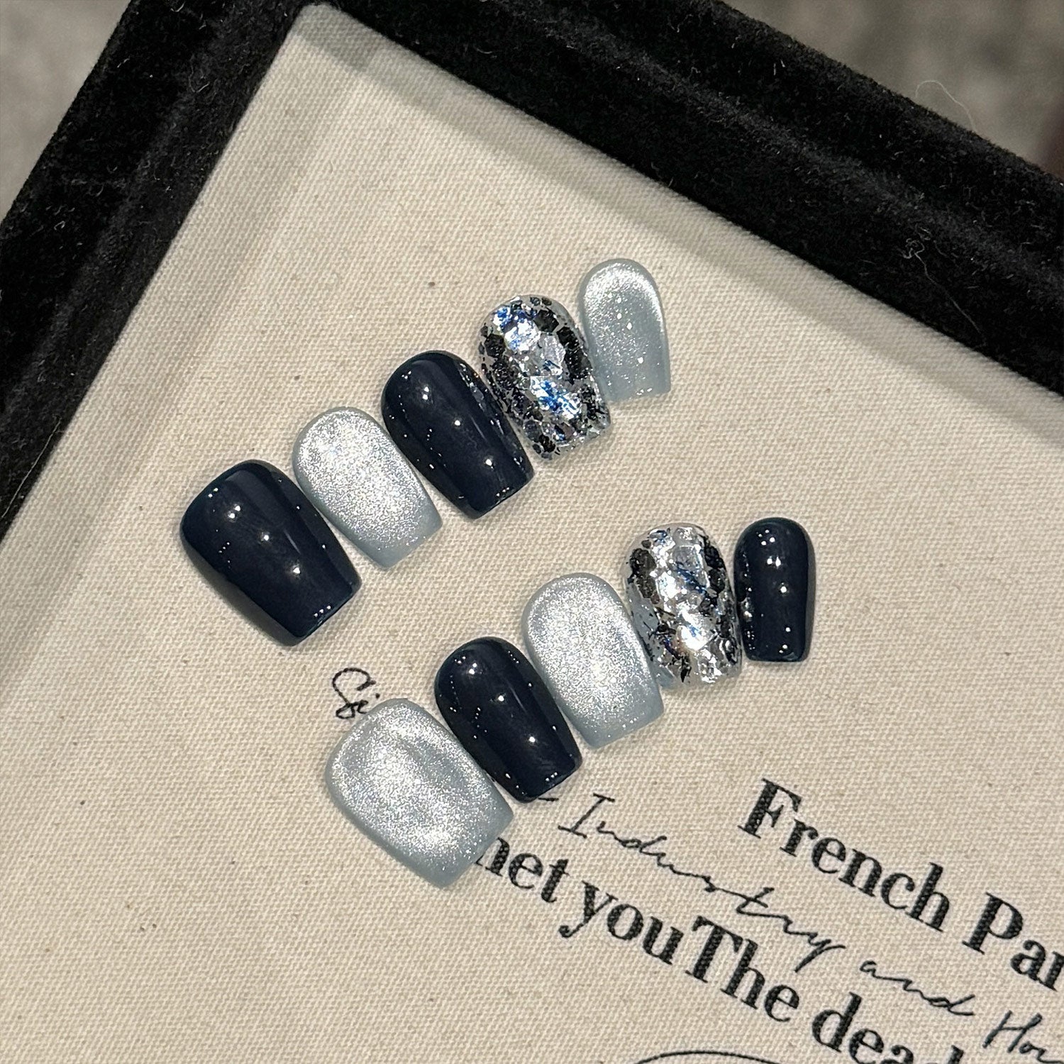 A striking mix of glossy midnight black and metallic silver shimmer. This design embodies both mystery and brilliance. Perfect for nights out or special occasions.