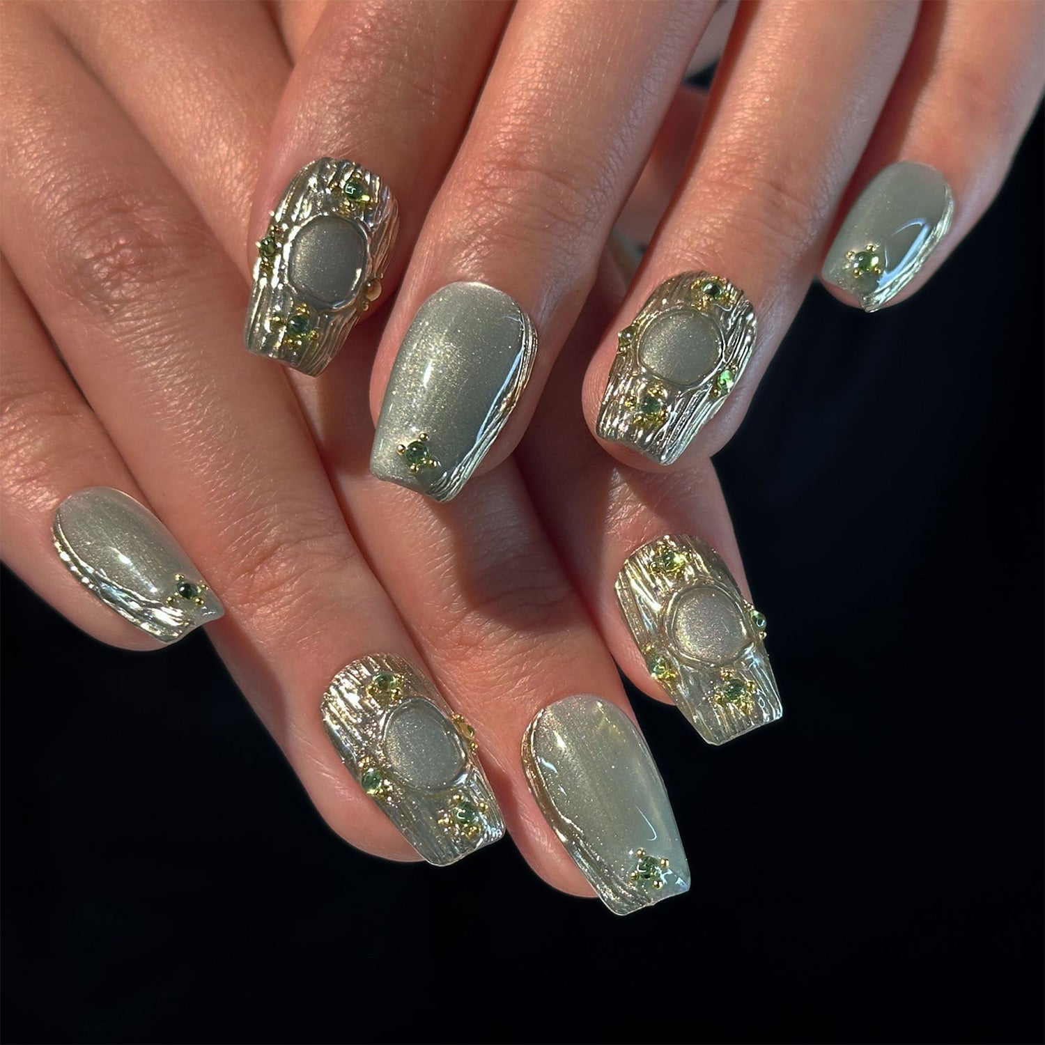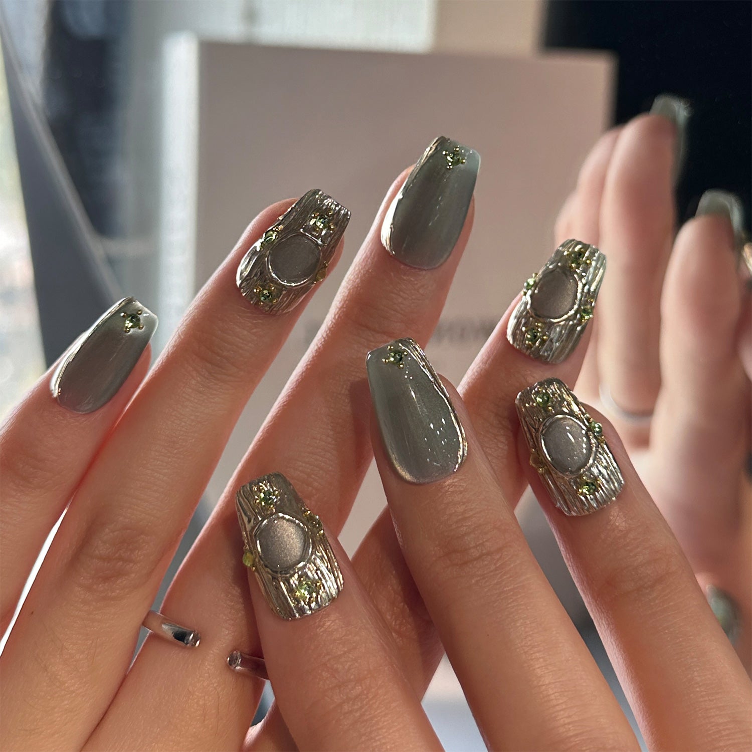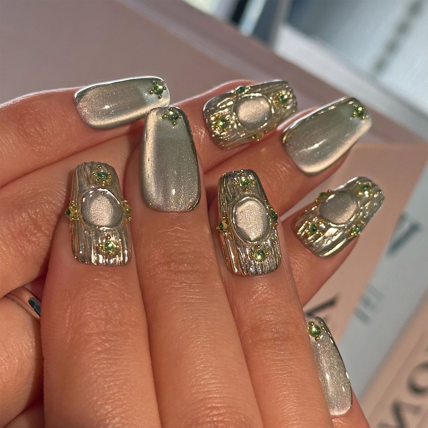 These nails combine the quiet strength of textured silver tones with the subtle glow of stone. The design reflects a love that is grounded yet refined, blending natural elements with shared elegance.