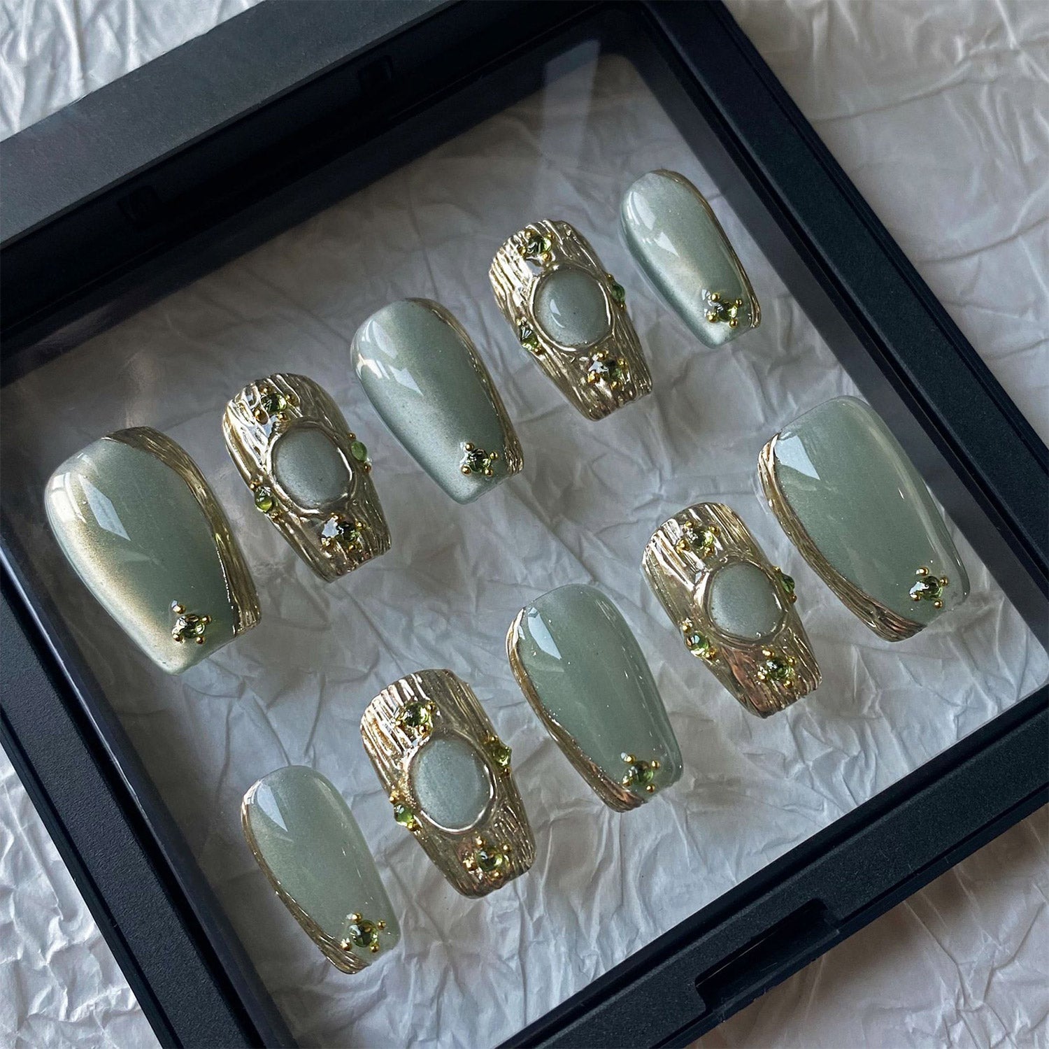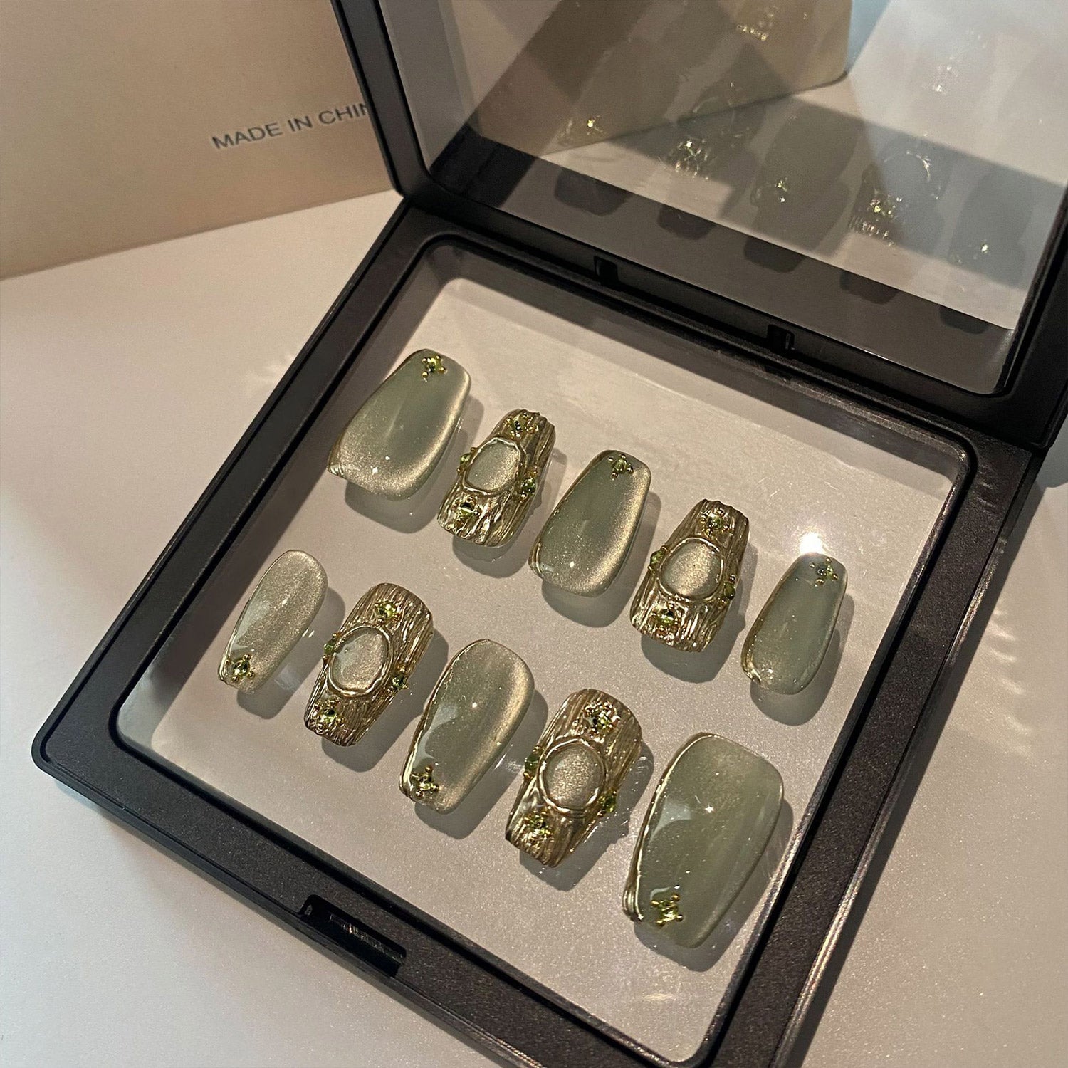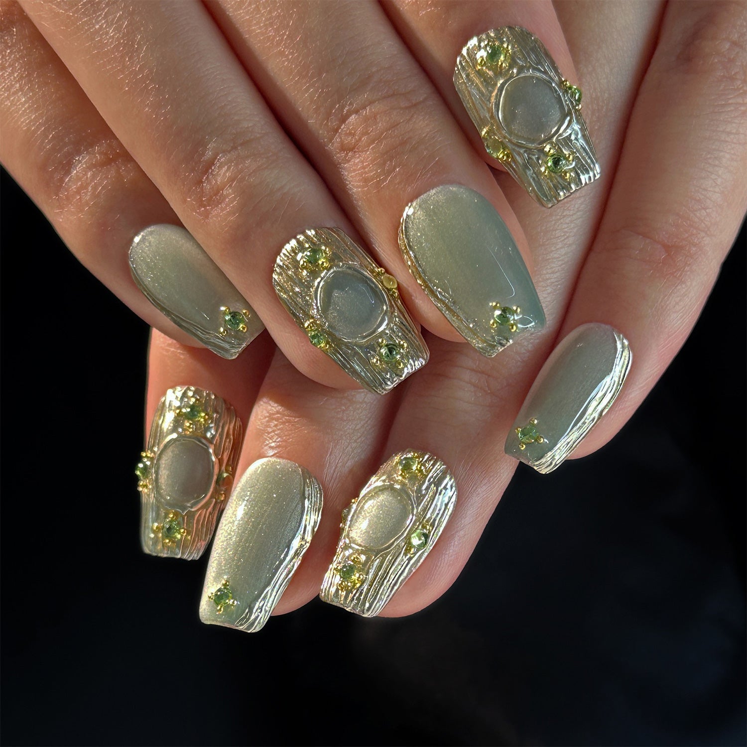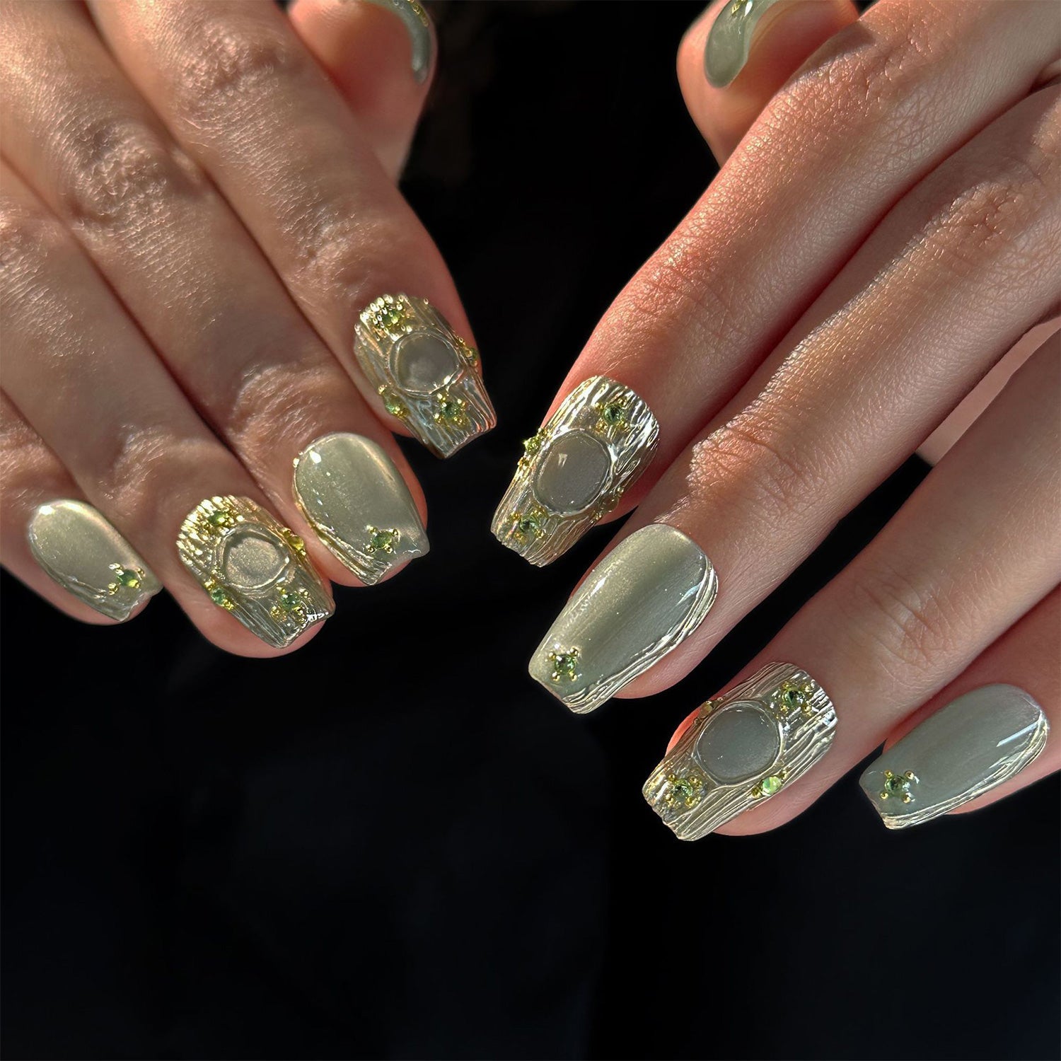 These nails combine the quiet strength of textured silver tones with the subtle glow of stone. The design reflects a love that is grounded yet refined, blending natural elements with shared elegance.