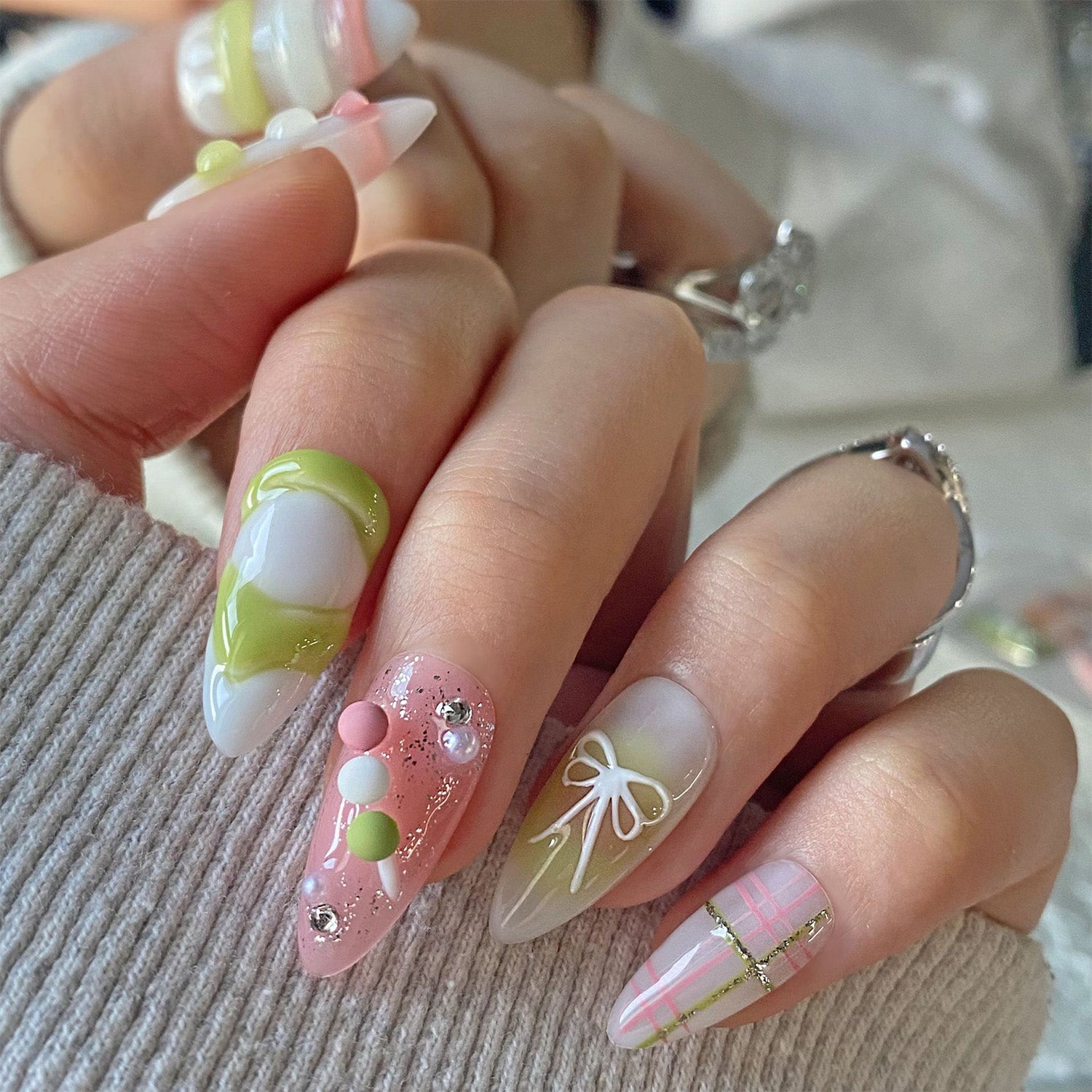 A sweet, whimsical look, these nails feature pastels in pink, white, and lime green with 3D bows, candy spheres, and glossy swirls. The mix of textures and shapes creates a fun, confectionery-inspired style.