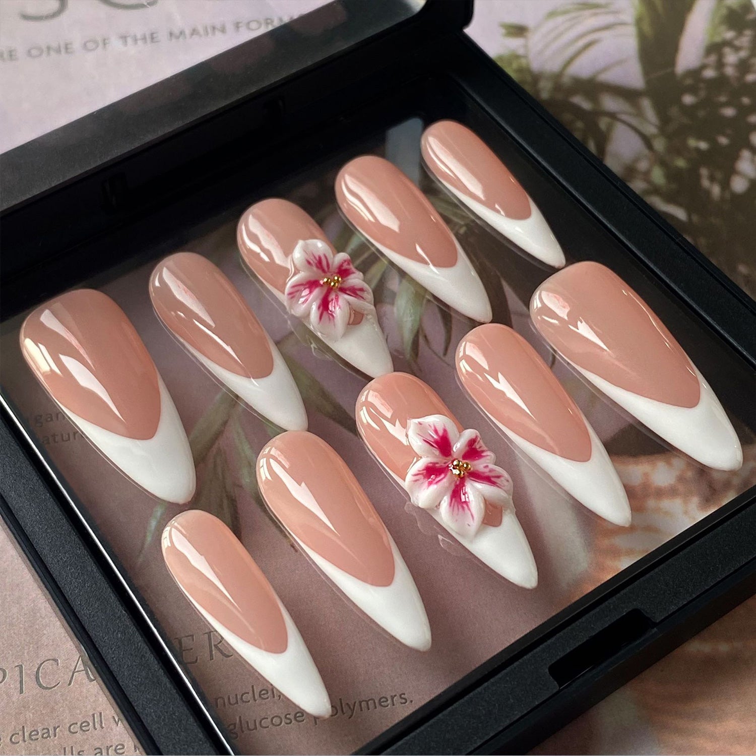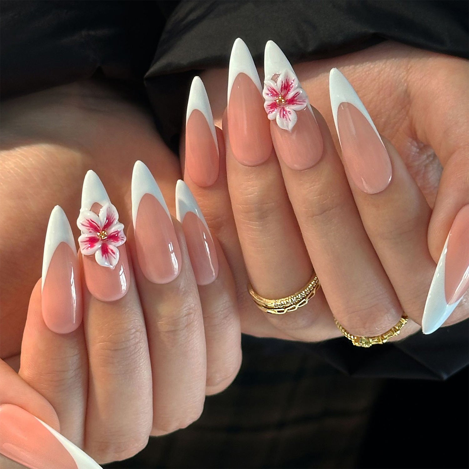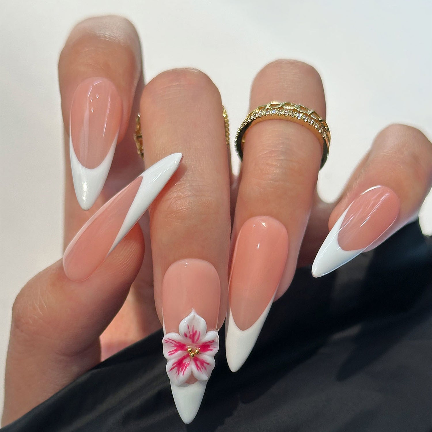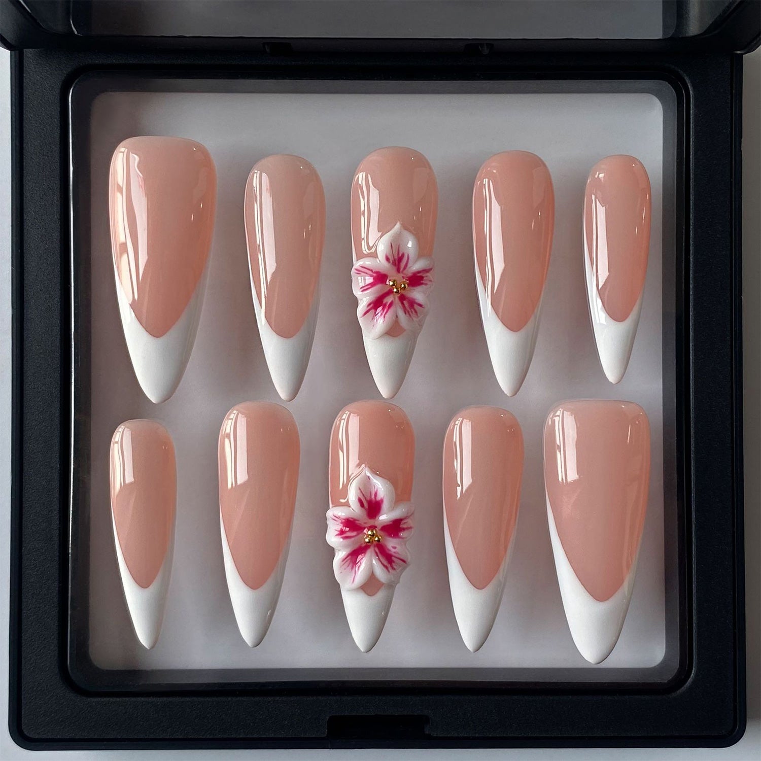 A soft and romantic take on the classic French manicure, with a delicate nude base and a crisp white tip. The beautifully sculpted pink and white flowers add a charming, feminine touch.