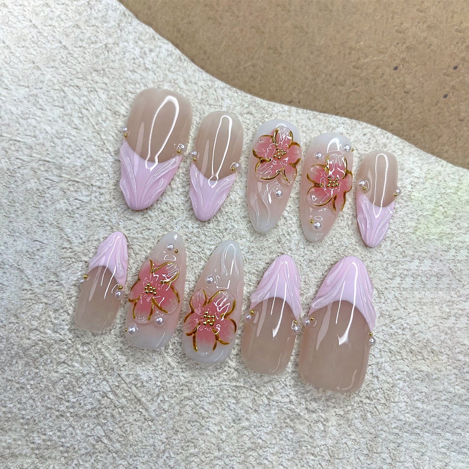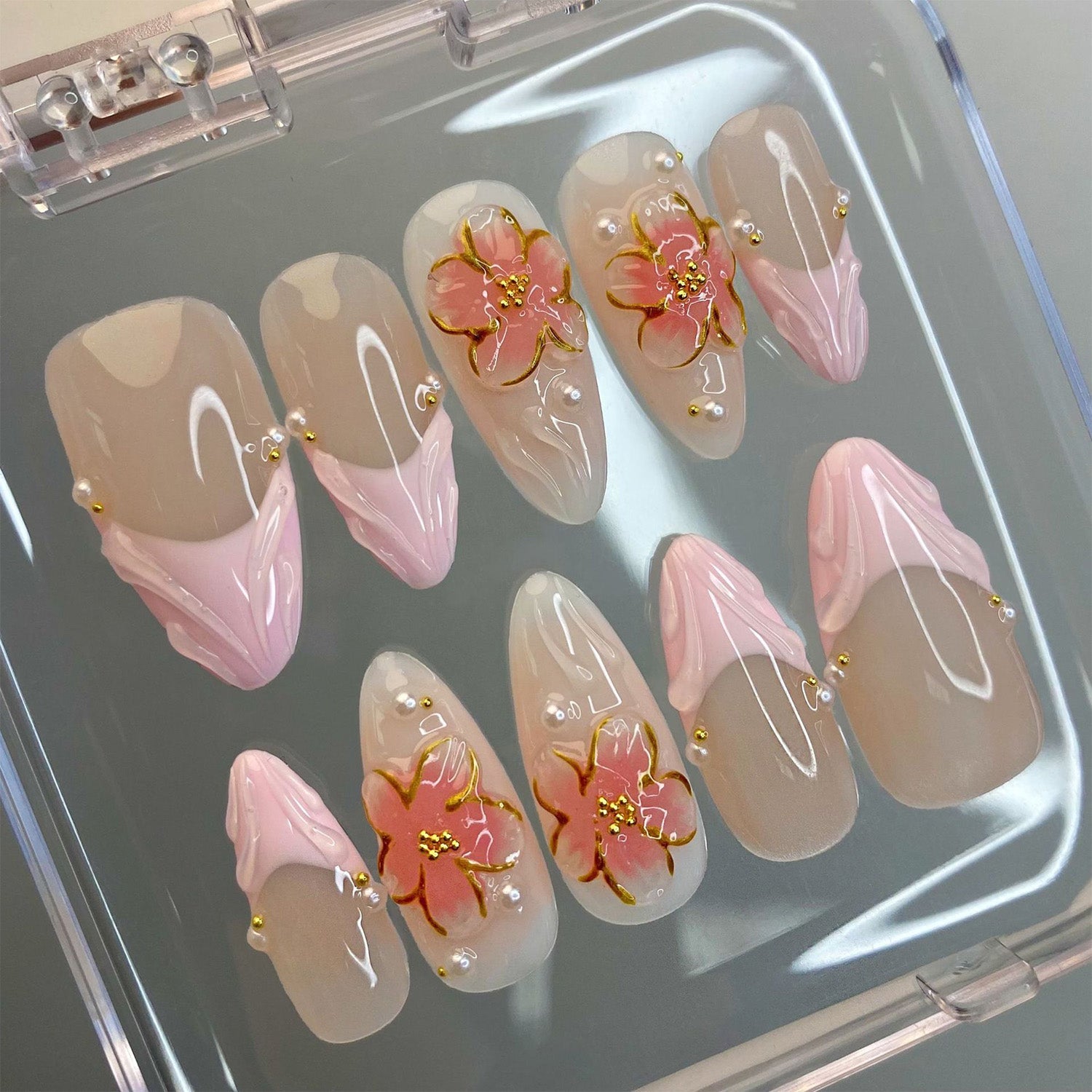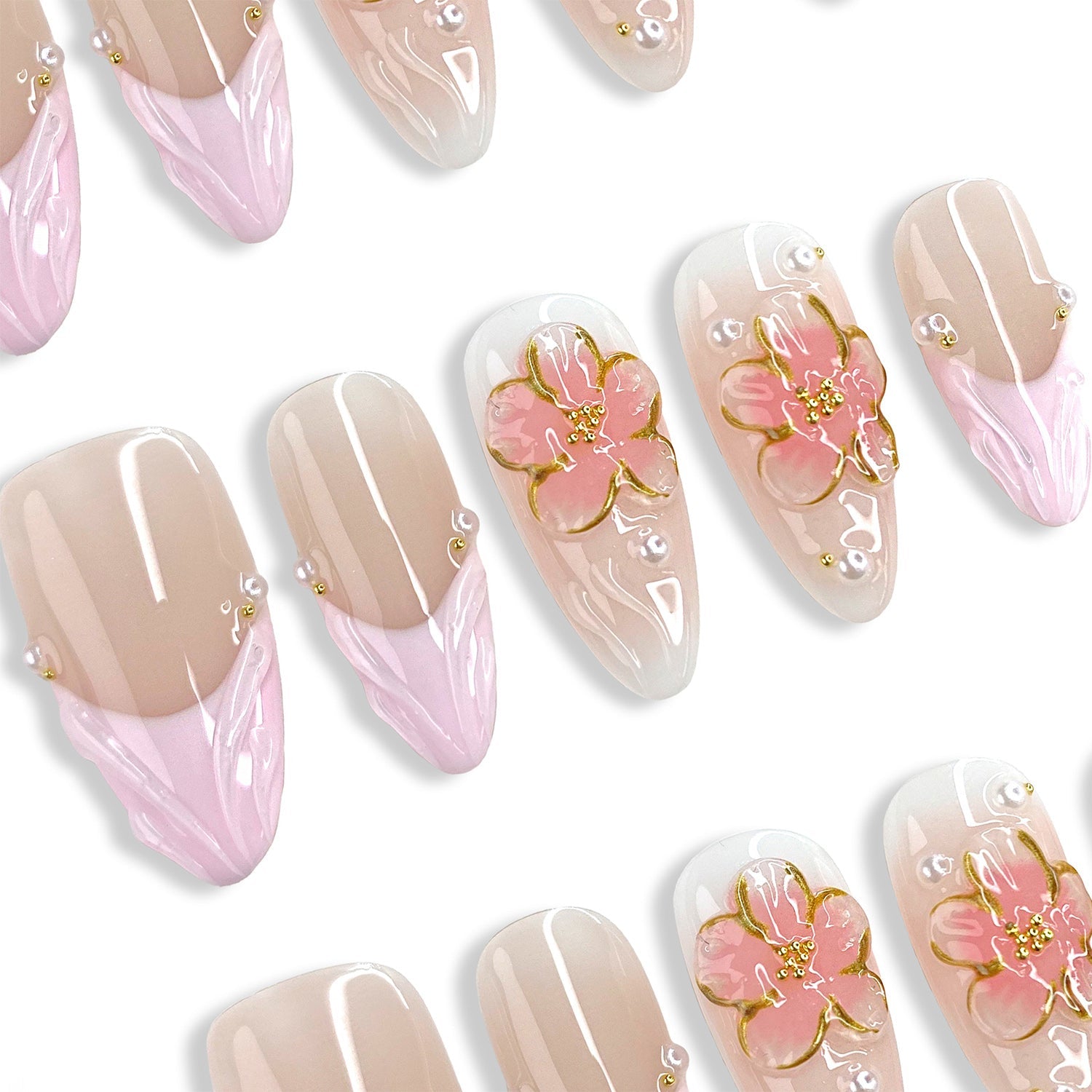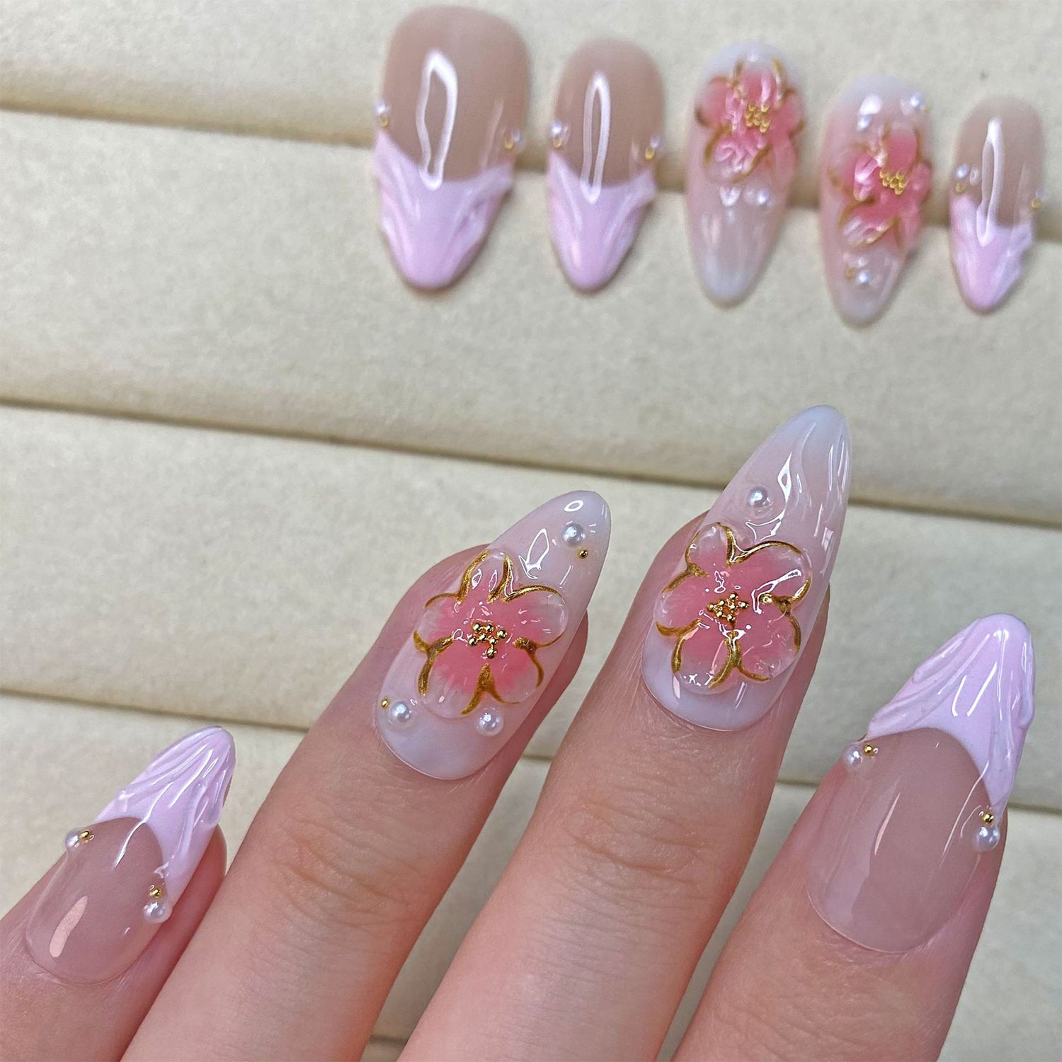 Soft pastels and intricate floral details give these nails a sense of delicate elegance. Golden lines and subtle pearlescent accents add a gentle, romantic feel, like a springtime melody.