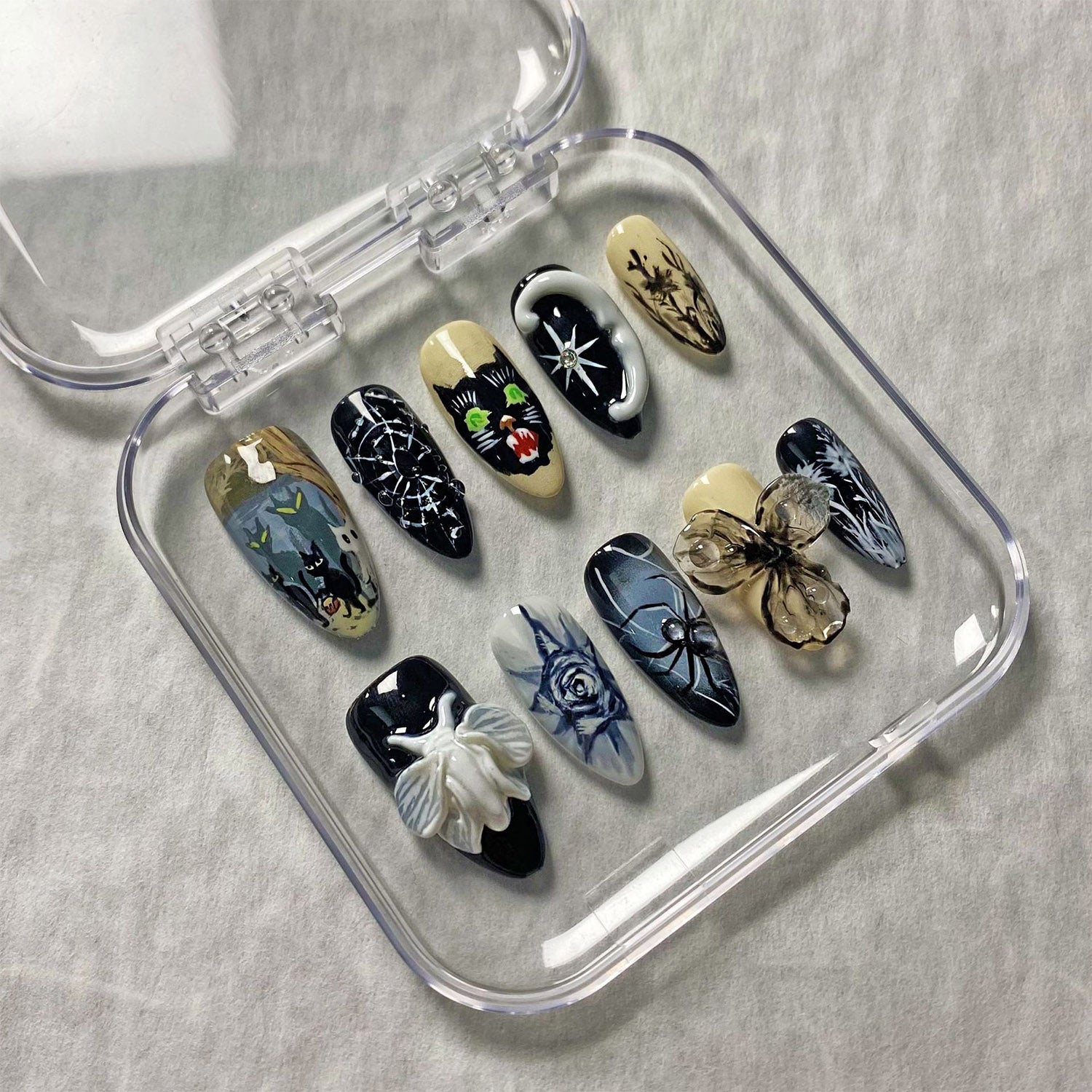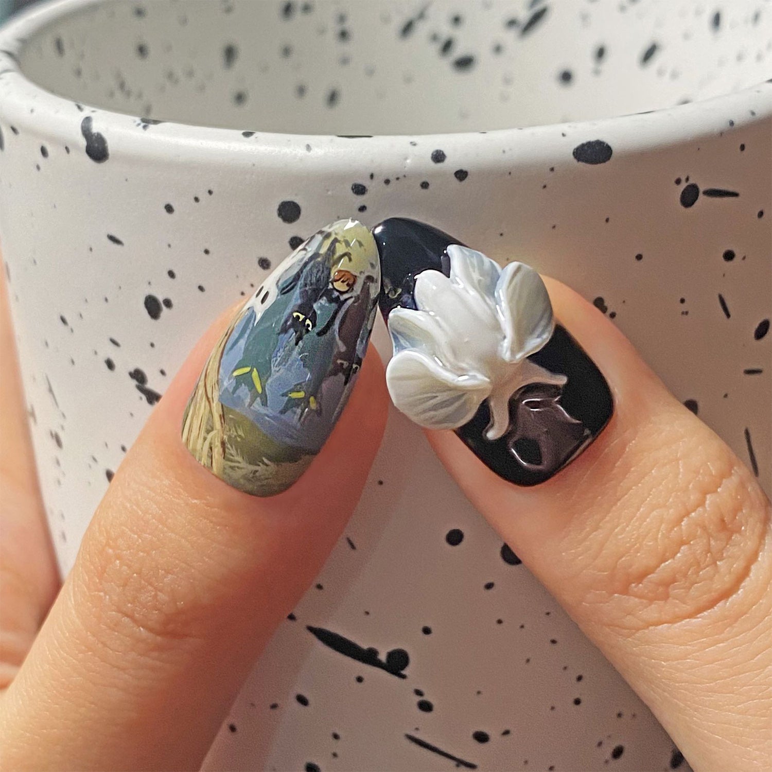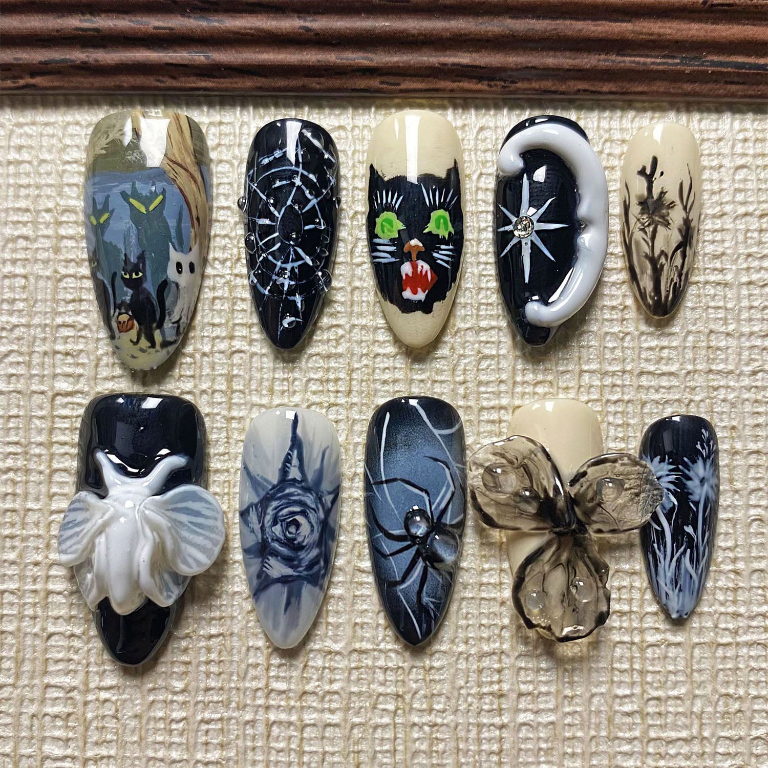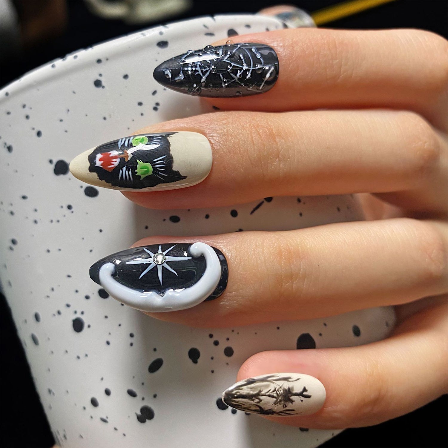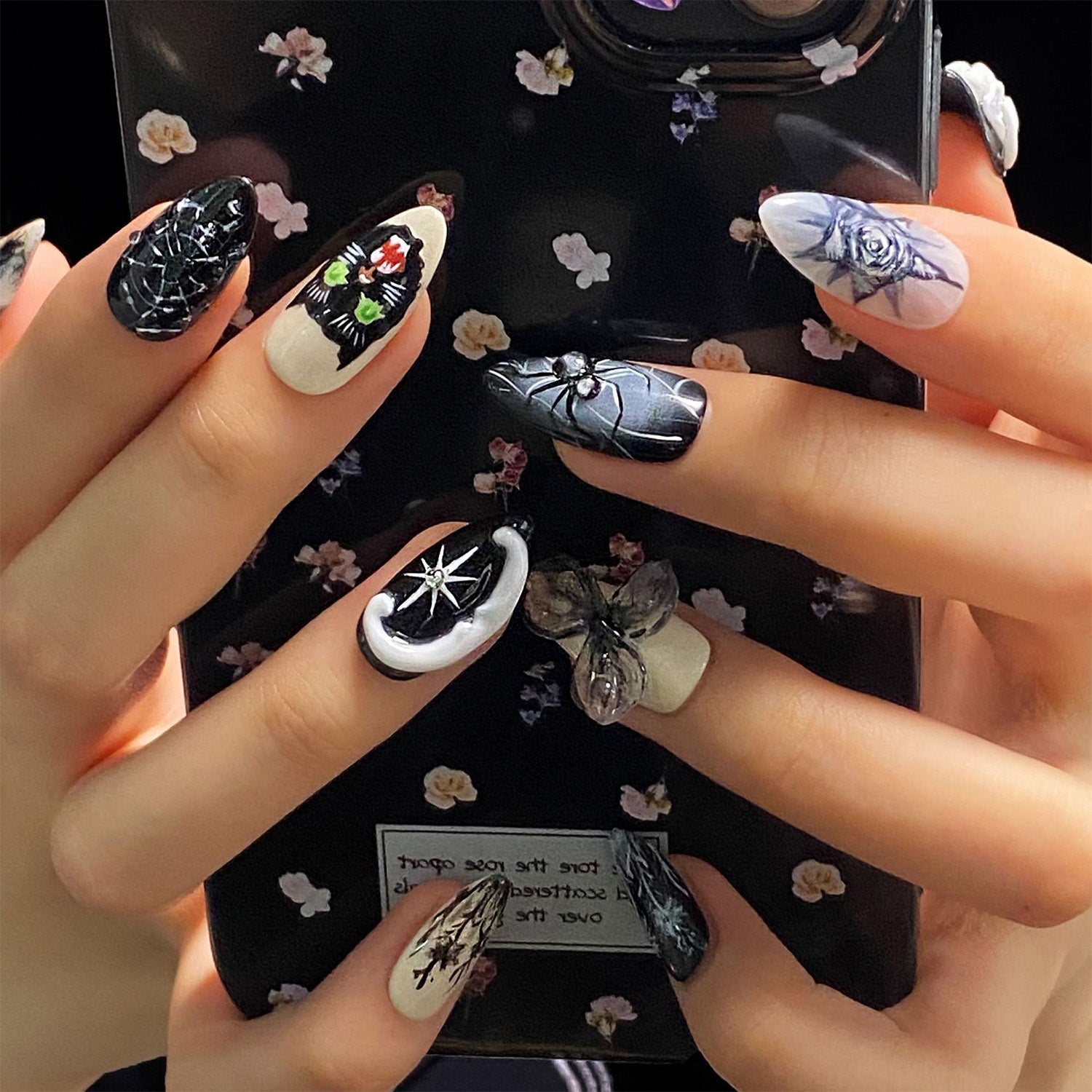 These nails capture the dark, enchanting essence of a moonlit garden with a hint of gothic elegance. Each one features unique details, forming a mysterious and artistic look.