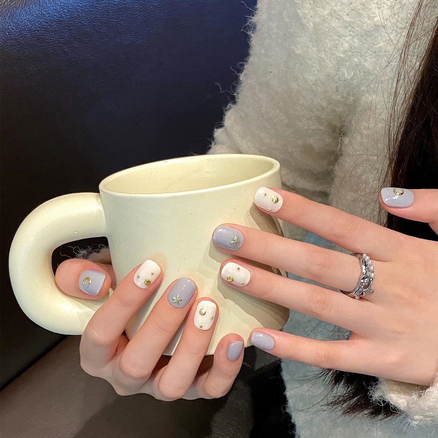 A sweet and celestial manicure featuring a charming mix of soft periwinkle blue and creamy white polish, accented with tiny gold star and crescent moon studs.