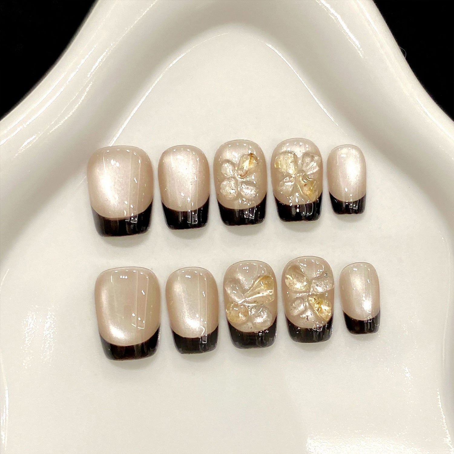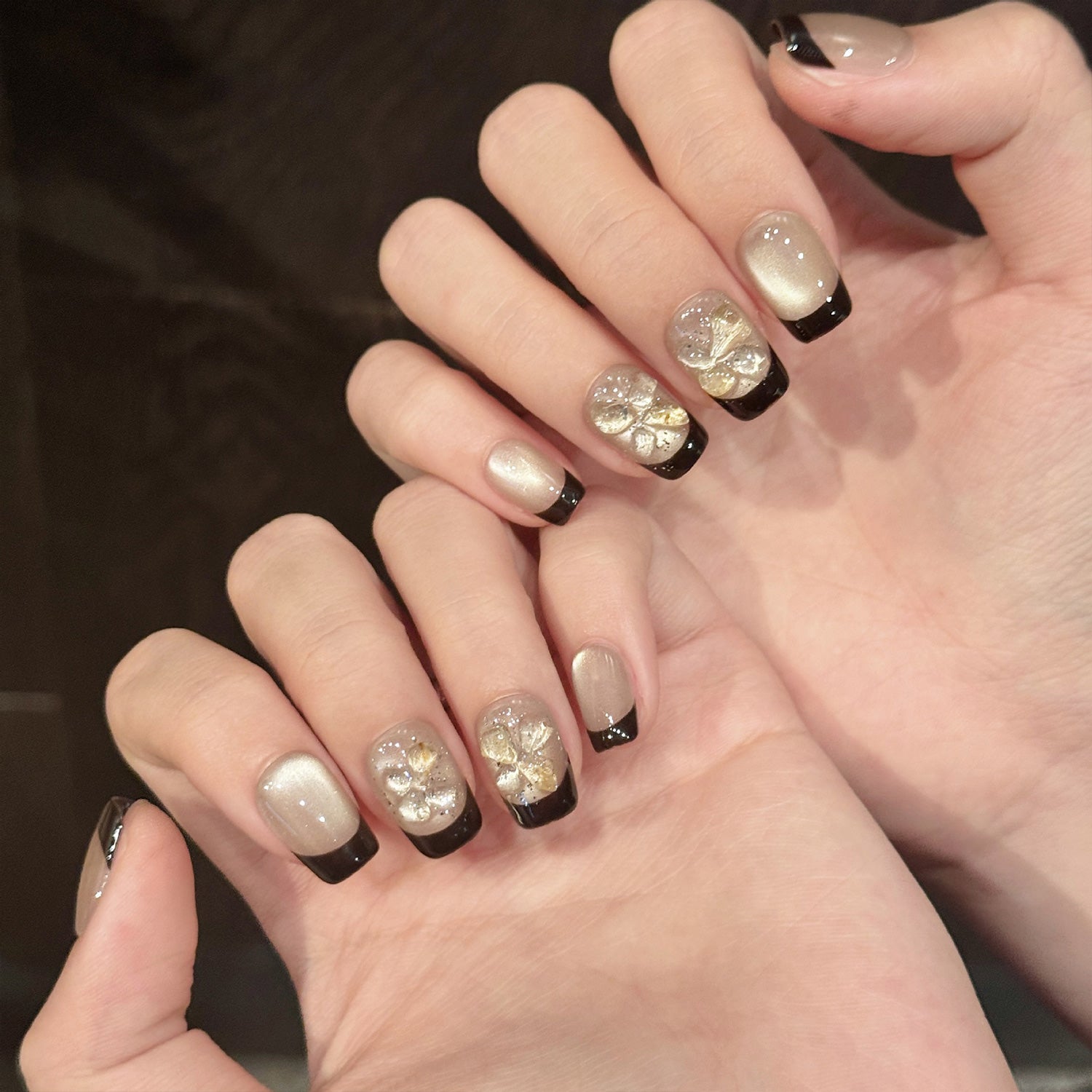 Gold cat-eye polish adds a radiant touch to this vintage-style manicure. Black French tips and subtle 3D floral details elevate its luxurious charm.