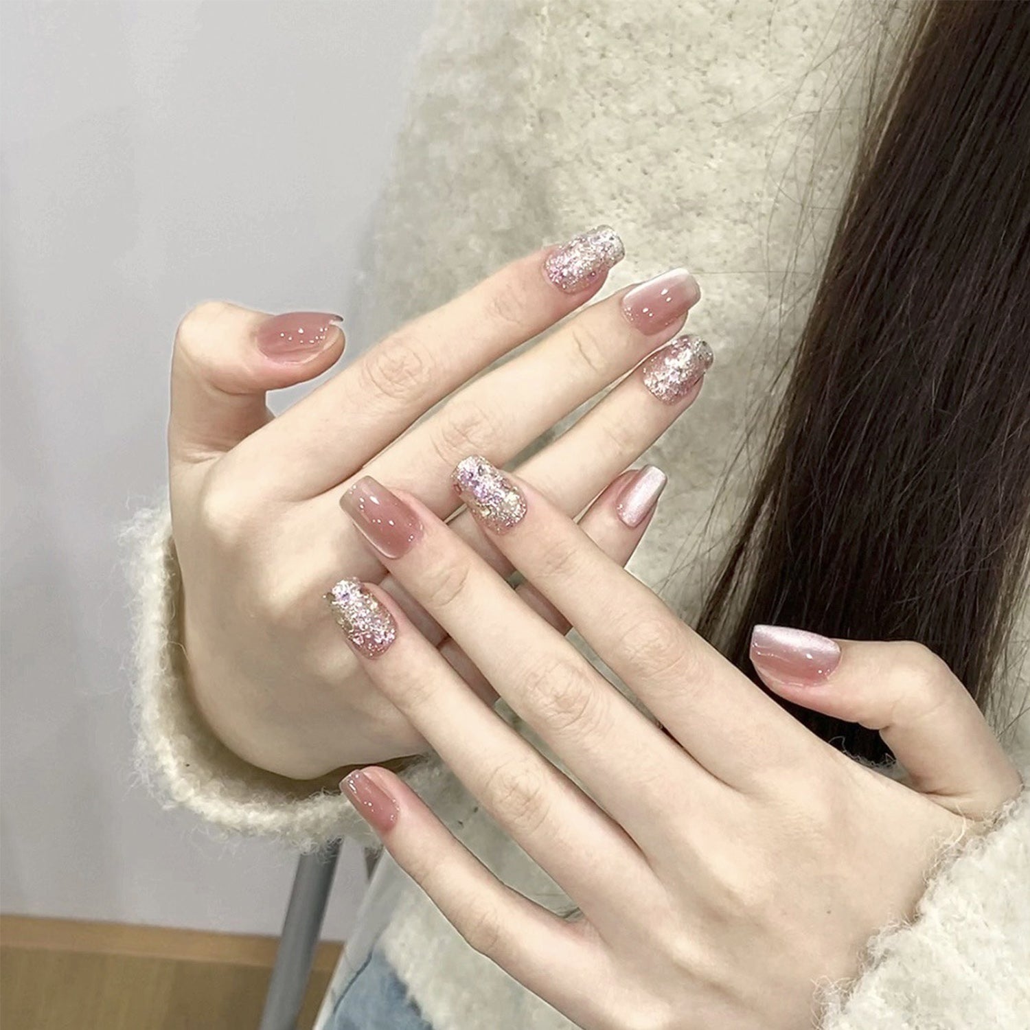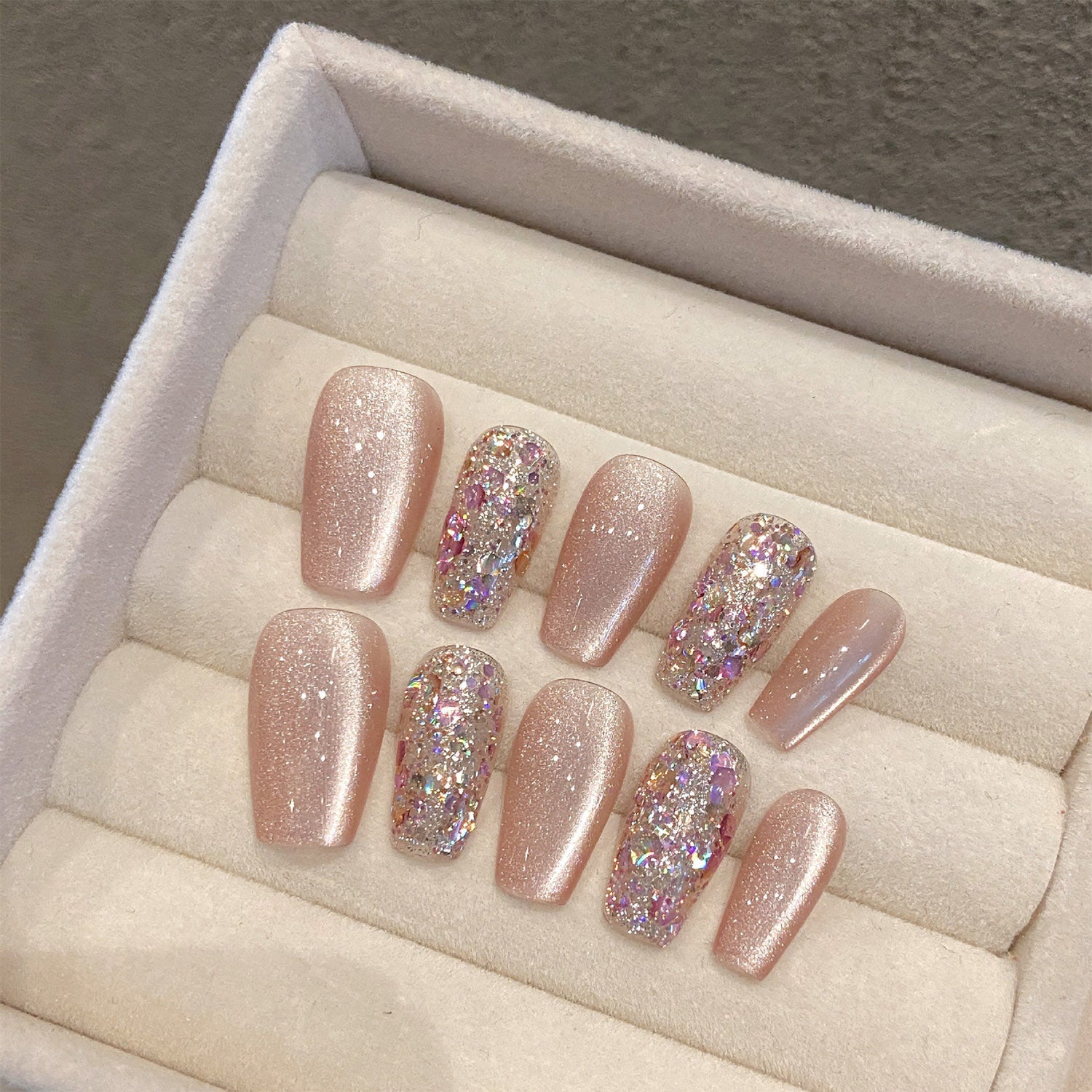 These press-on nails feature a beautiful gradient of soft pink, with two accent nails that catch the light with a stunning, chunky glitter finish.