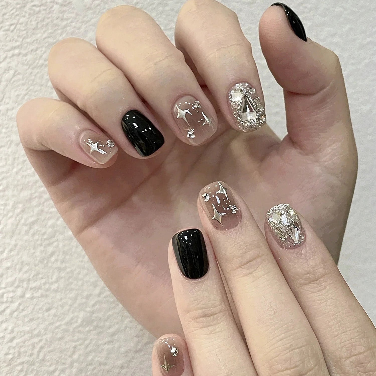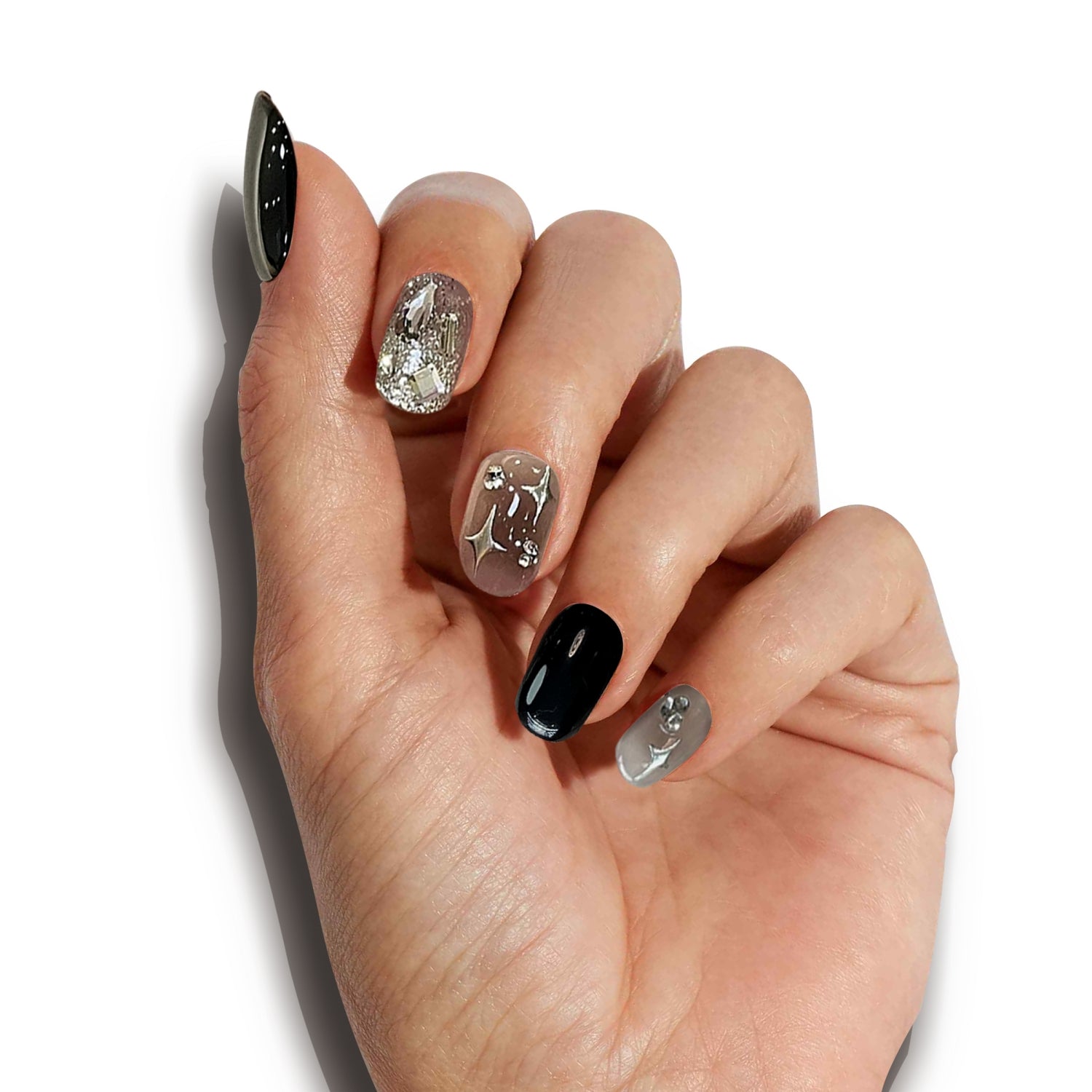 Featuring glossy black and translucent, celestial-inspired details, this nail design delivers a modern, edgy elegance.
