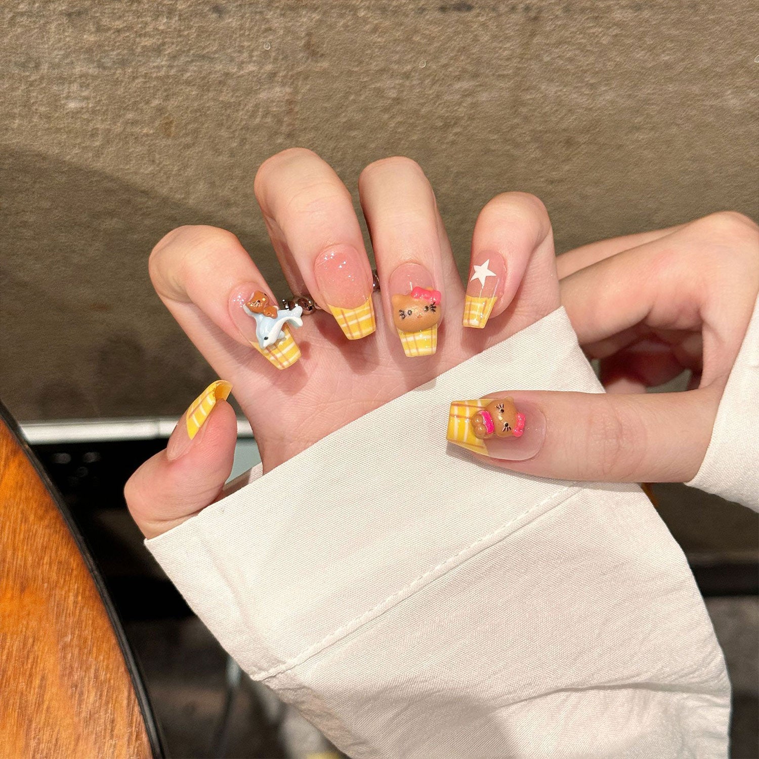 Bright yellow plaid sets a vibrant backdrop for this playful manicure. 3D resin bears and cute cartoon charms bring an extra layer of charm and whimsy.