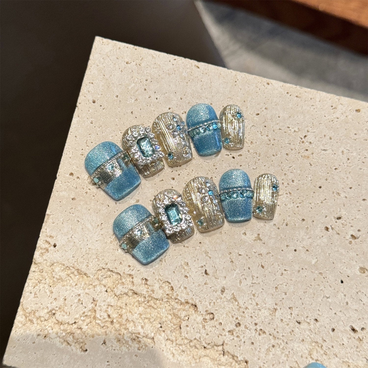 This design combines a dreamy sky-blue with sparkling gold glitter and a subtle metallic sheen. The contrast between the cool blue and warm gold creates a glamorous and sophisticated look.