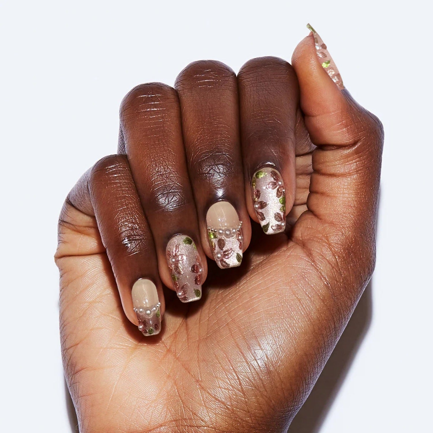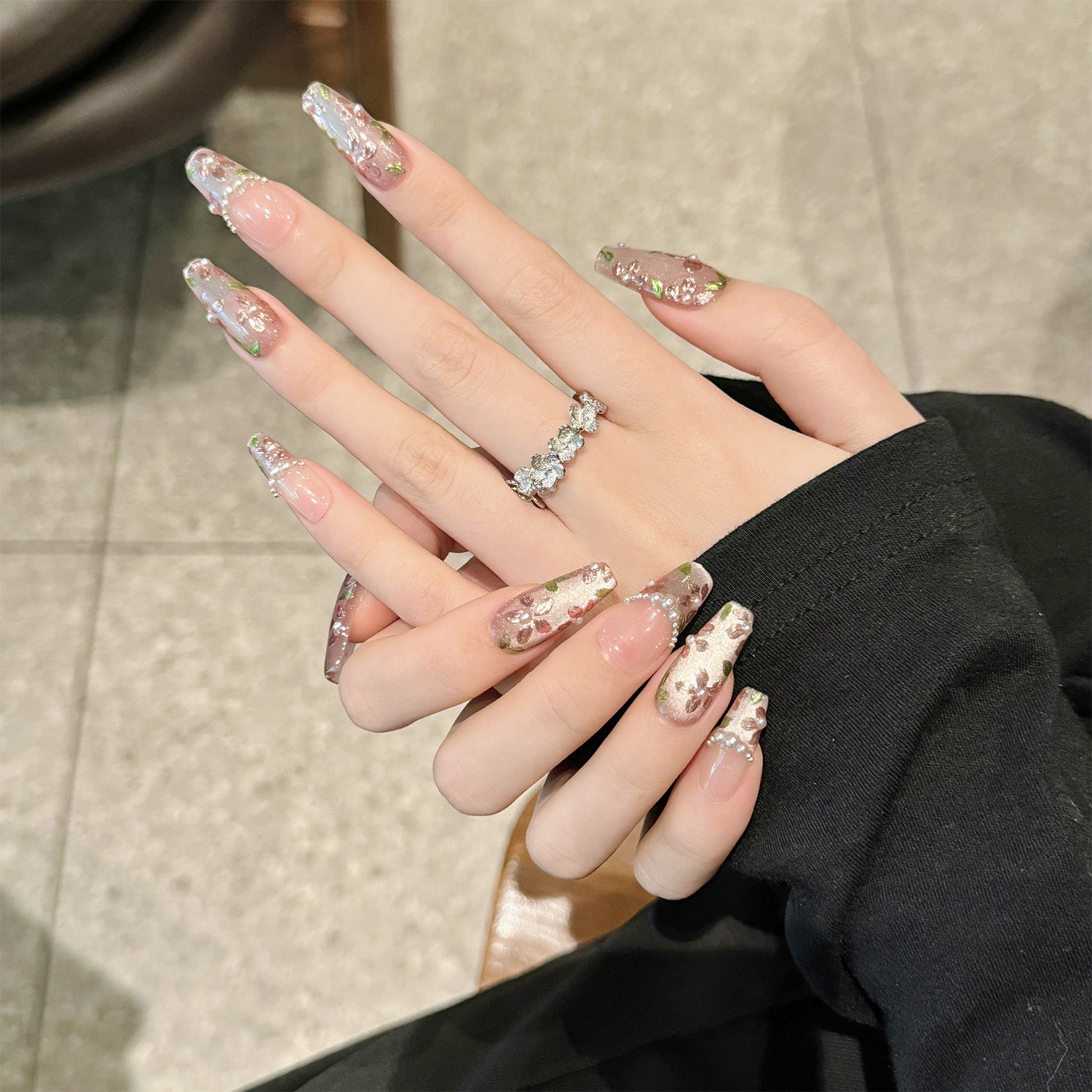 This design combines glittery pink tones with intricate floral details and pearl accents, creating a sweet, elegant look perfect for everyday wear.