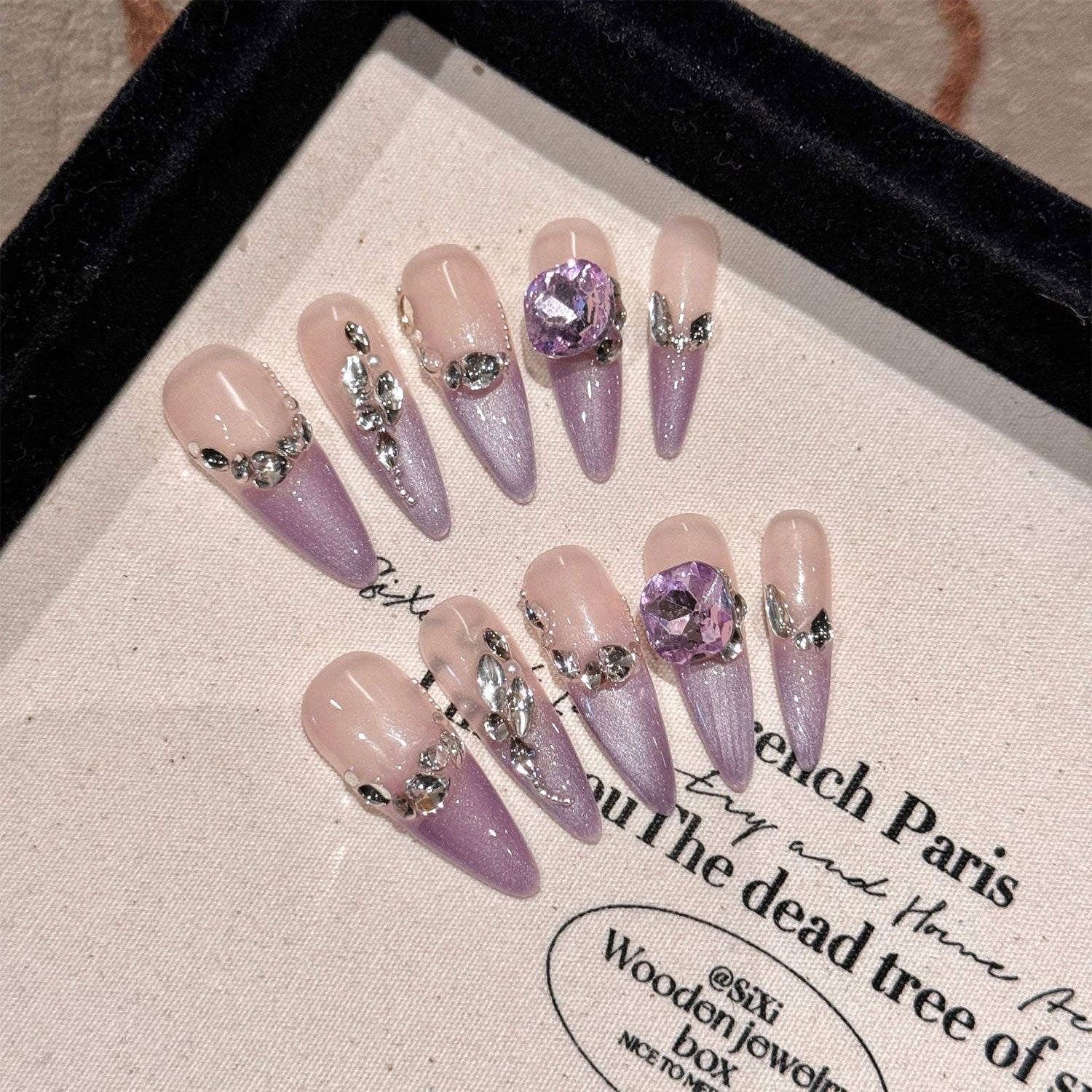 This set features a soft, dreamy lavender ombré that fades into a sheer base. The nails are adorned with a cascade of sparkling crystals, including a stunning large lilac gem on the thumb.