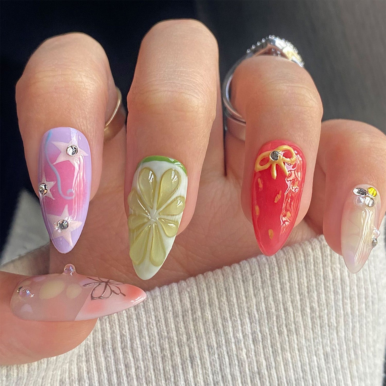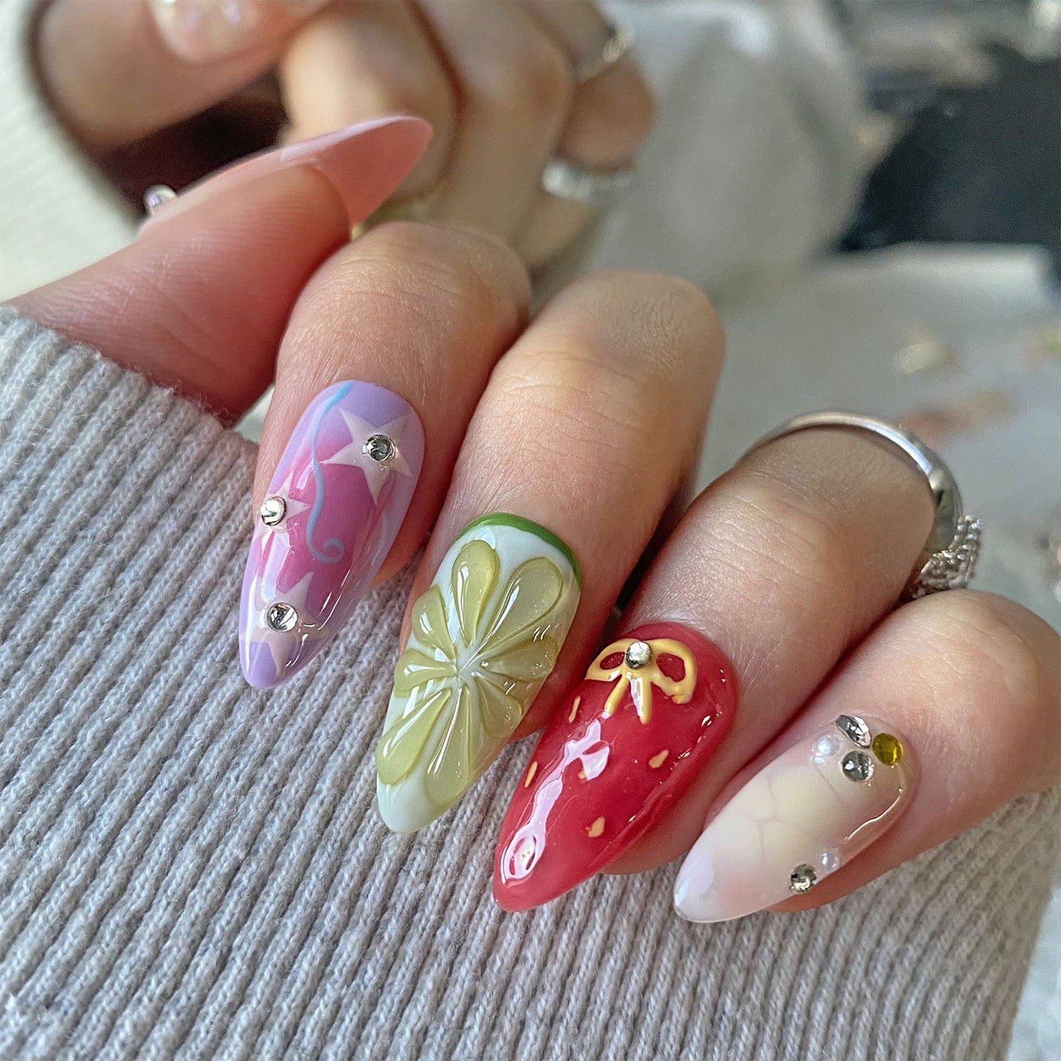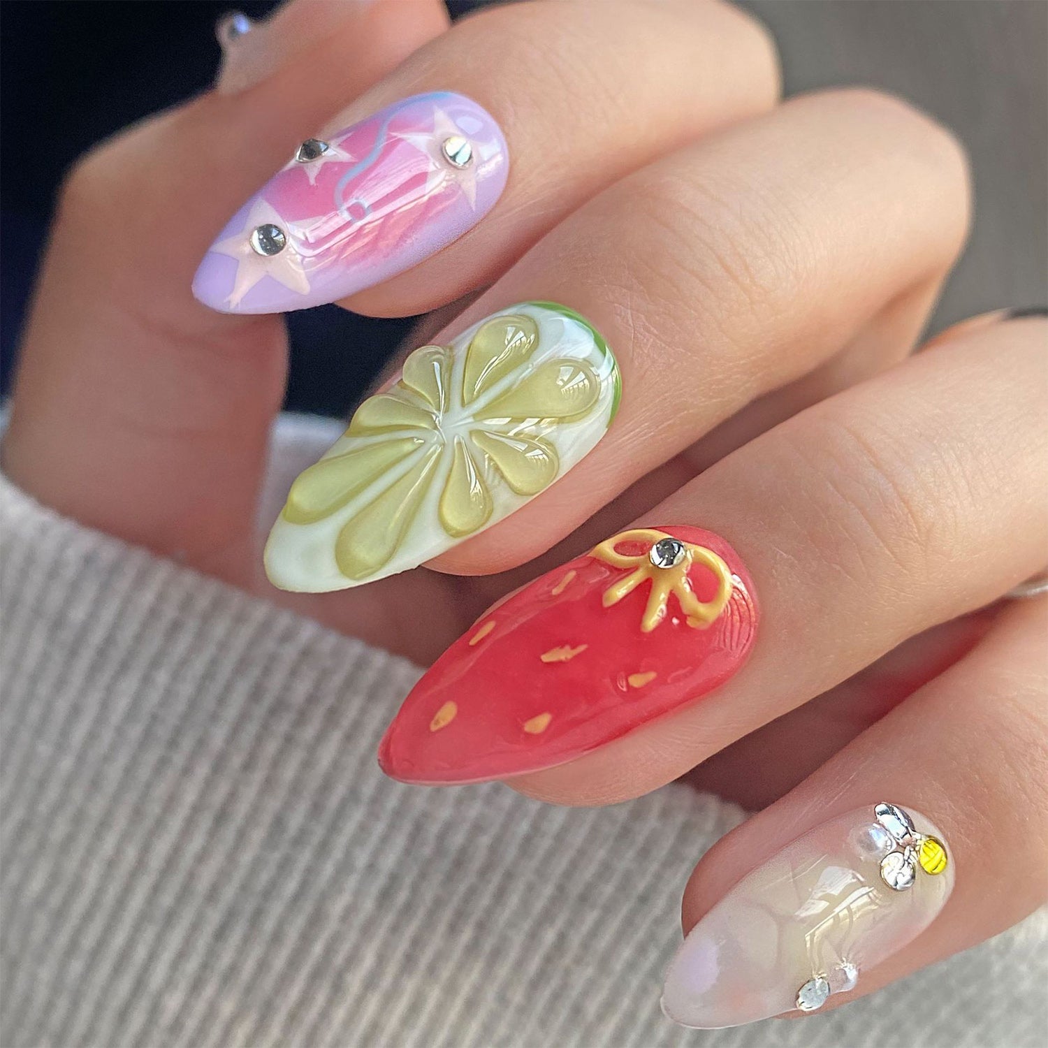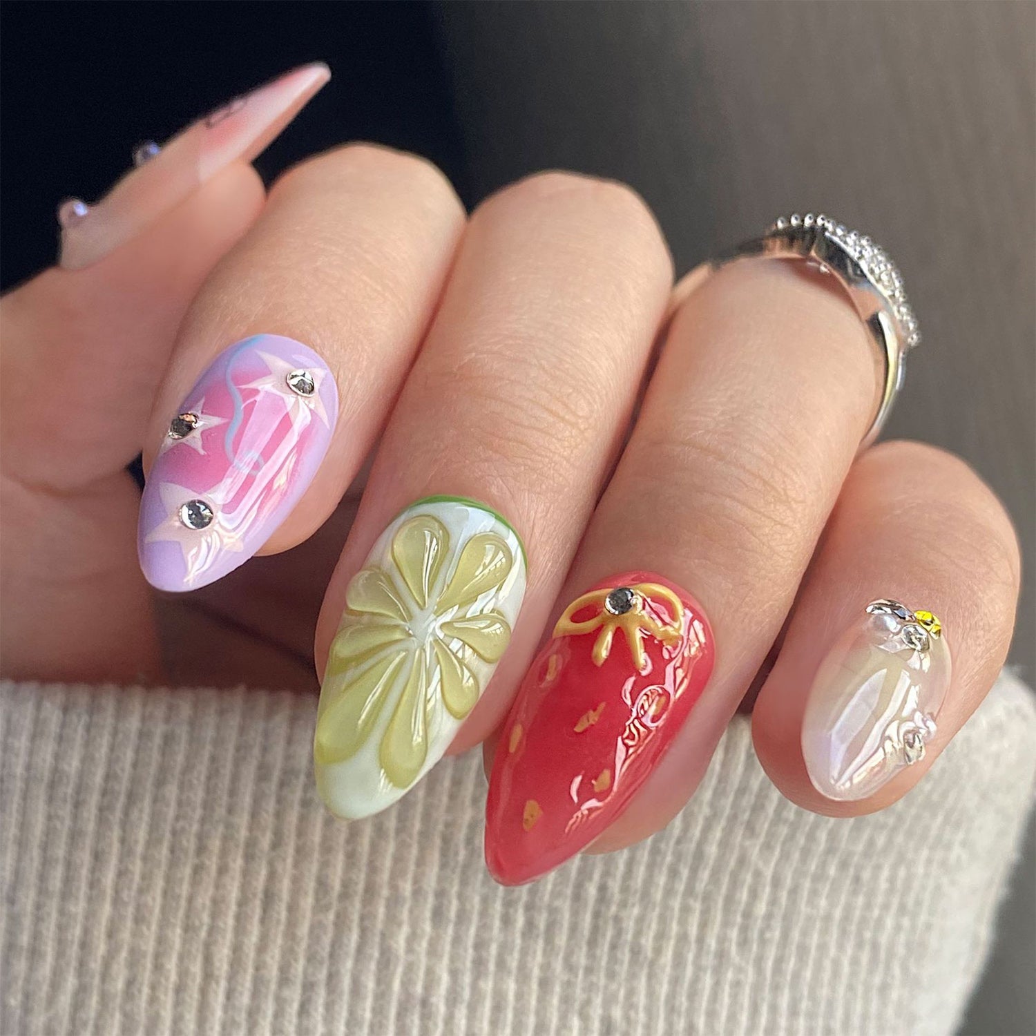 Full of playful charm, these nails mix colors and patterns for a whimsical look. Each nail showcases a unique 3D element—like a translucent citrus slice, glossy strawberry with ribbon, and sparkling stars—for a vibrant, fantastical style.