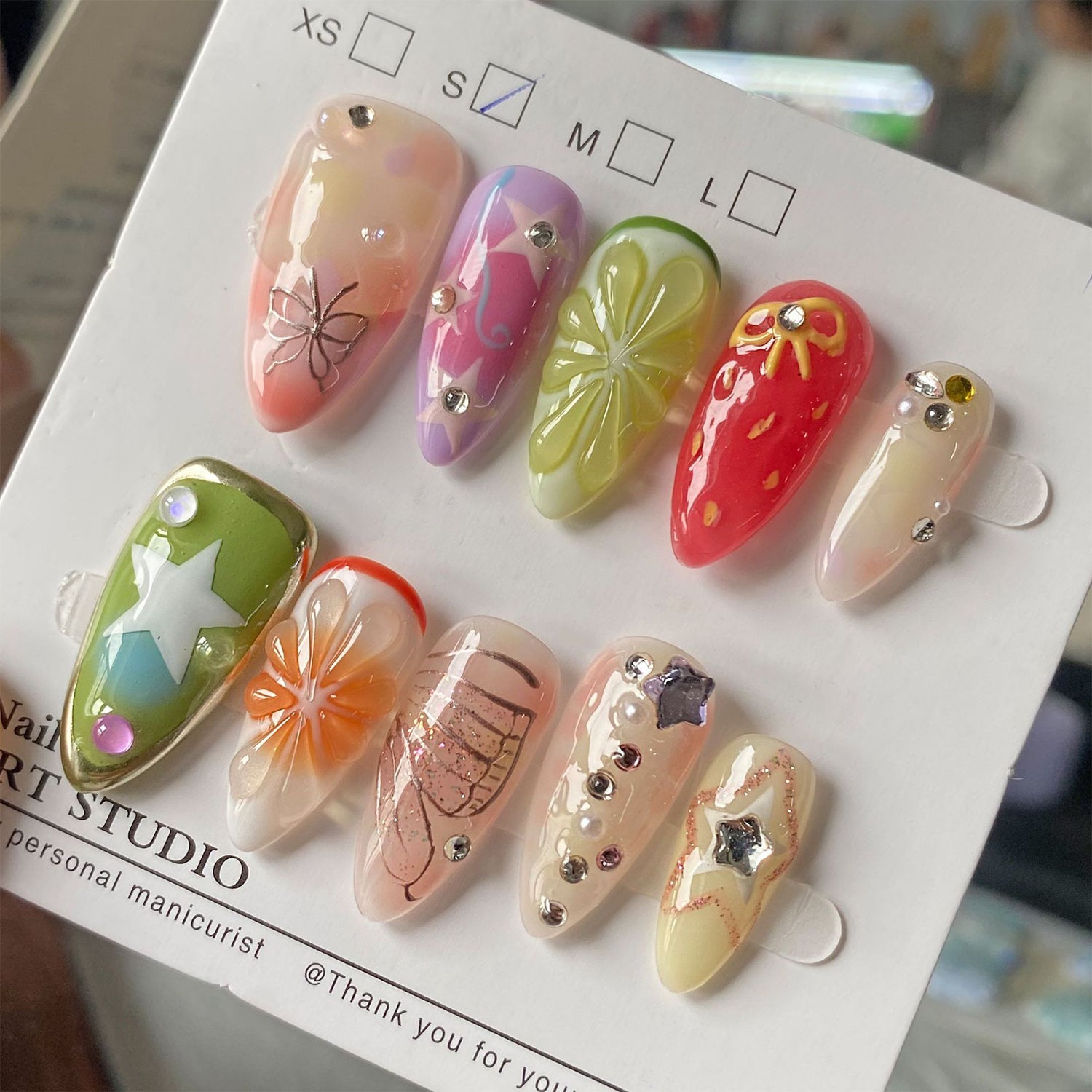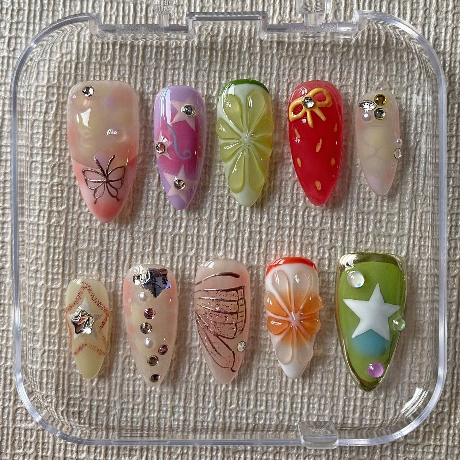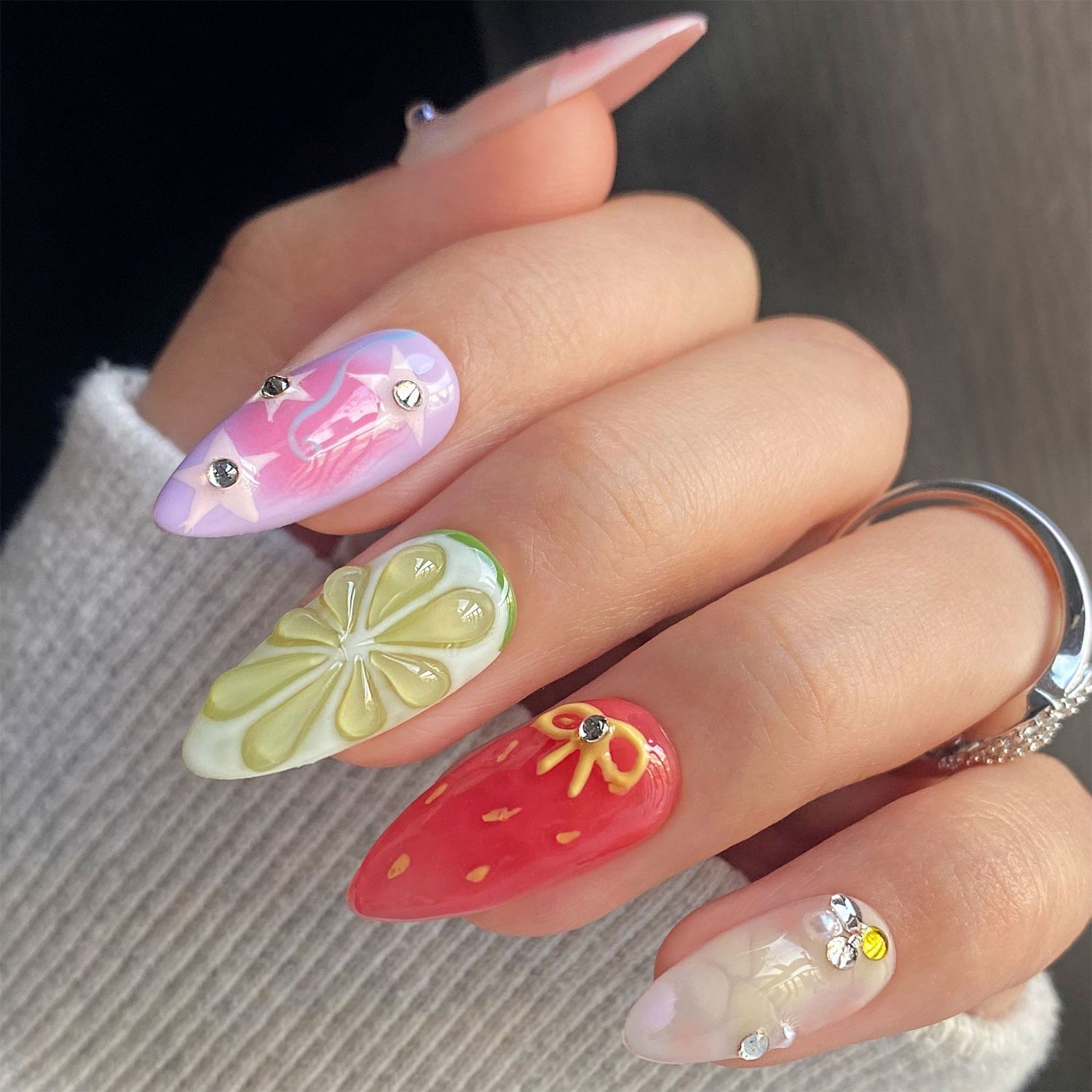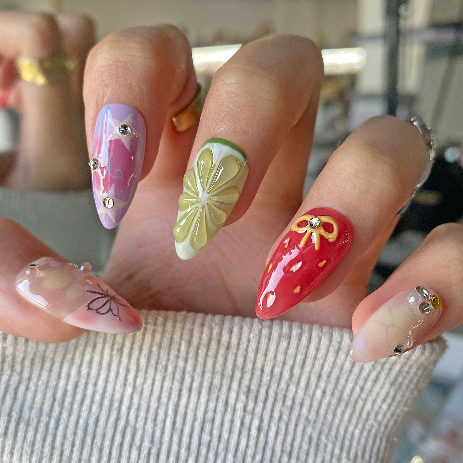 Full of playful charm, these nails mix colors and patterns for a whimsical look. Each nail showcases a unique 3D element—like a translucent citrus slice, glossy strawberry with ribbon, and sparkling stars—for a vibrant, fantastical style.