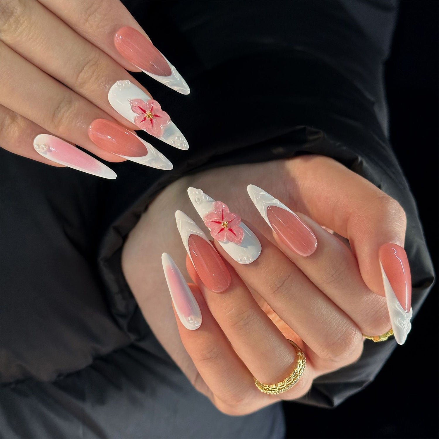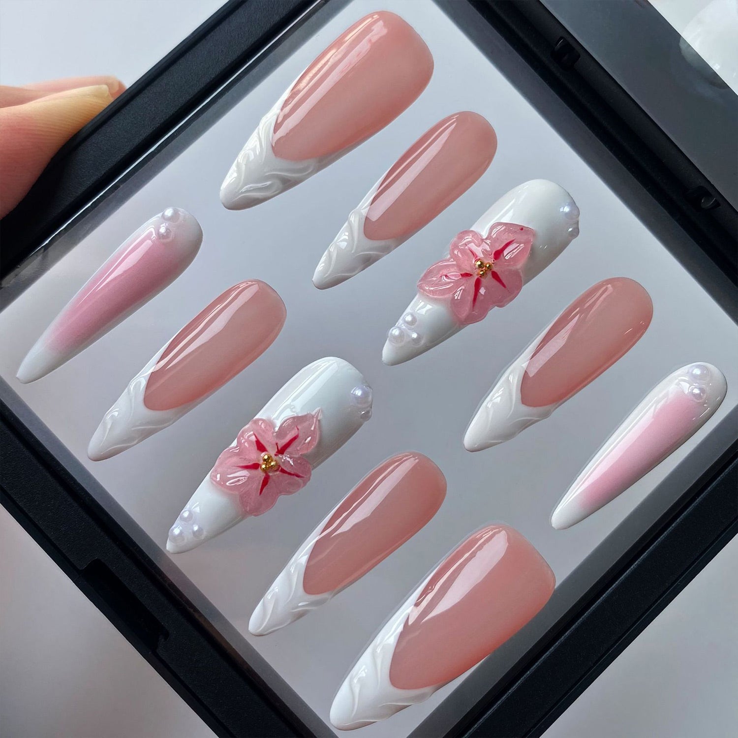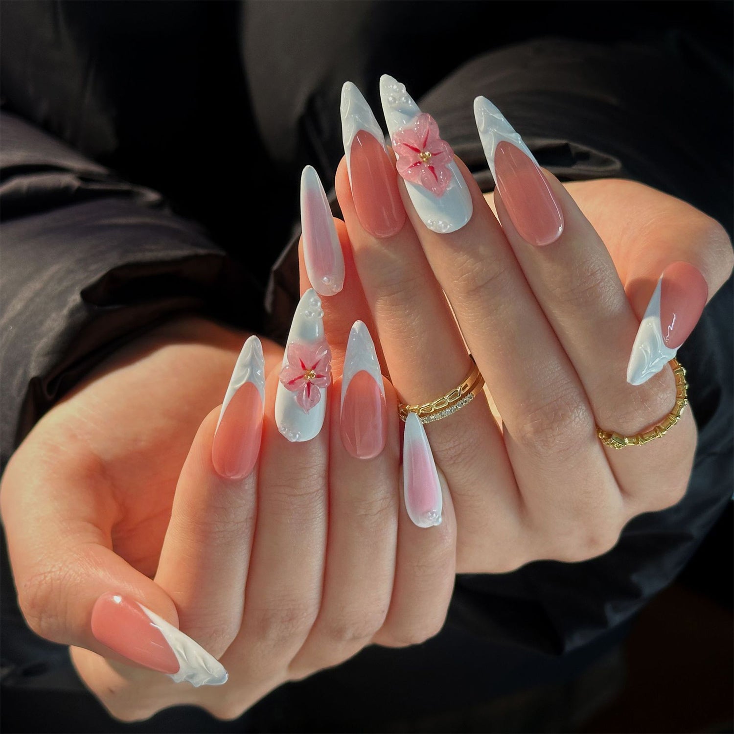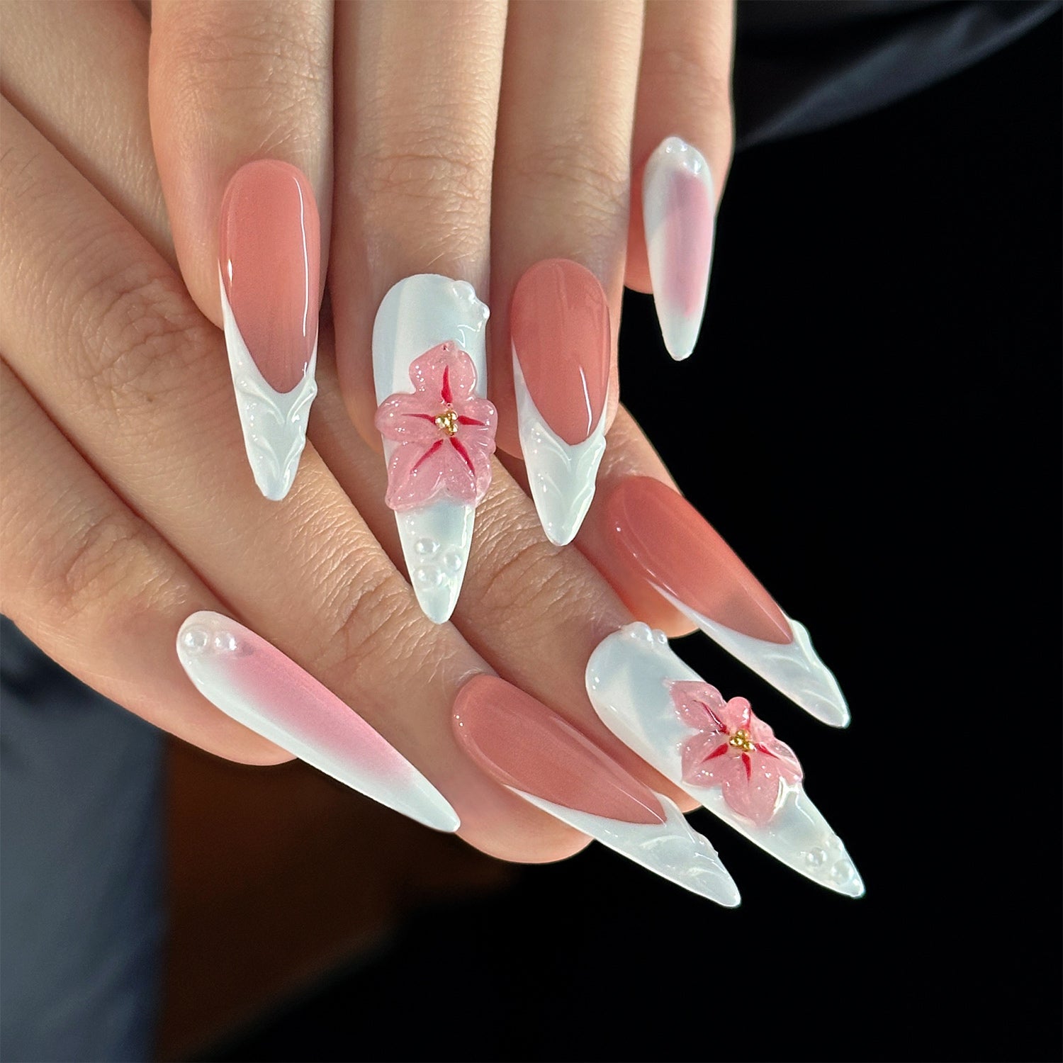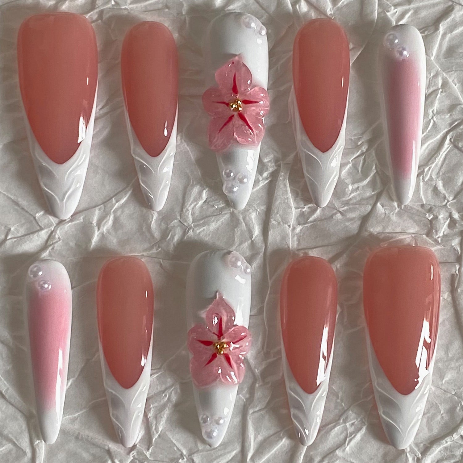 This set features a glossy pink base and white ombré tips that resemble petals. It's a fresh, elegant design with a touch of playful 3D blossoms.