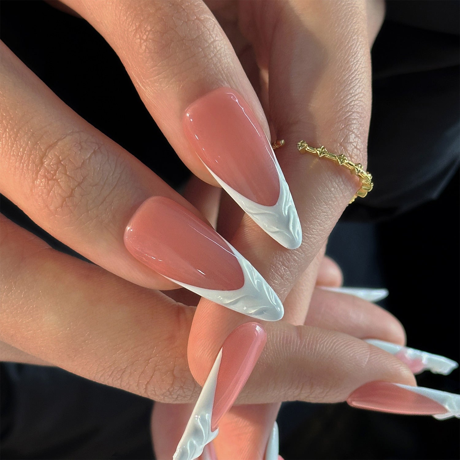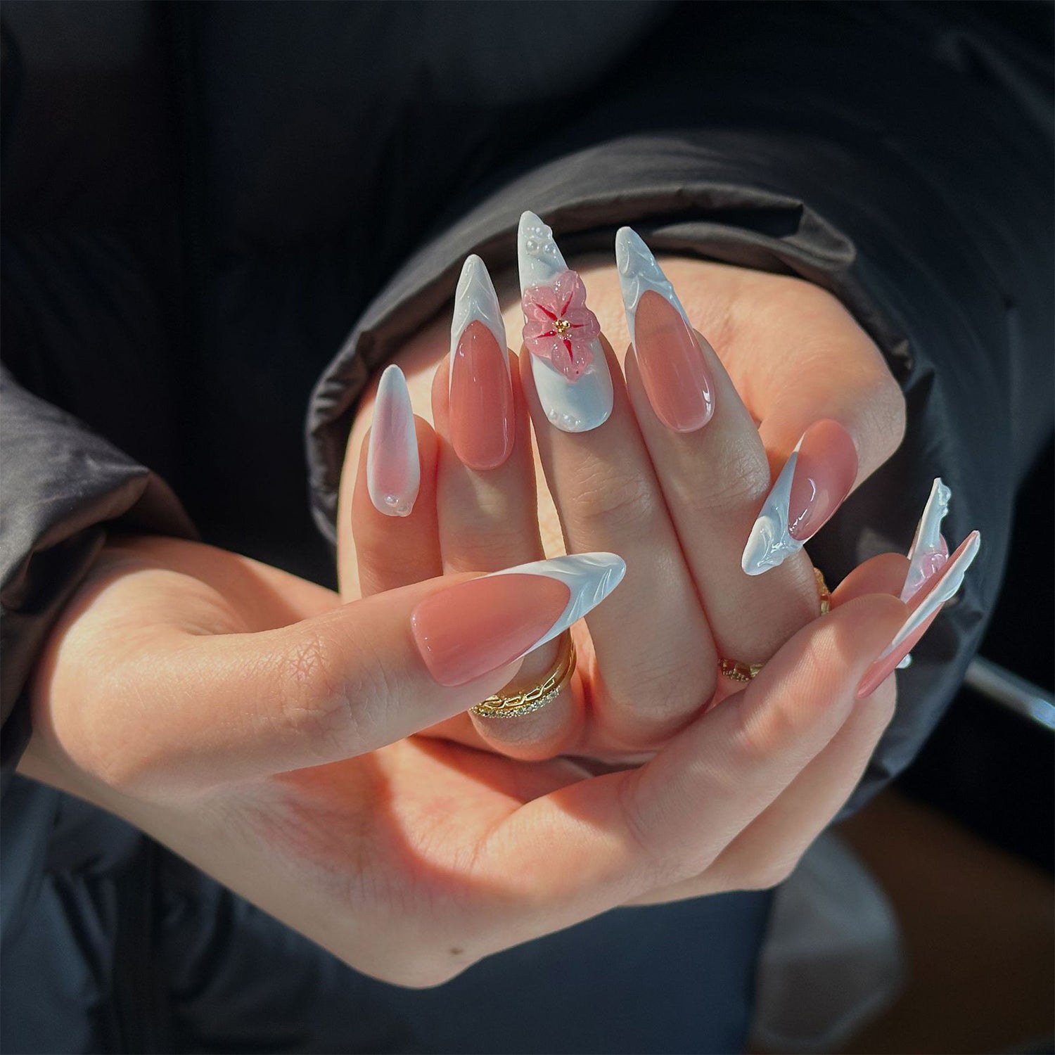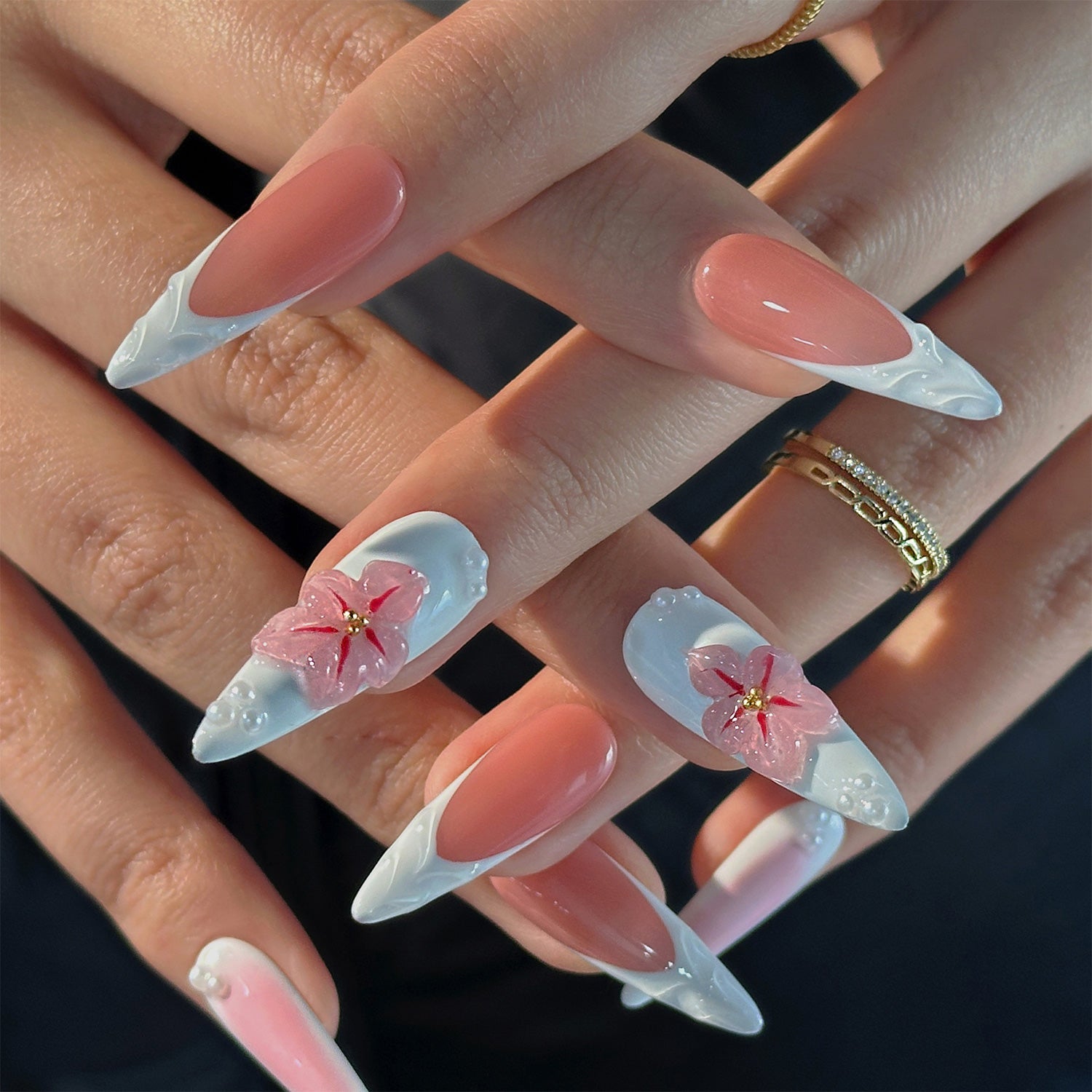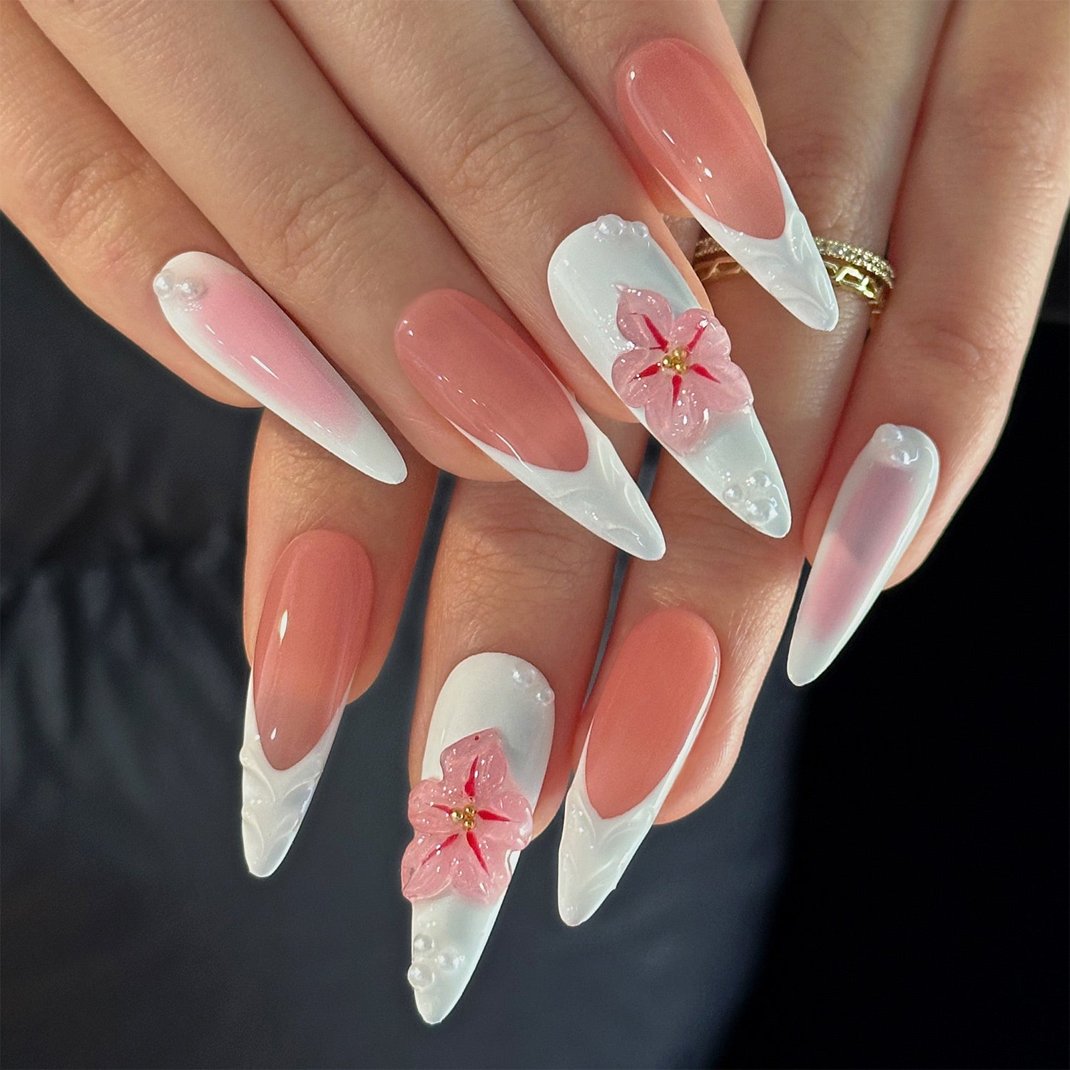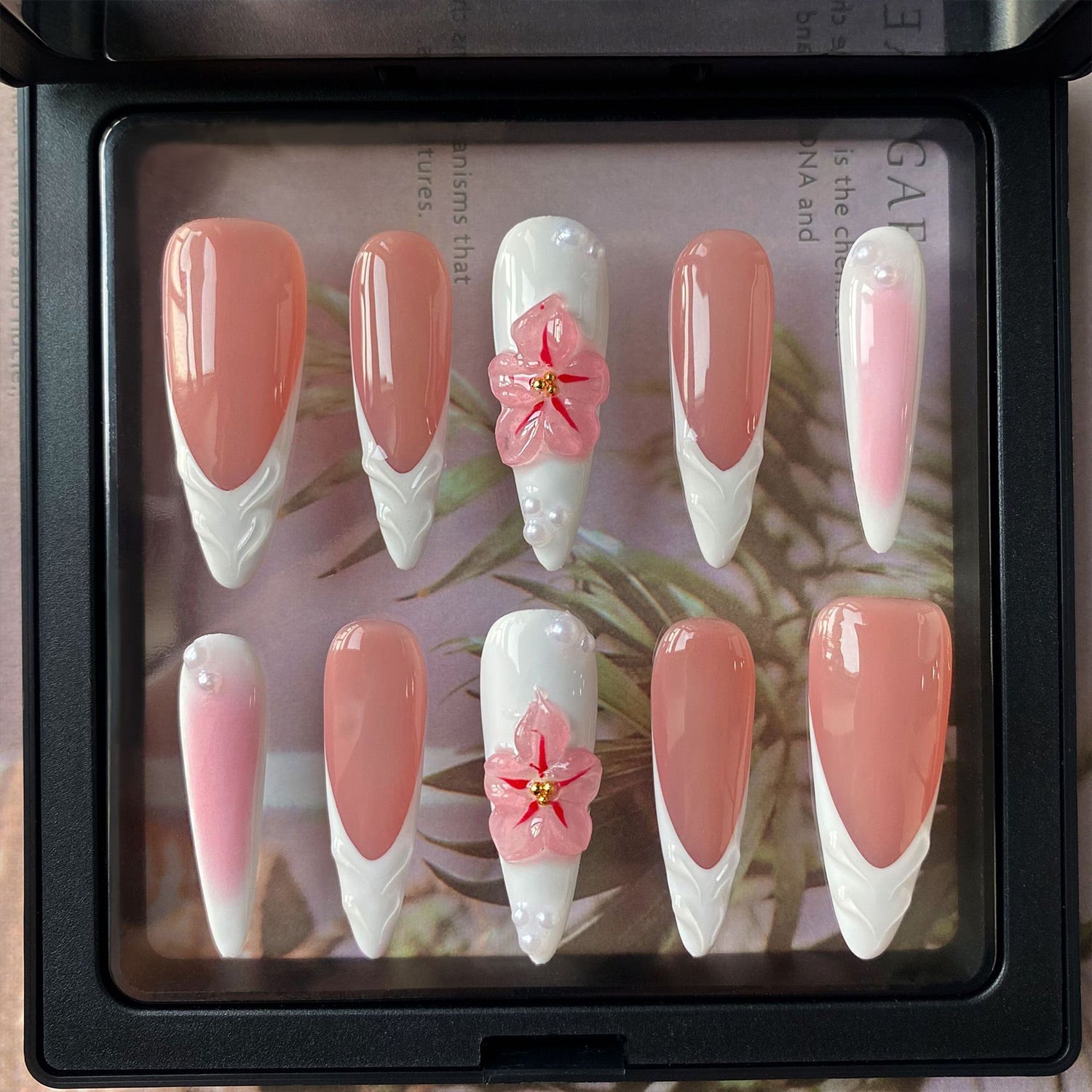 This set features a glossy pink base and white ombré tips that resemble petals. It's a fresh, elegant design with a touch of playful 3D blossoms.