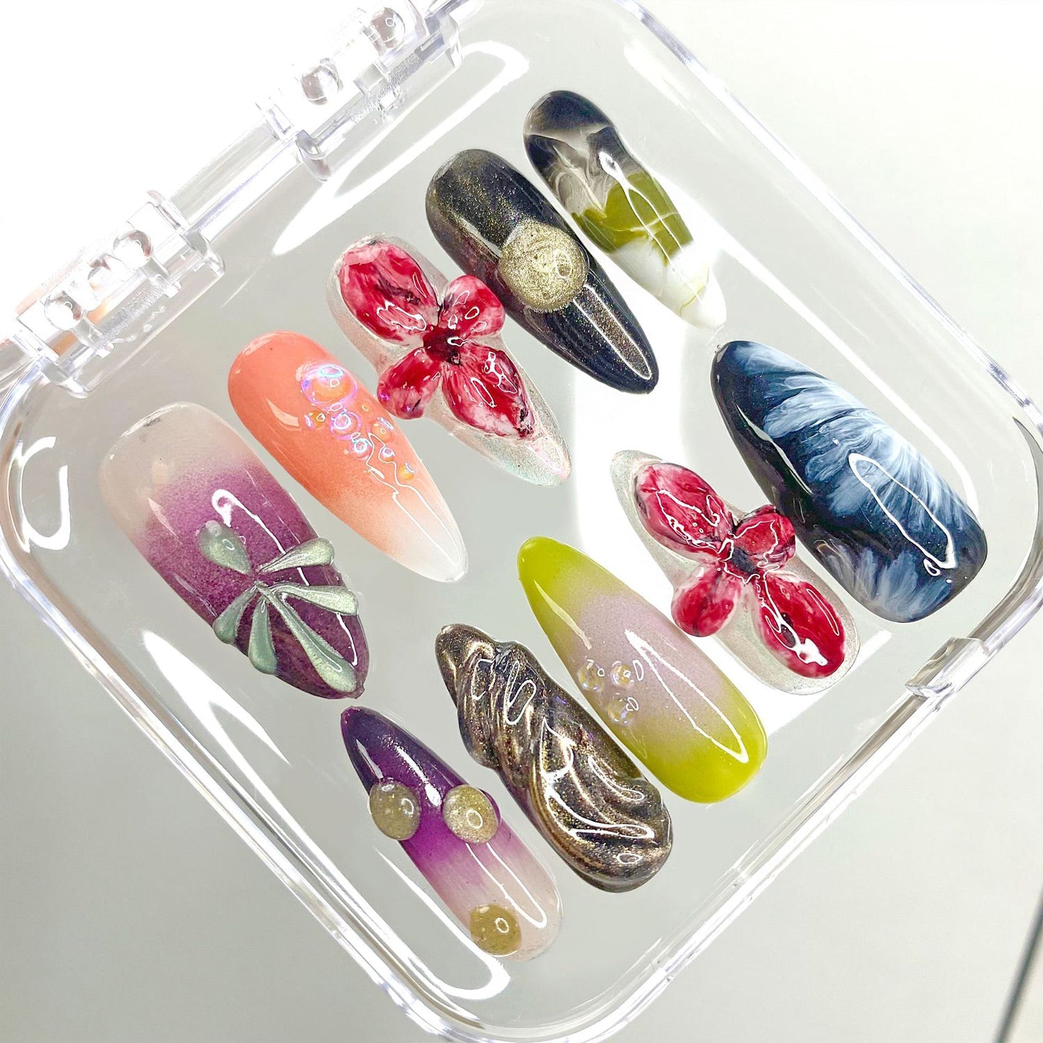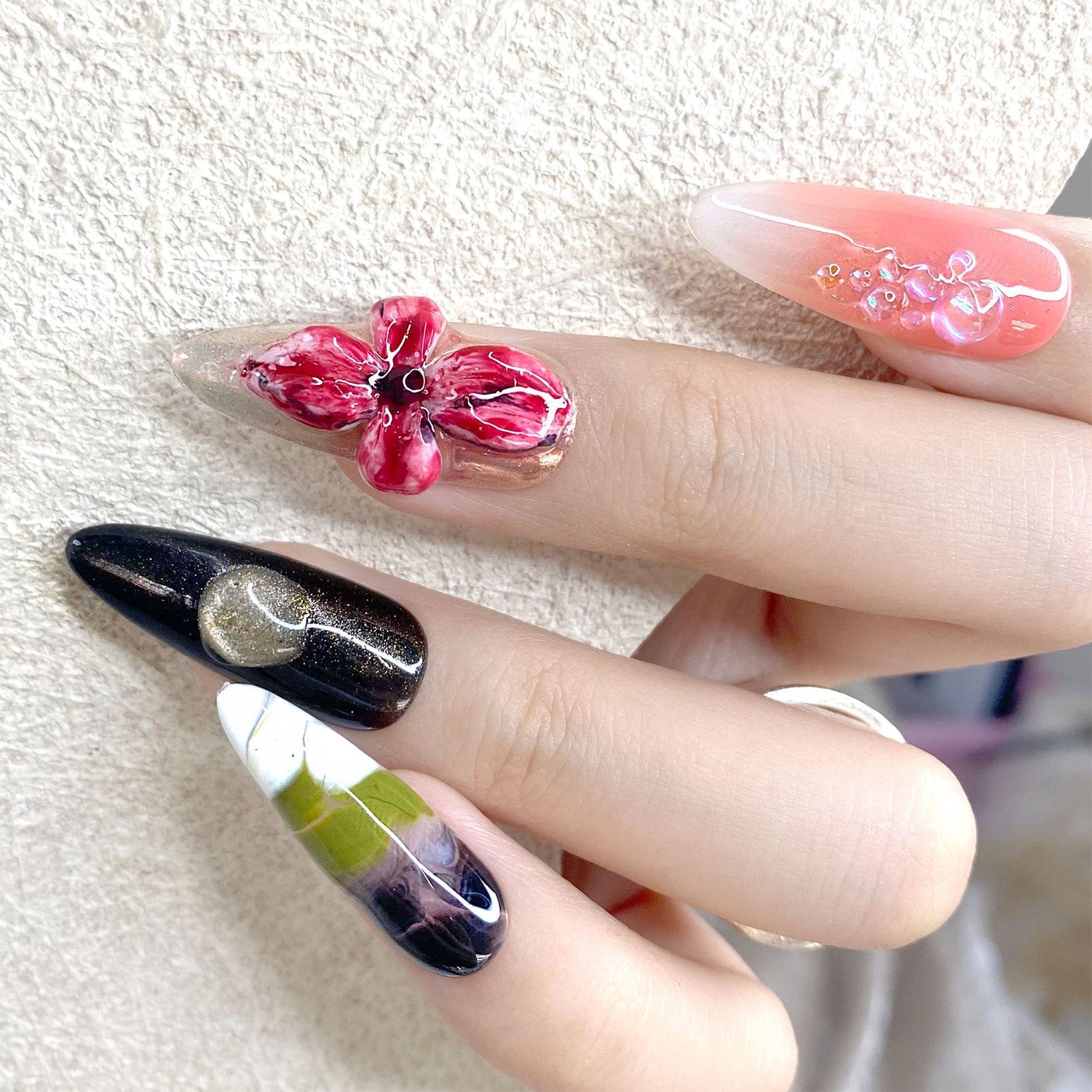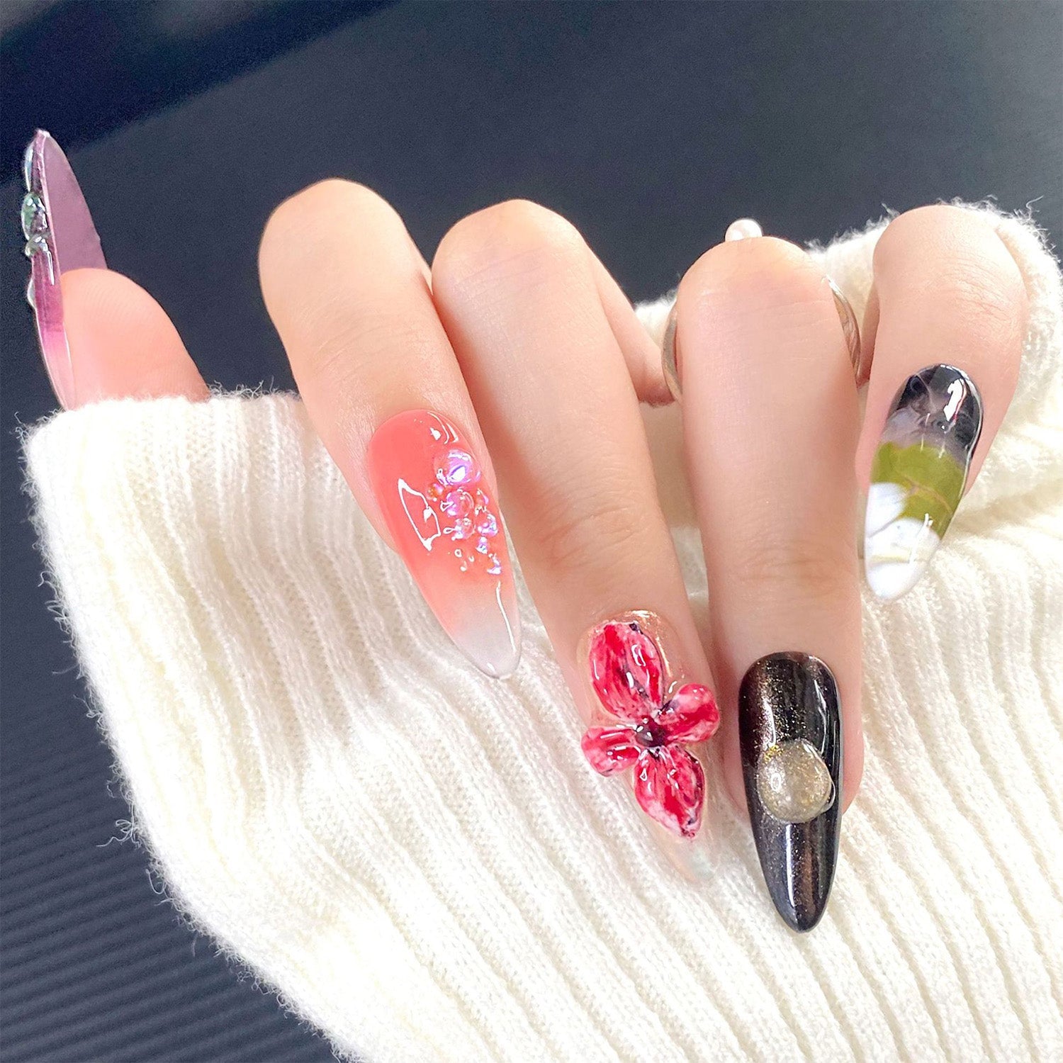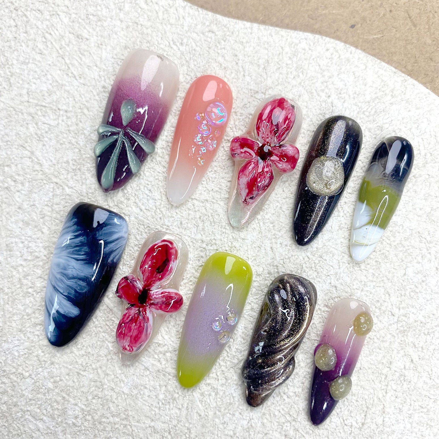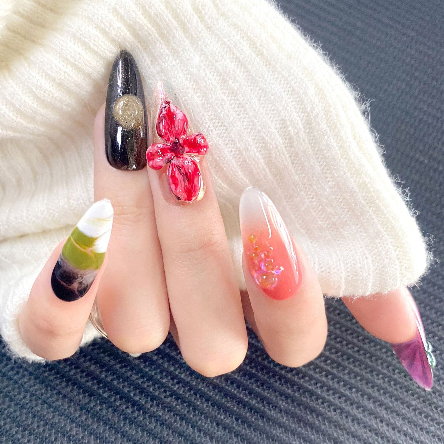 This set combines a variety of artistic styles, from a vivid floral accent to a unique, two-toned gradient. The different designs on each nail, from a dark, glossy base to a subtle ombre, create an eclectic and stylish manicure.