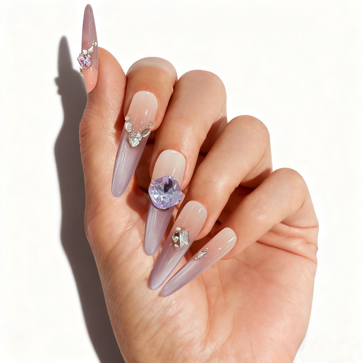 Accented by striking lilac crystals and smaller white crystals. This manicure exudes sophistication and charm, perfect for those who appreciate a polished style.