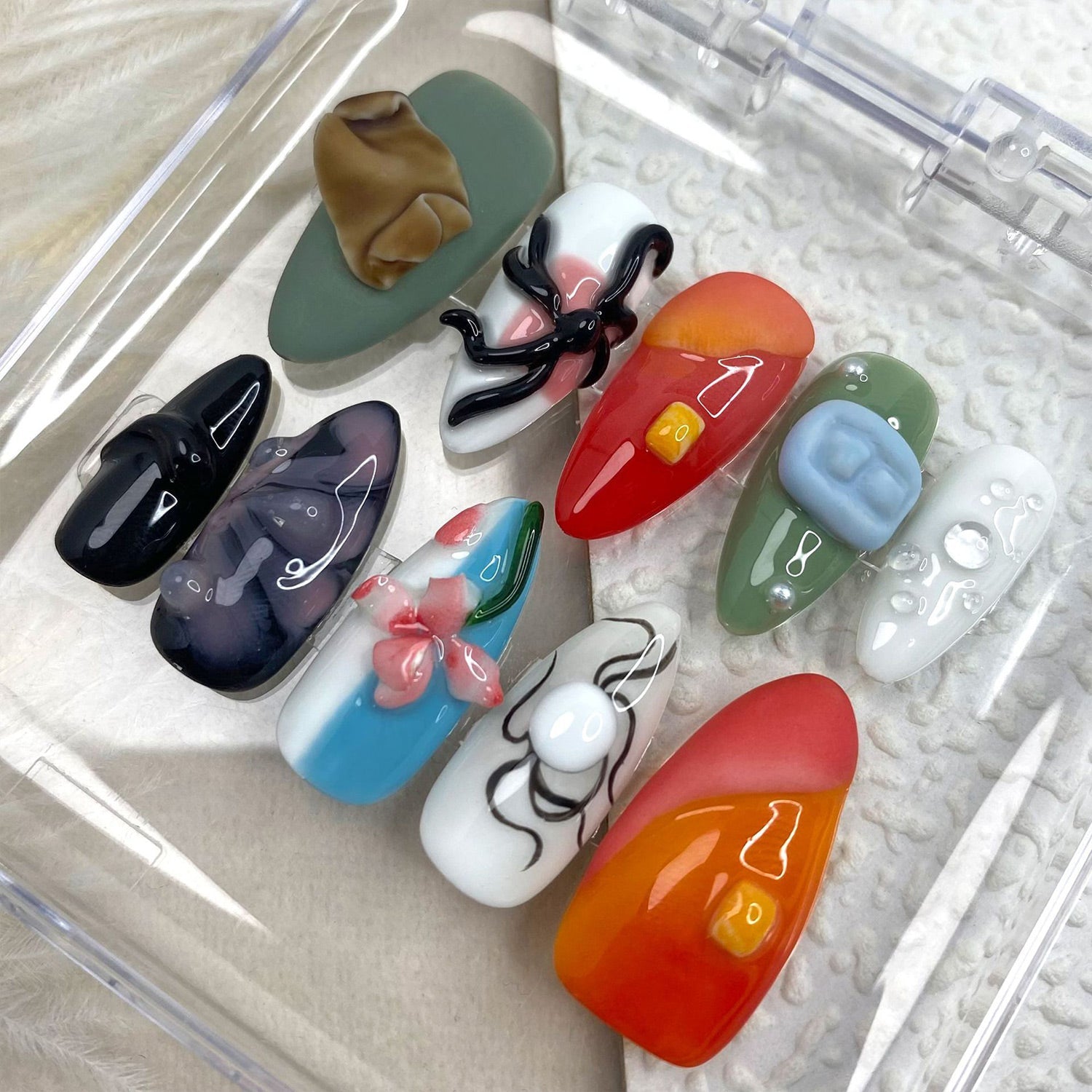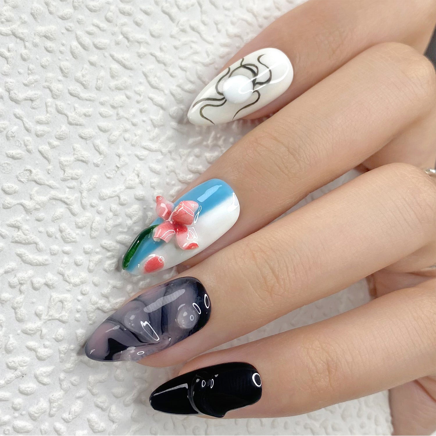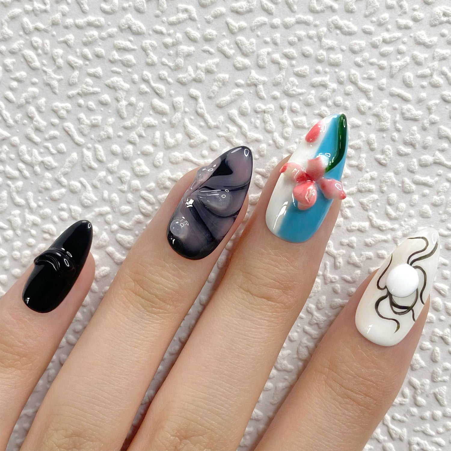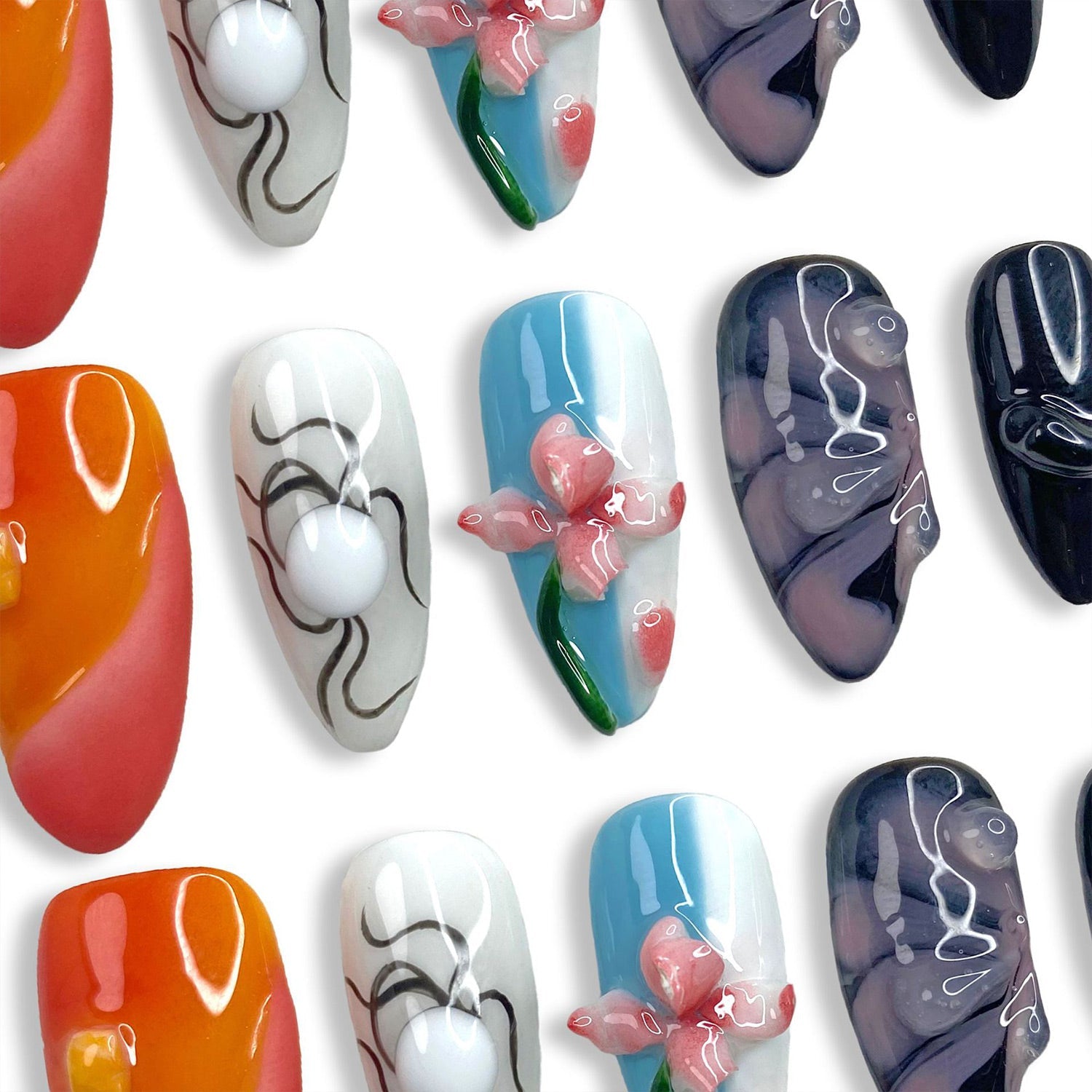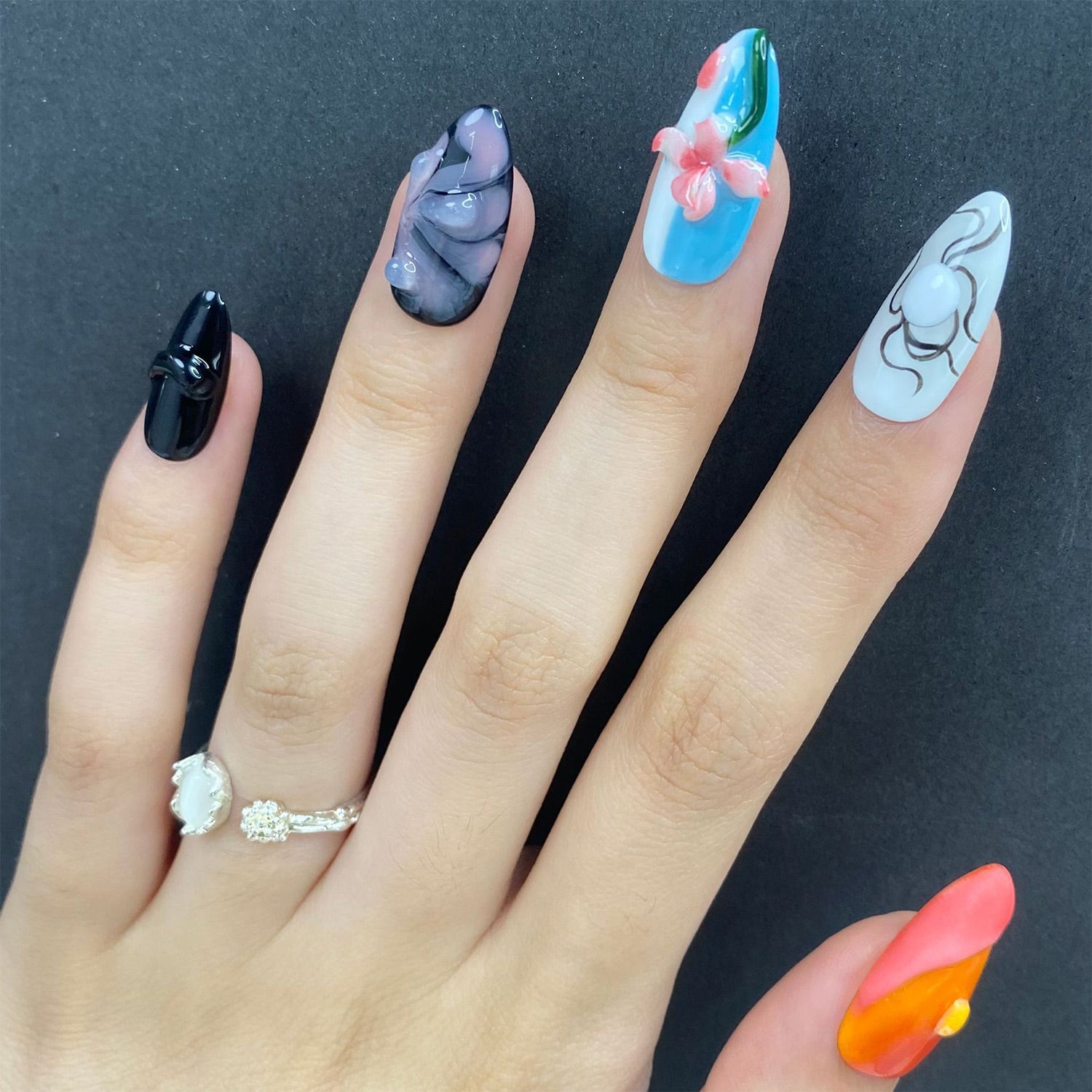This manicure is a playful take on abstract art, with a mix of vibrant and dark tones. The liquid-like 3D accents and hand-painted details make this a truly expressive and fun design.