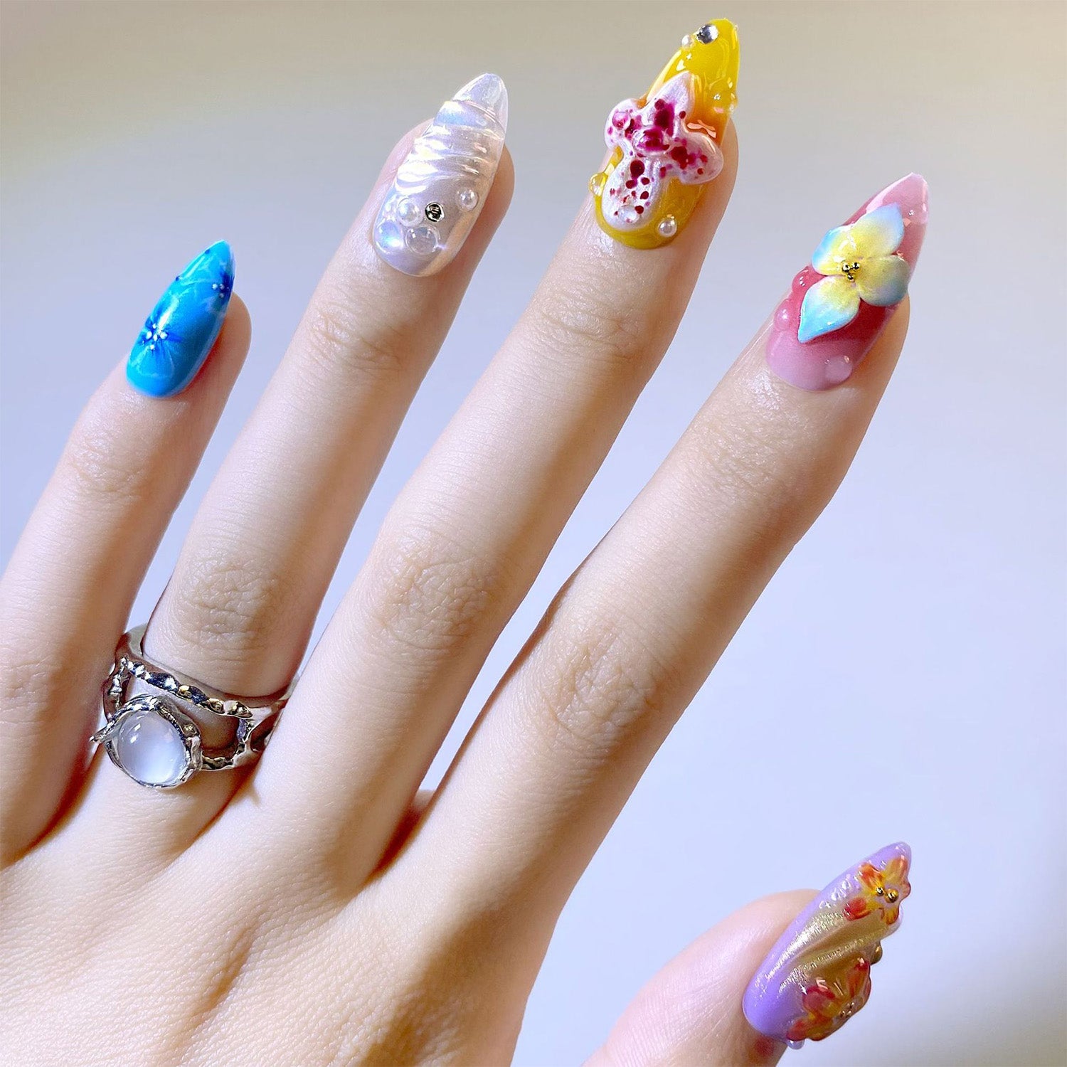 This design captures the magic of a hidden meadow with its vibrant, 3D floral art. The mix of shapes and colors makes each nail a miniature work of art.