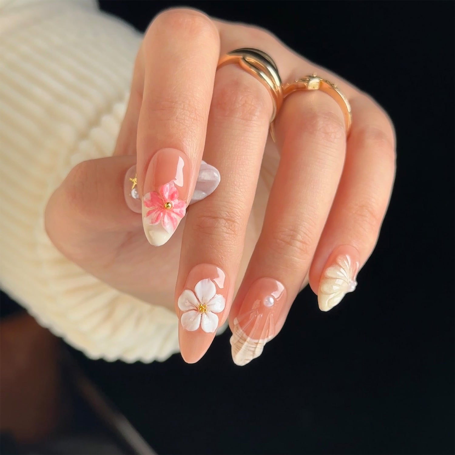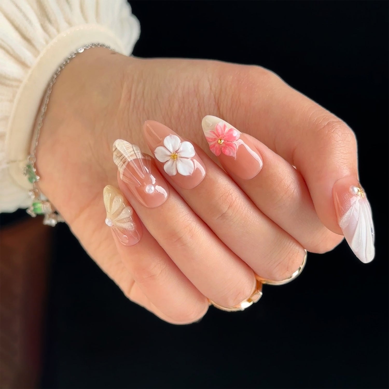 This whimsical and delicate design features beautiful 3D flowers and intricate, sculpted feather and shell details. The soft, translucent base and gentle pink tones create a magical, fairy-tale vibe.