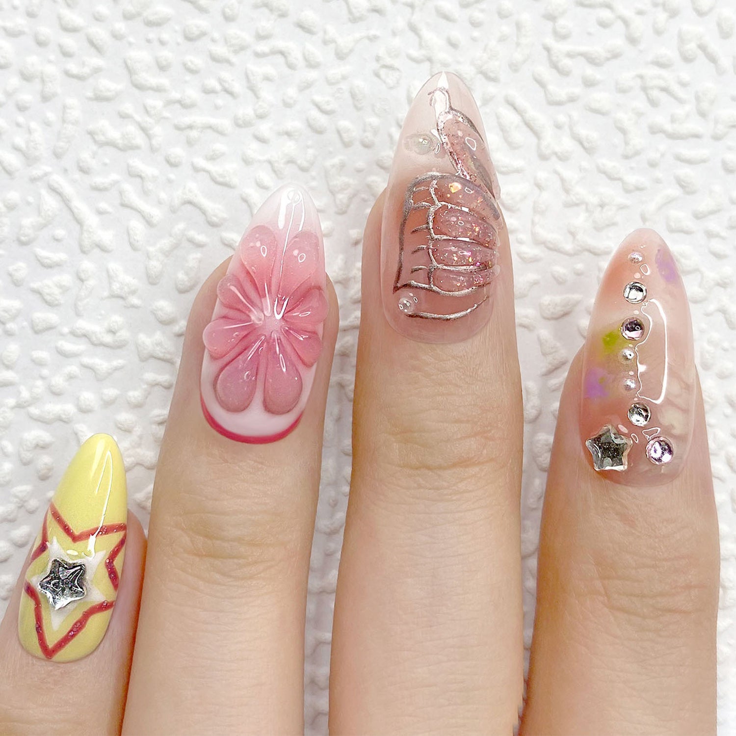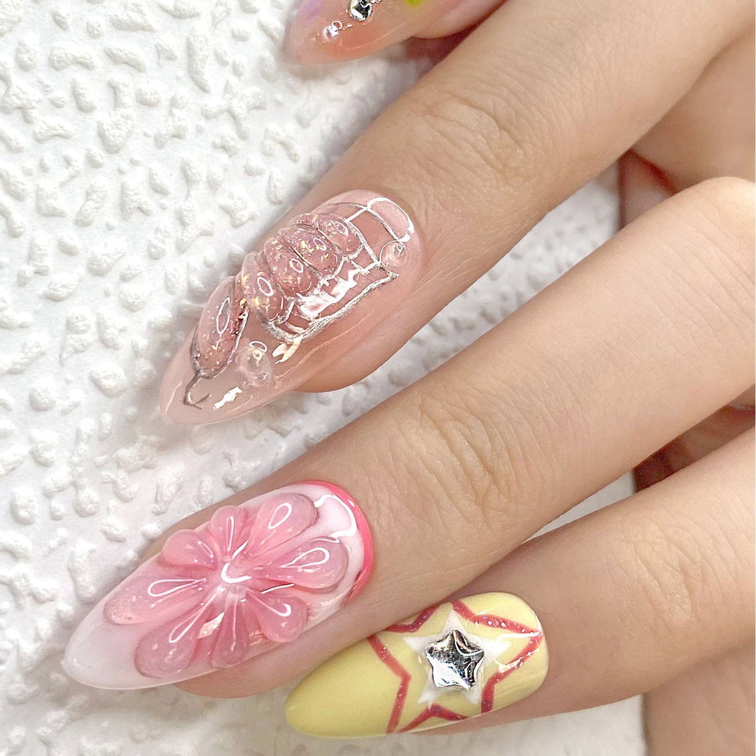 This manicure feels like a magical song with its blend of soft tones, delicate 3D elements, and shimmering gems. The design is both intricate and fun, perfect for adding a touch of fantasy to your style.