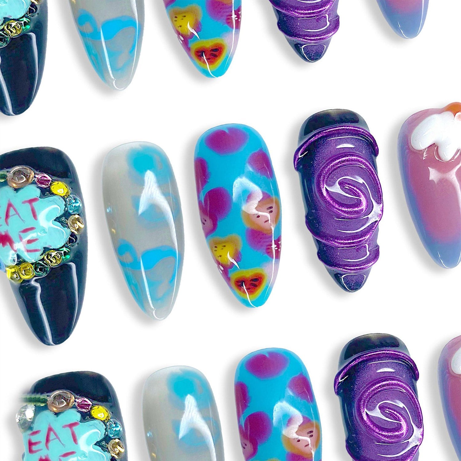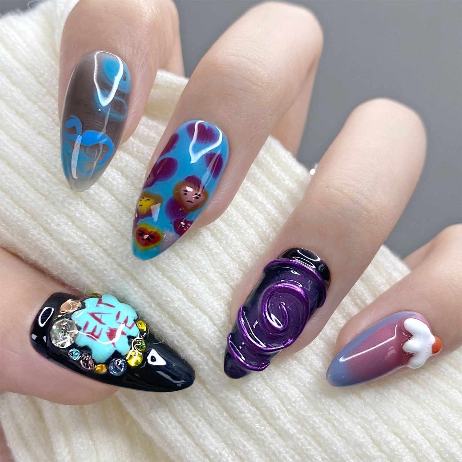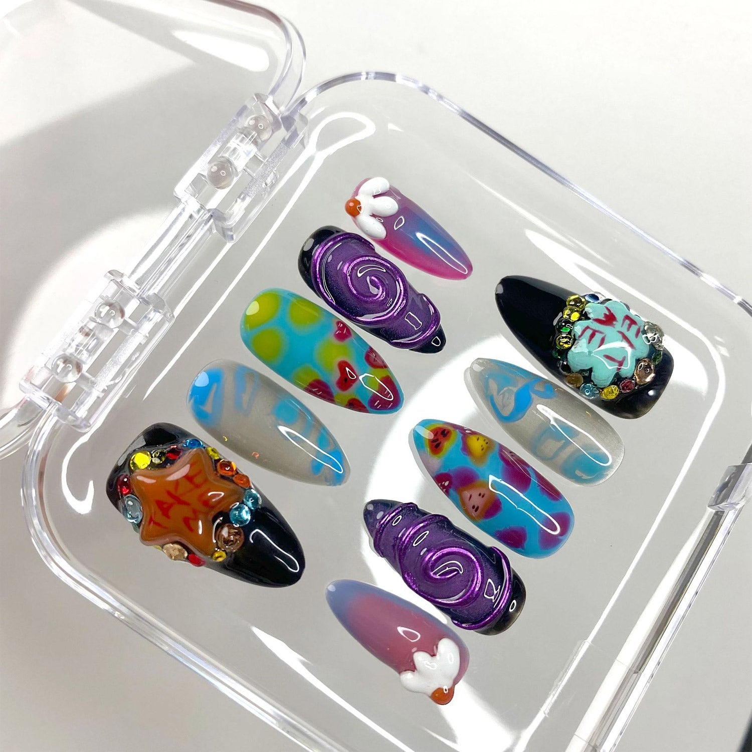 Inspired by modern art, this design features a bold contrast of bright hues and dark bases, with a mix of geometric shapes and whimsical 3D adornments. It’s an expressive and fun look for those who love to stand out.
