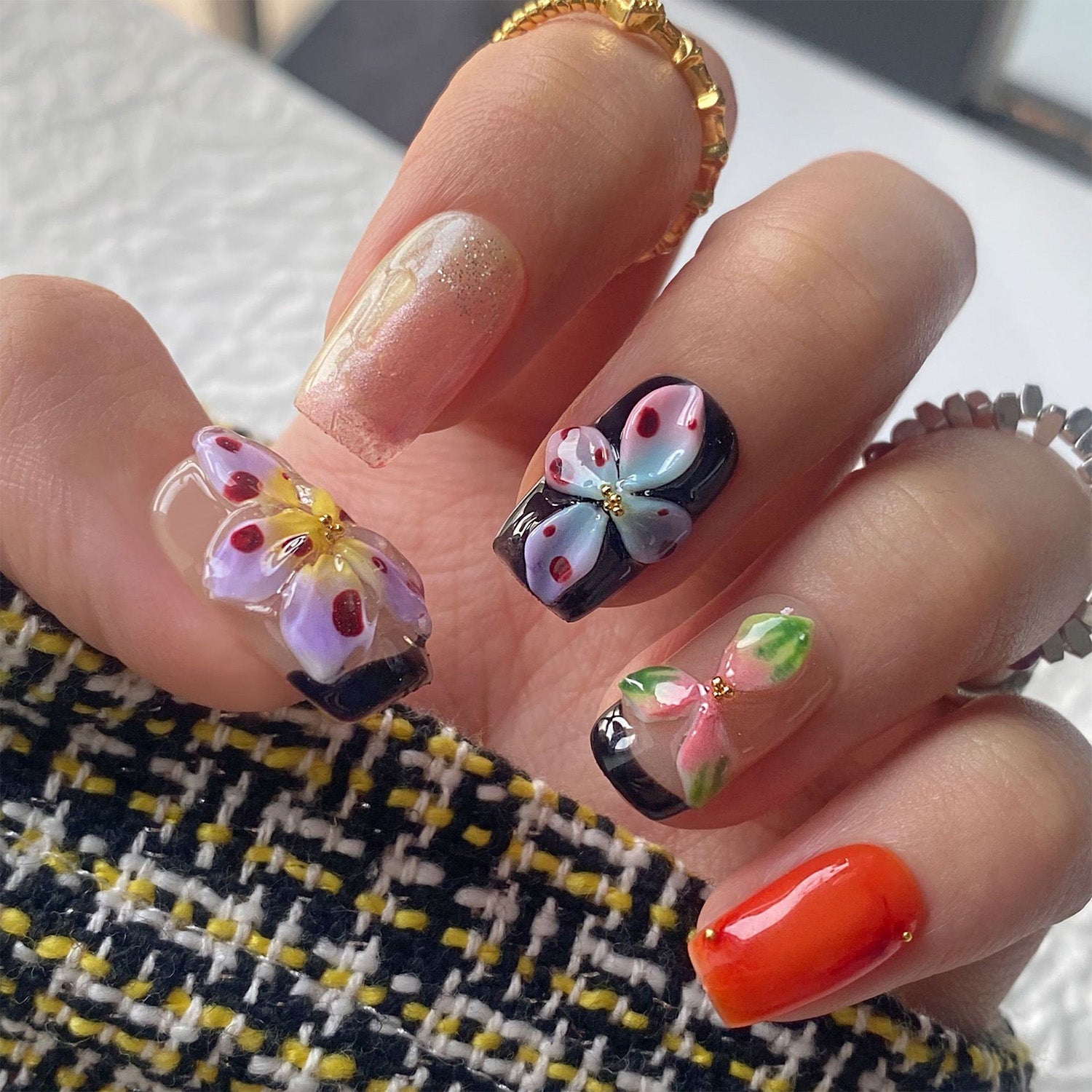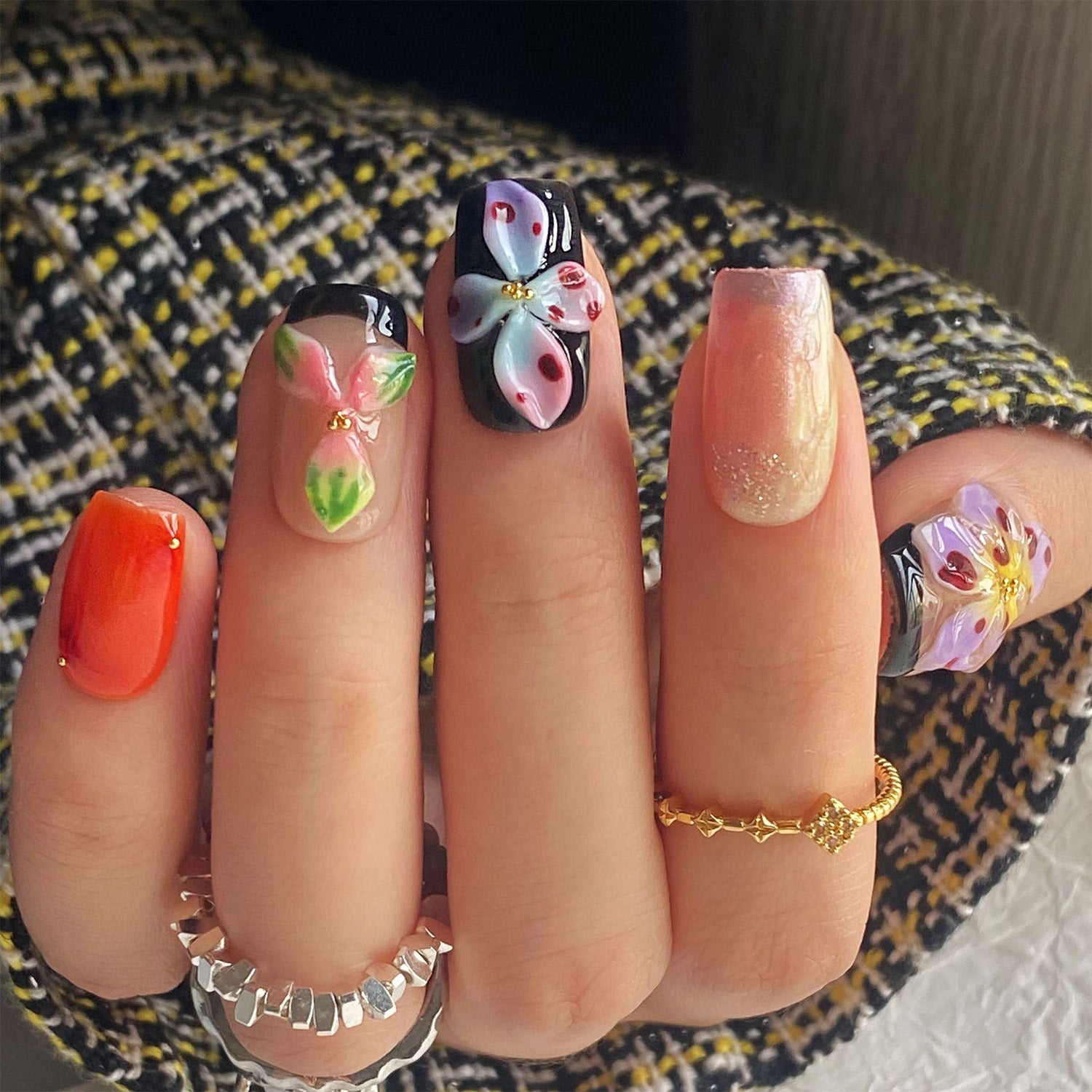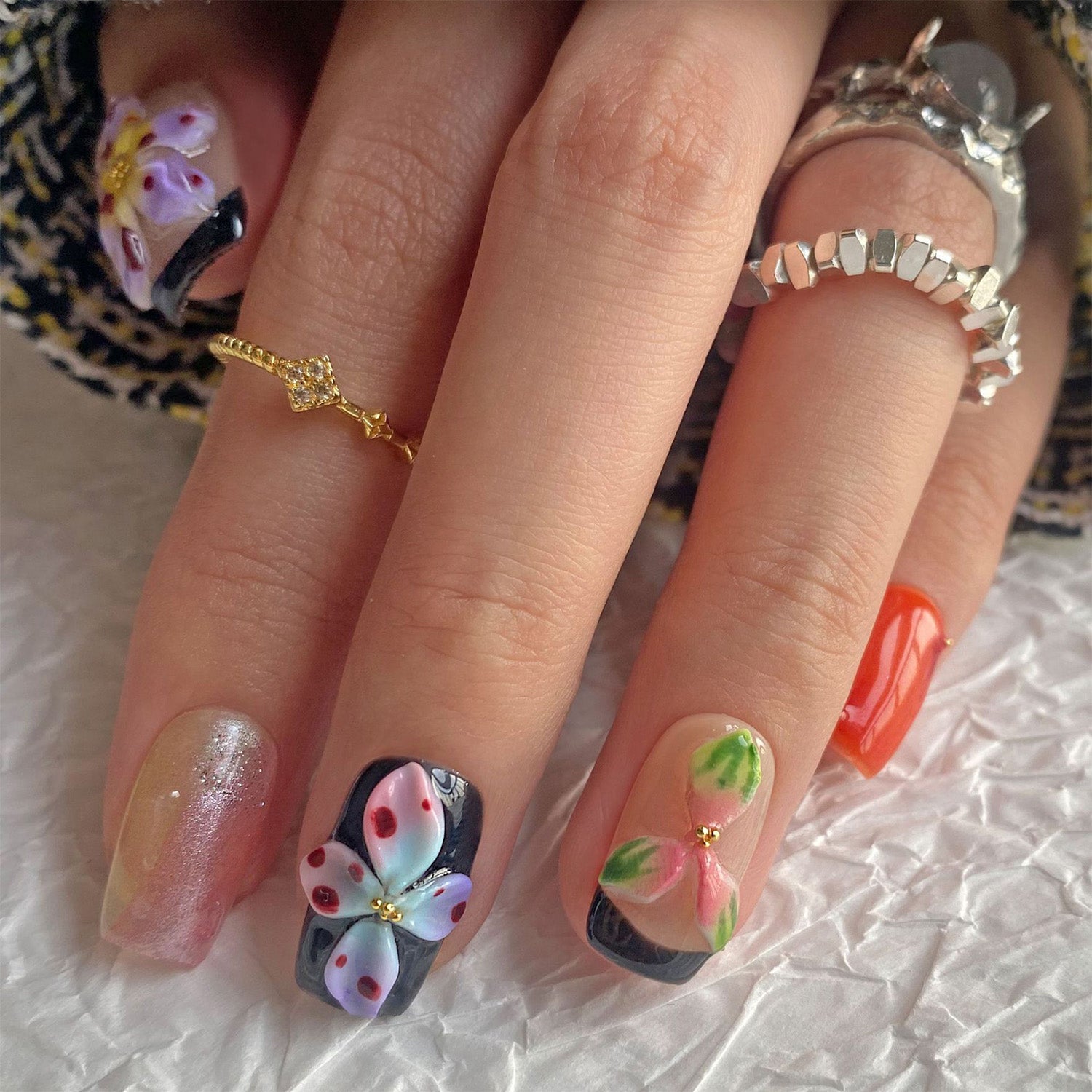 These nails mix soft pastel pink and sparkly nude bases with sharp black tips for a striking contrast. Intricate 3D flowers add vibrant pops of color against the bold background.