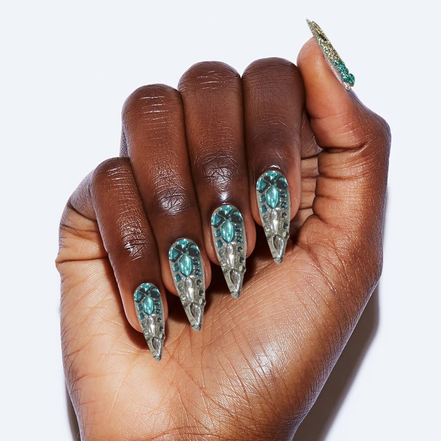 Inspired by gemstones and ocean hues, this nail set combines aqua stones with clear crystals for a high-shine finish that catches the light at every angle.