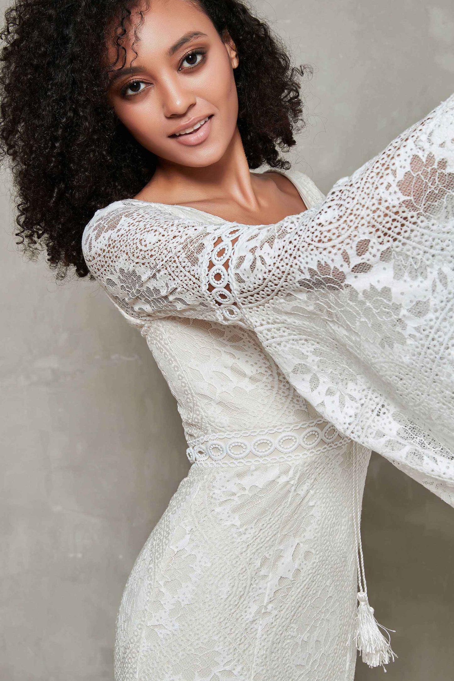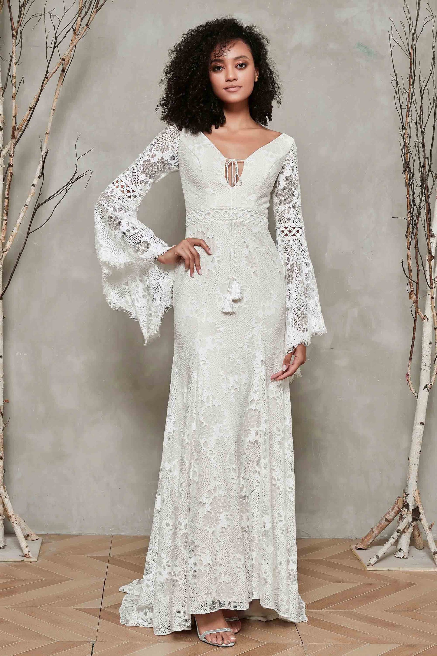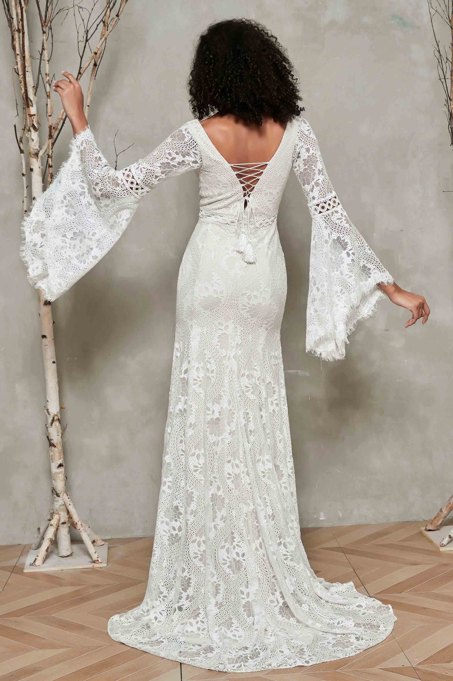 Natalia owns beautiful appliqued lace and a long trailing. The wide flowy cuffs and rich lace details of long sleeves is really impressed. The unique string with two knots can adjust the depth of the V neckline and back V.