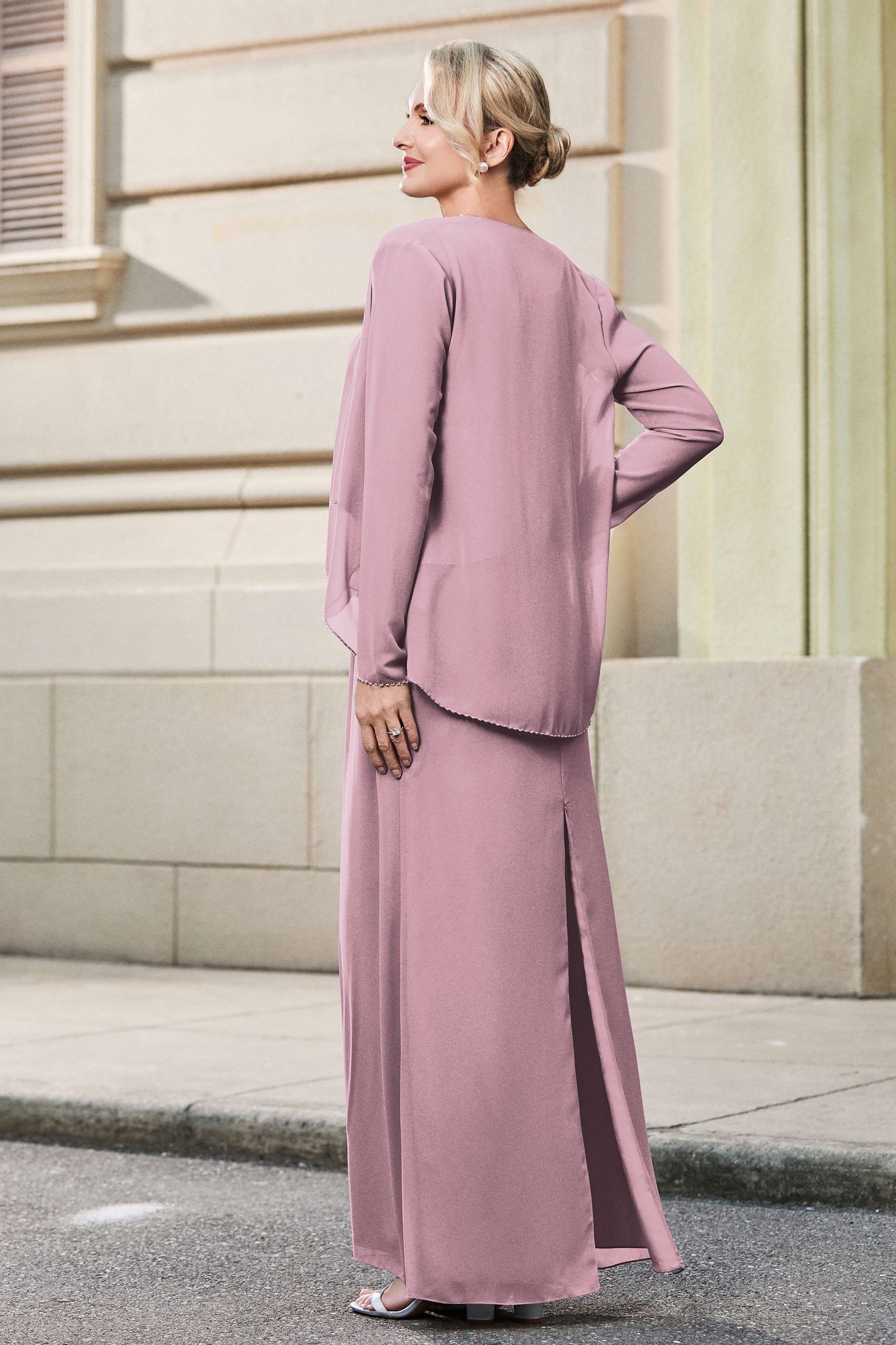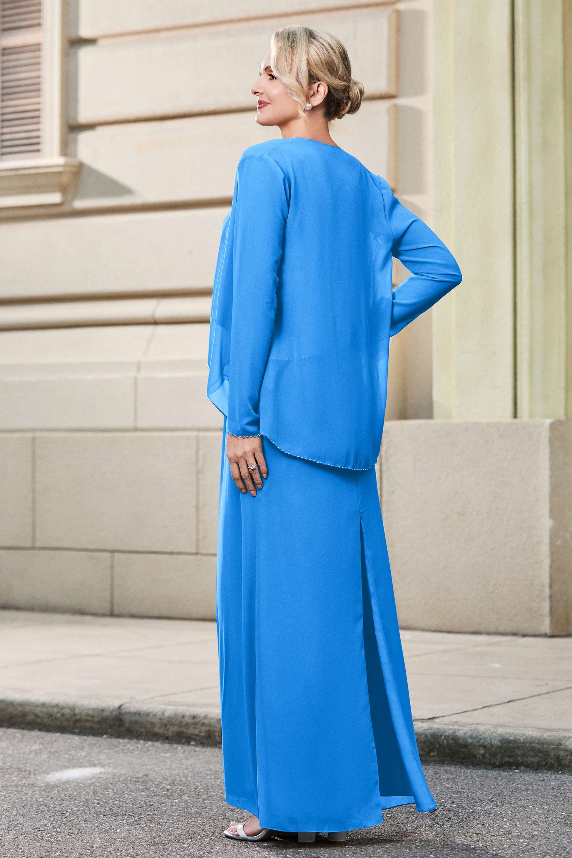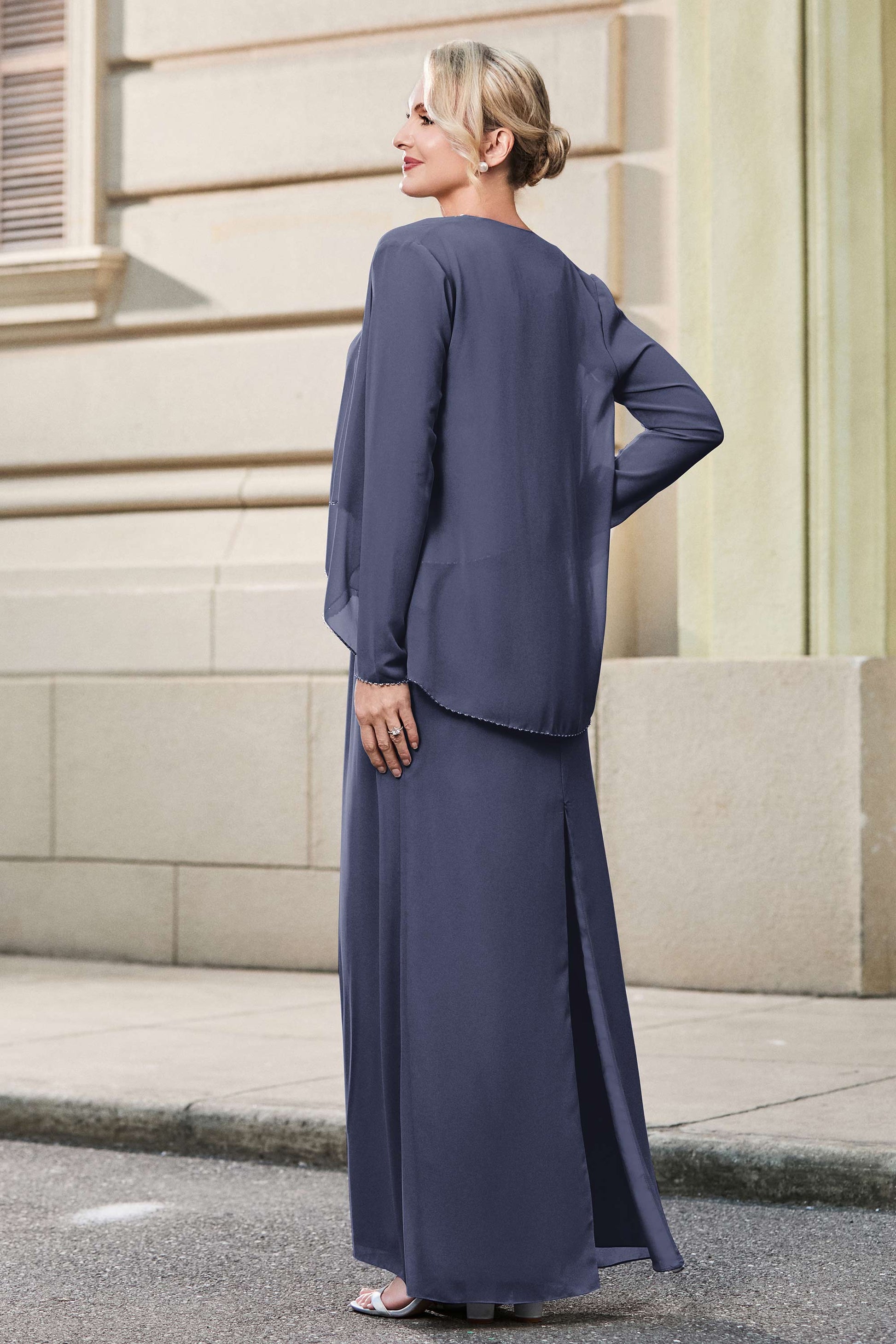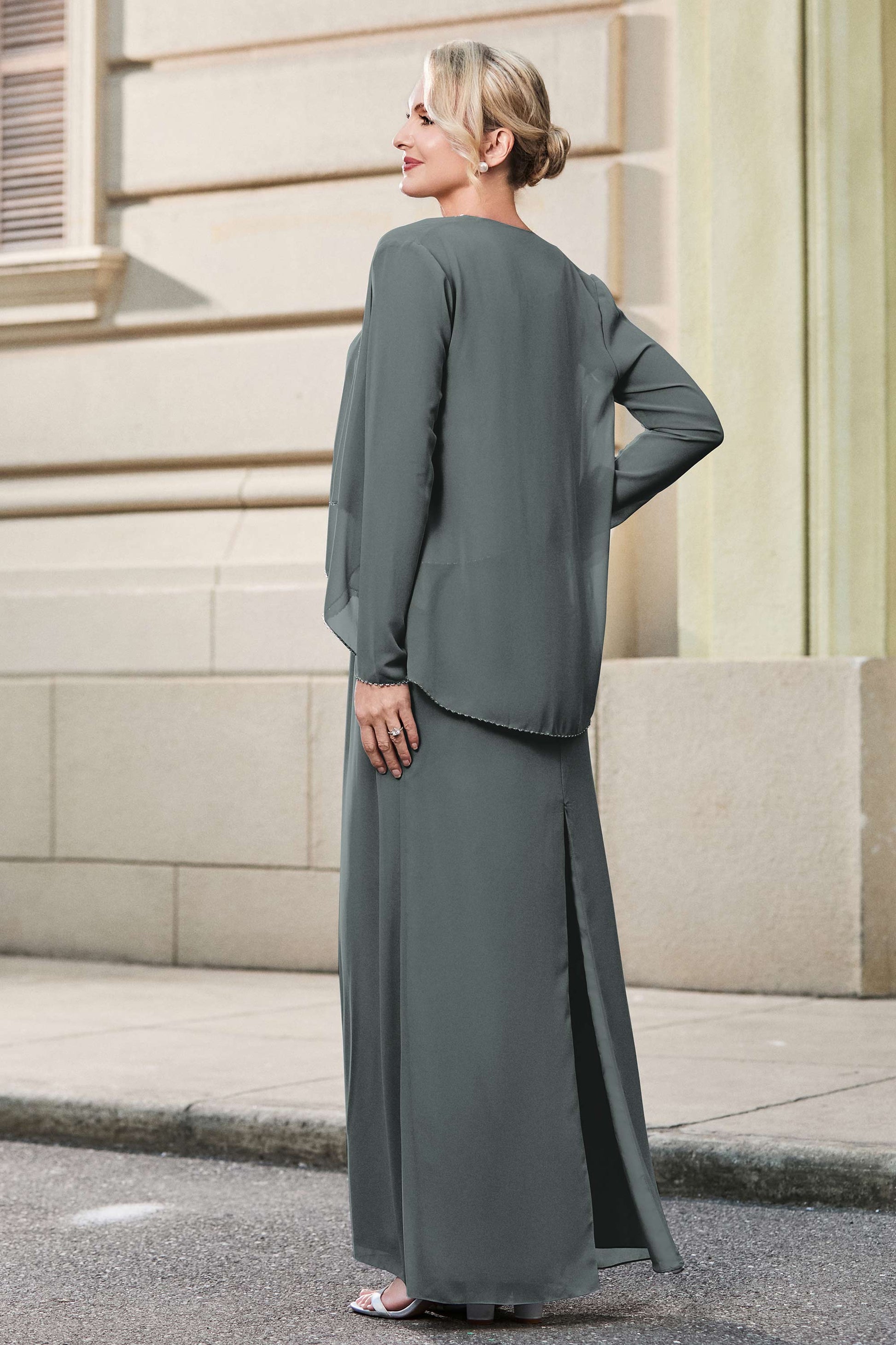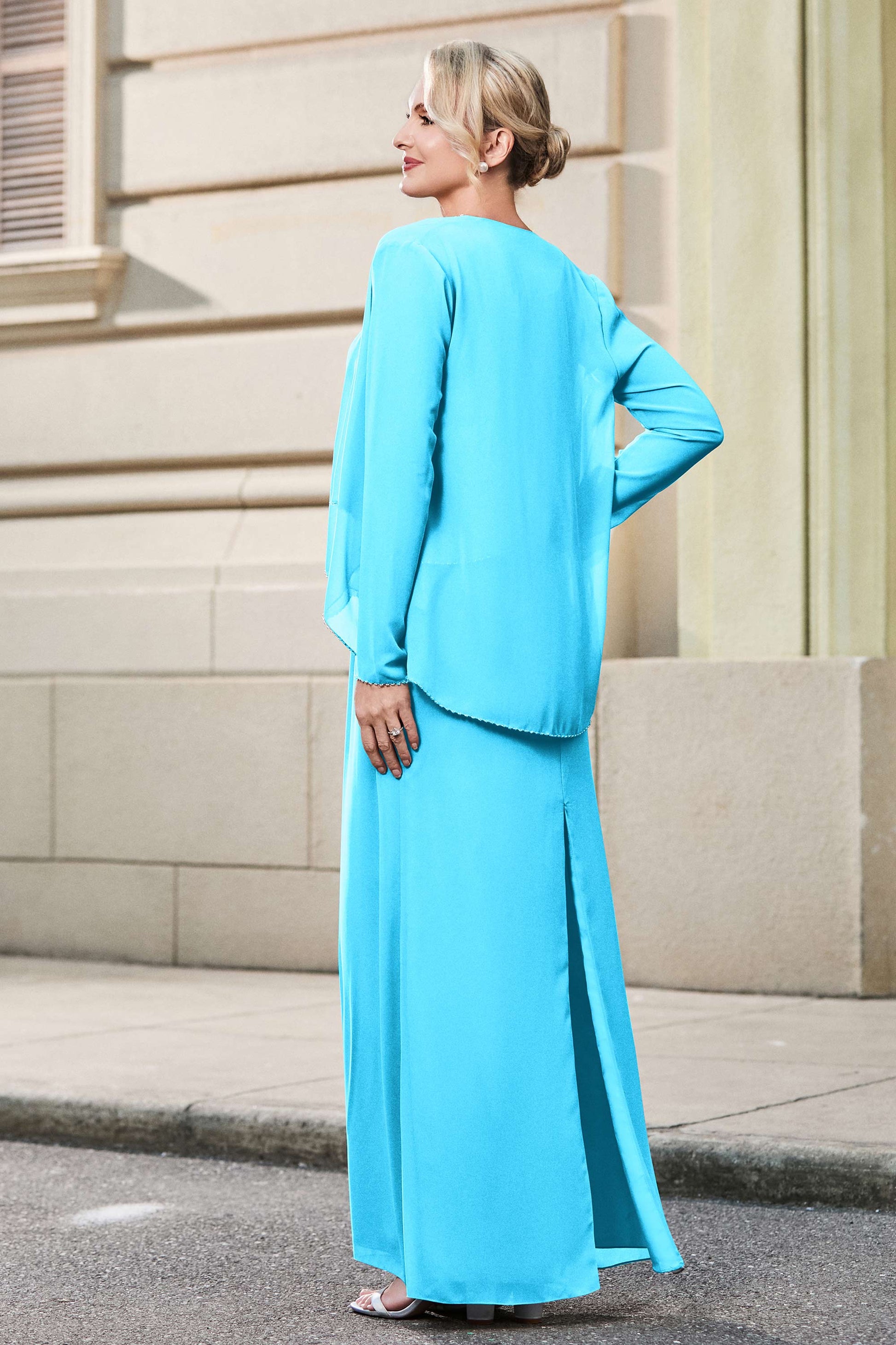This dress offers an effortlessly chic and sophisticated look. The scoop neckline adds a flattering touch, while the back slit provides a modern, daring twist. Paired with a matching jacket, this dress is perfect for those who seek elegance with a hint of contemporary style.