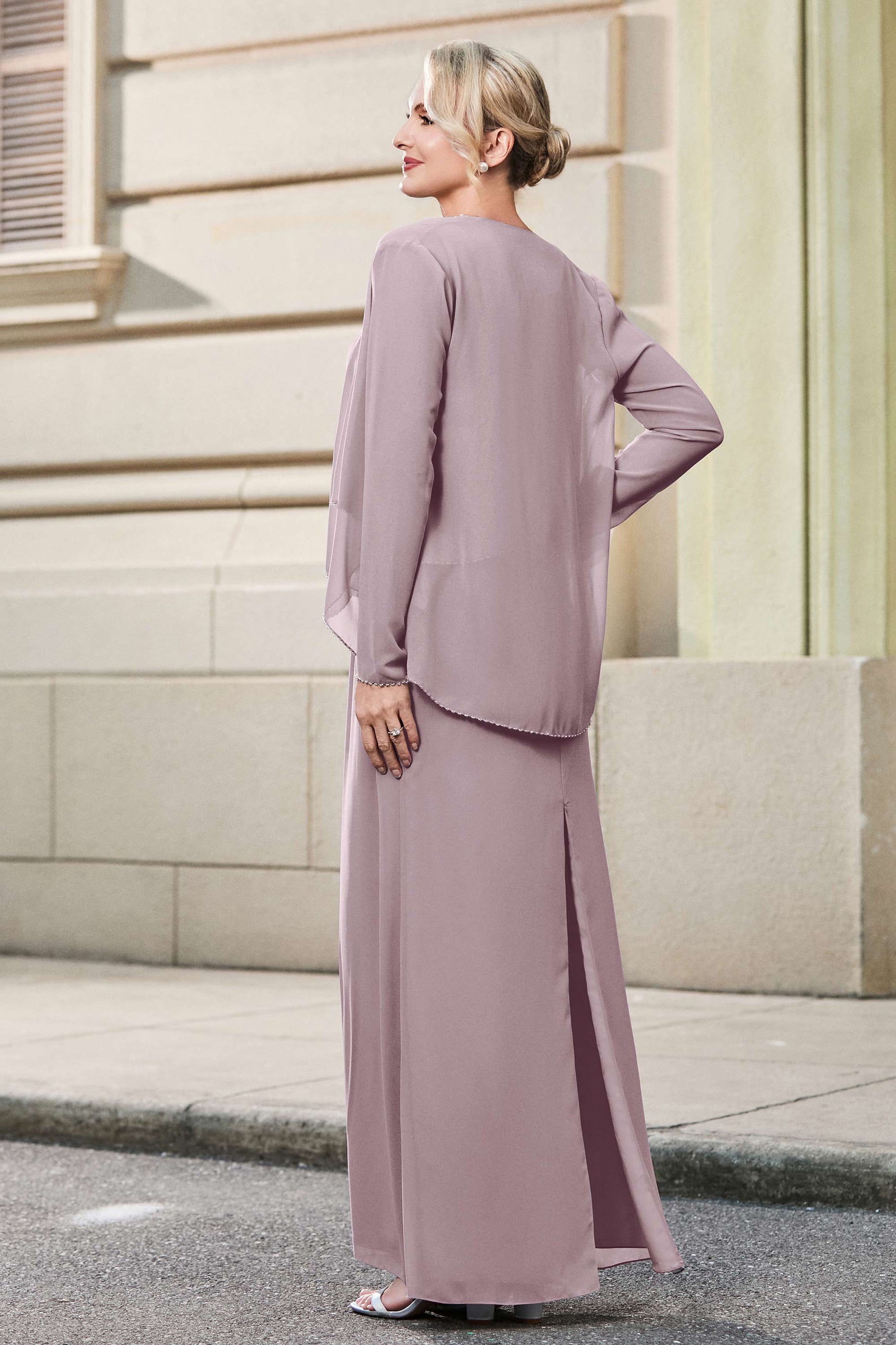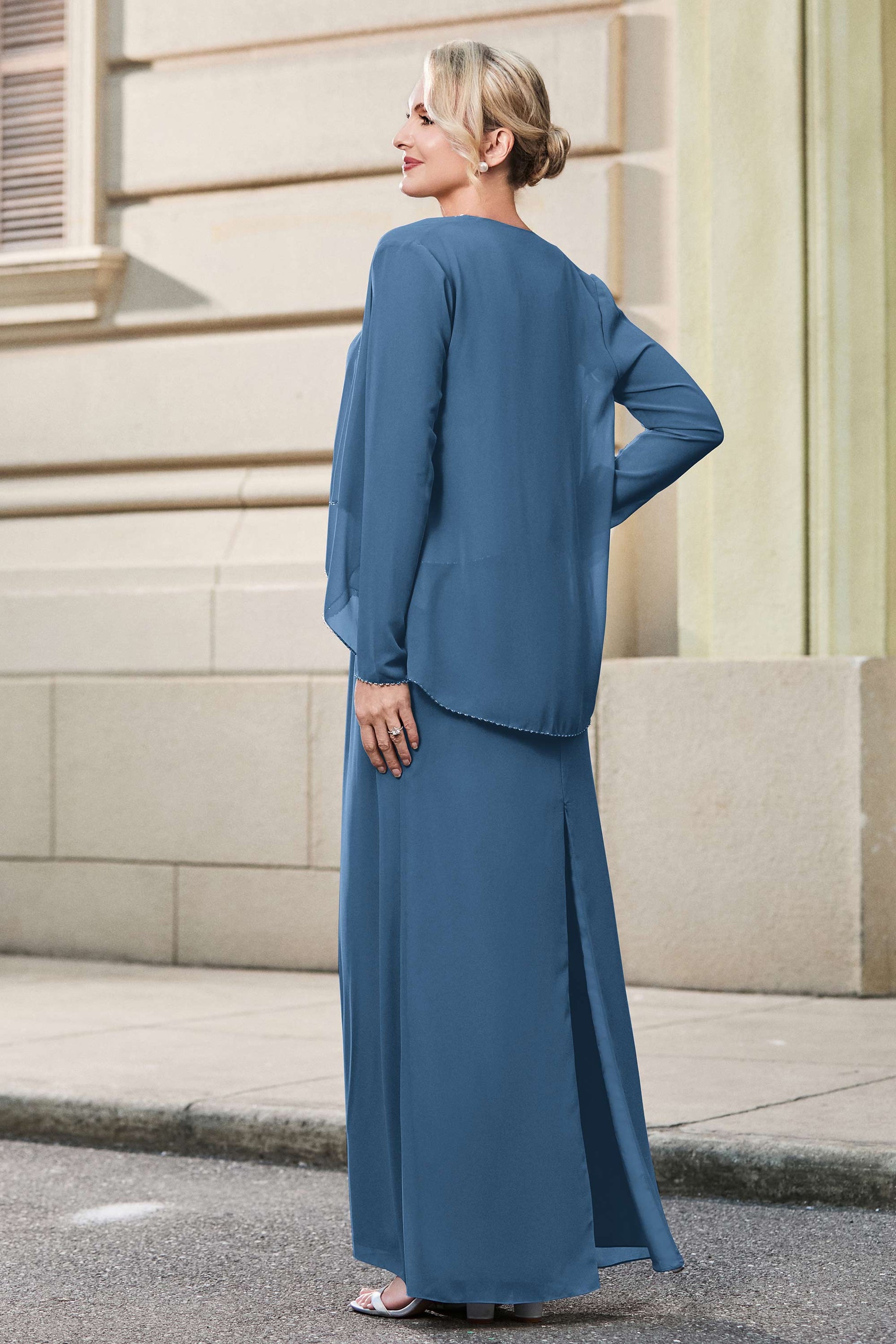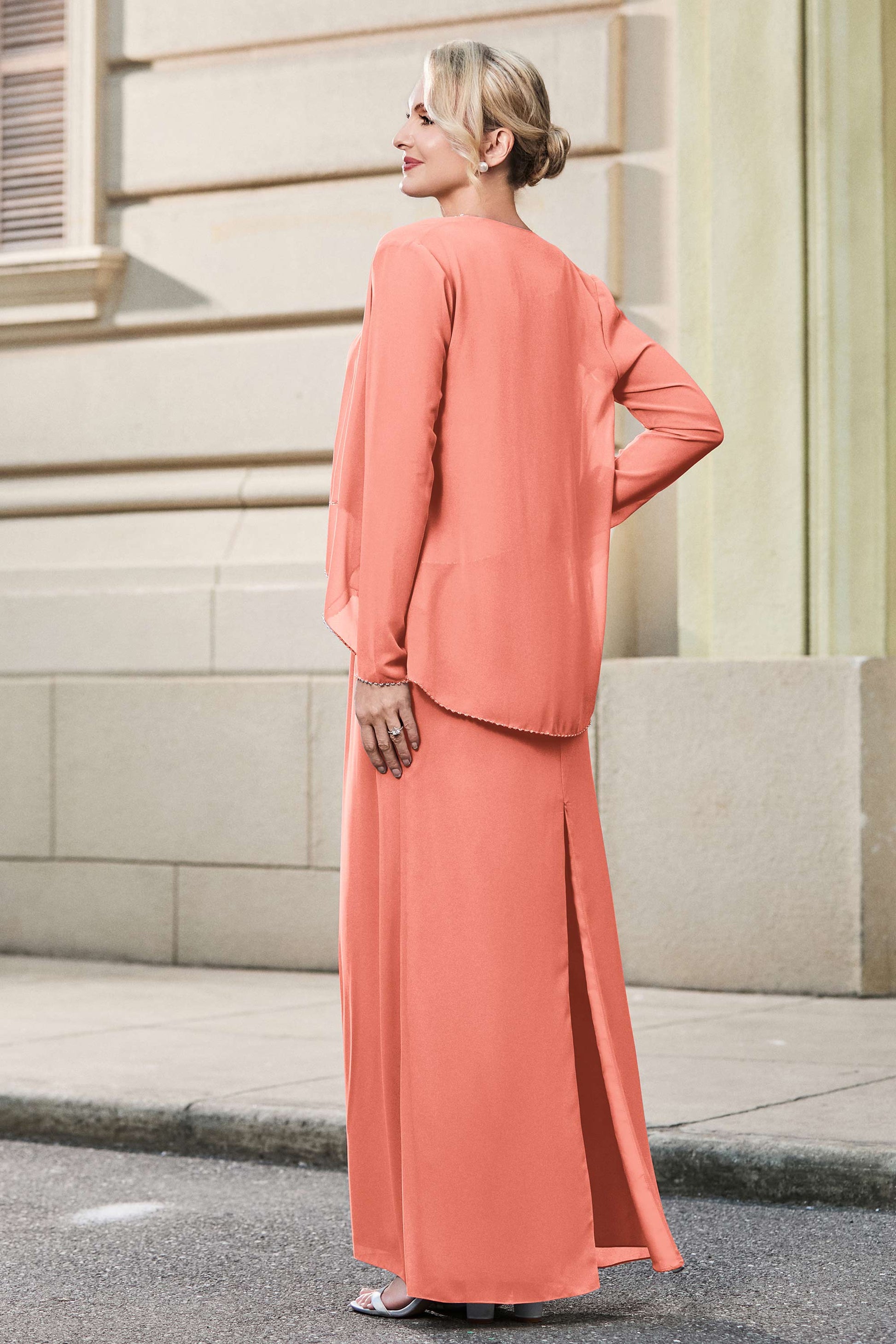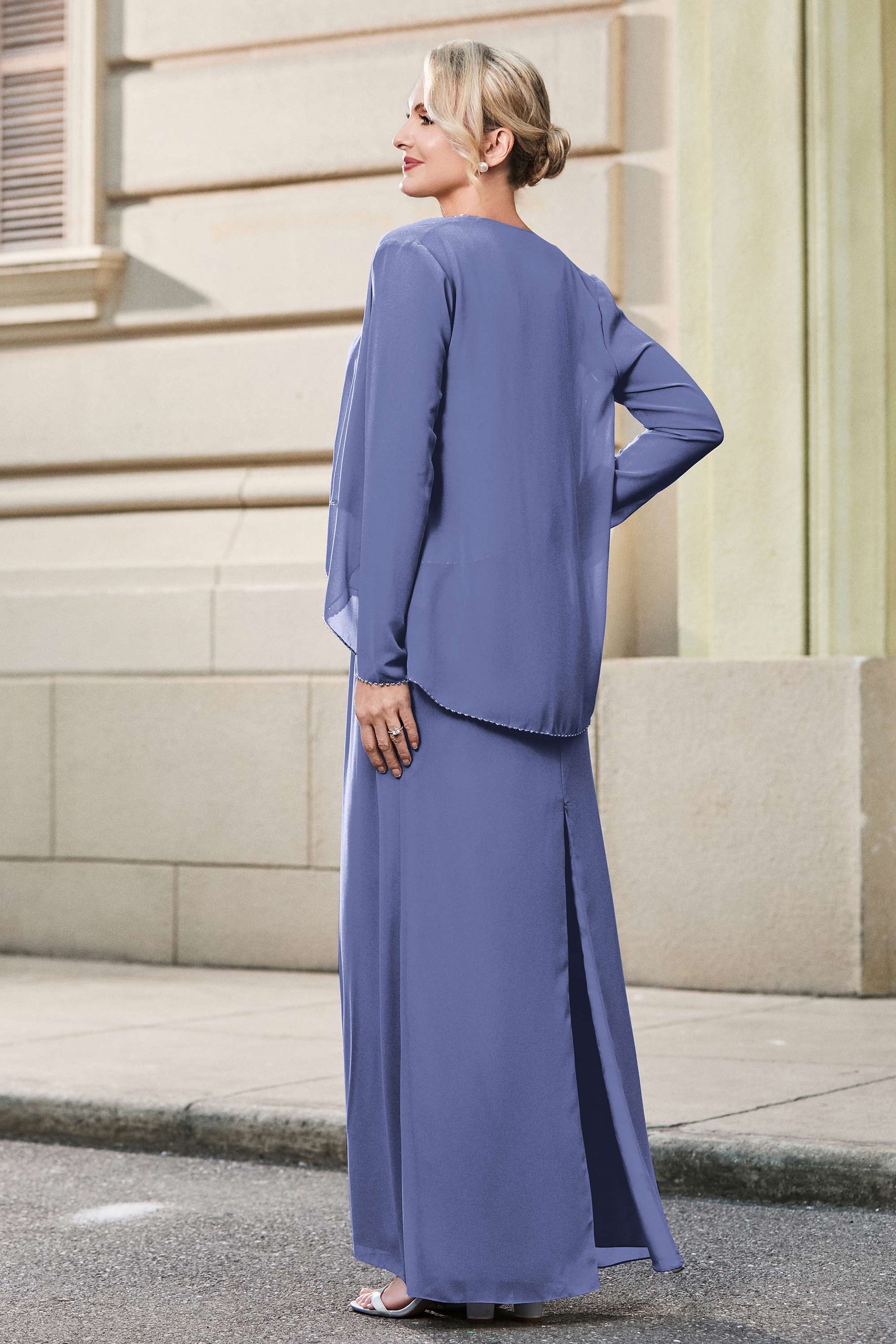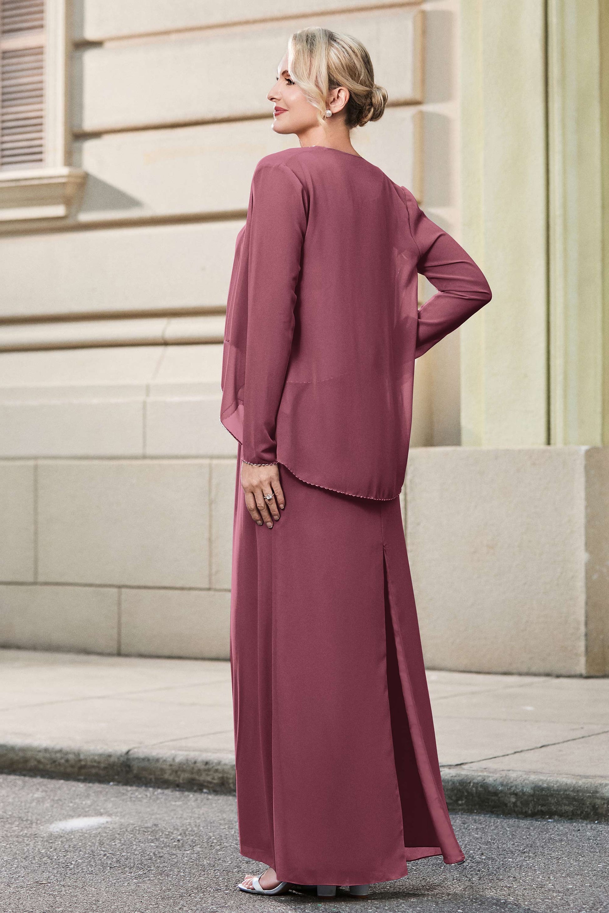 This dress offers an effortlessly chic and sophisticated look. The scoop neckline adds a flattering touch, while the back slit provides a modern, daring twist. Paired with a matching jacket, this dress is perfect for those who seek elegance with a hint of contemporary style.