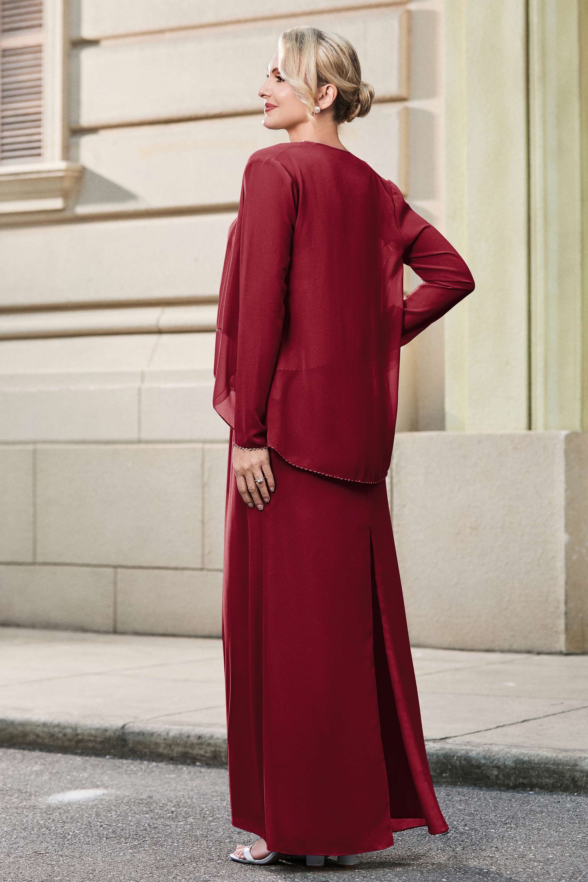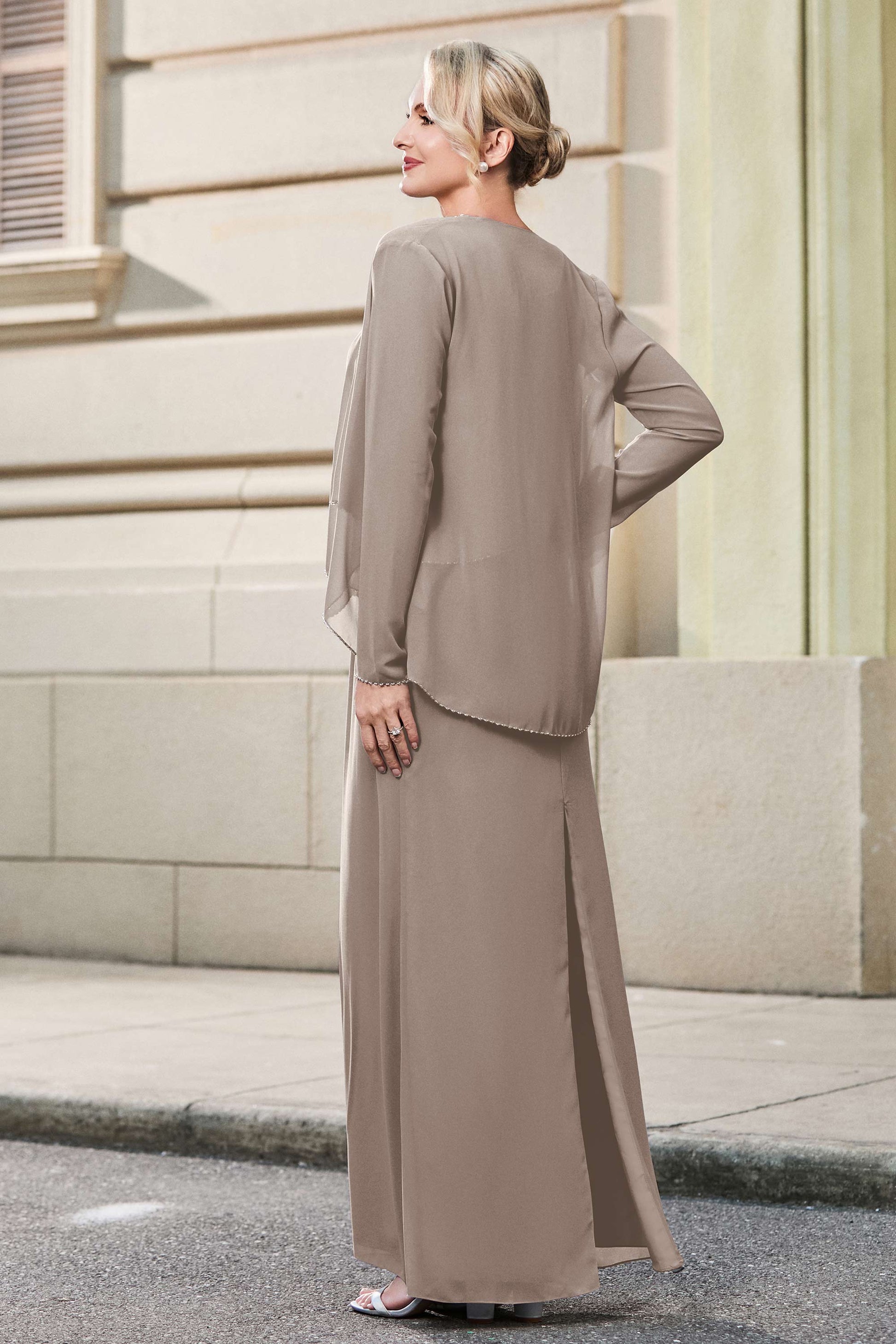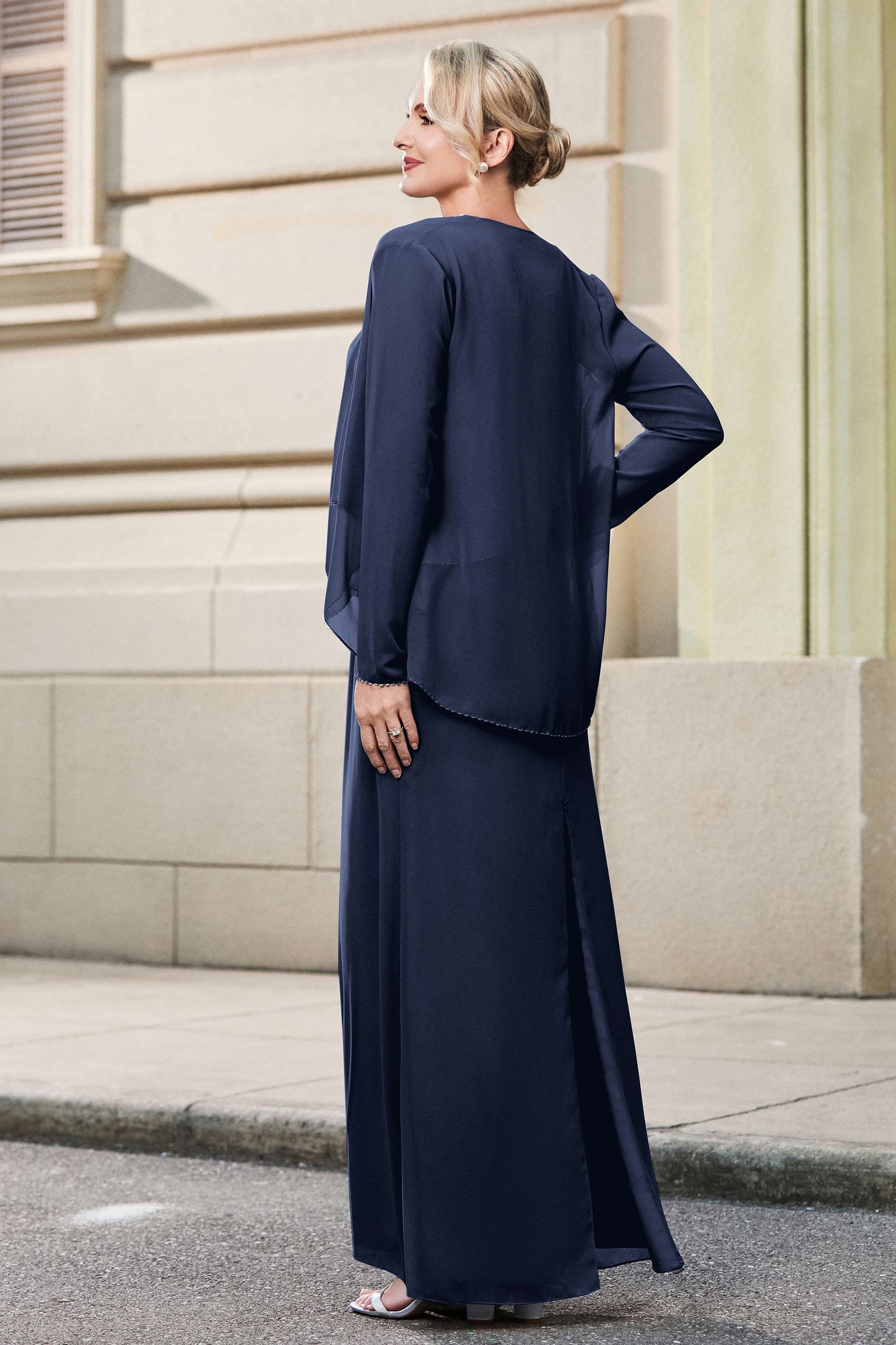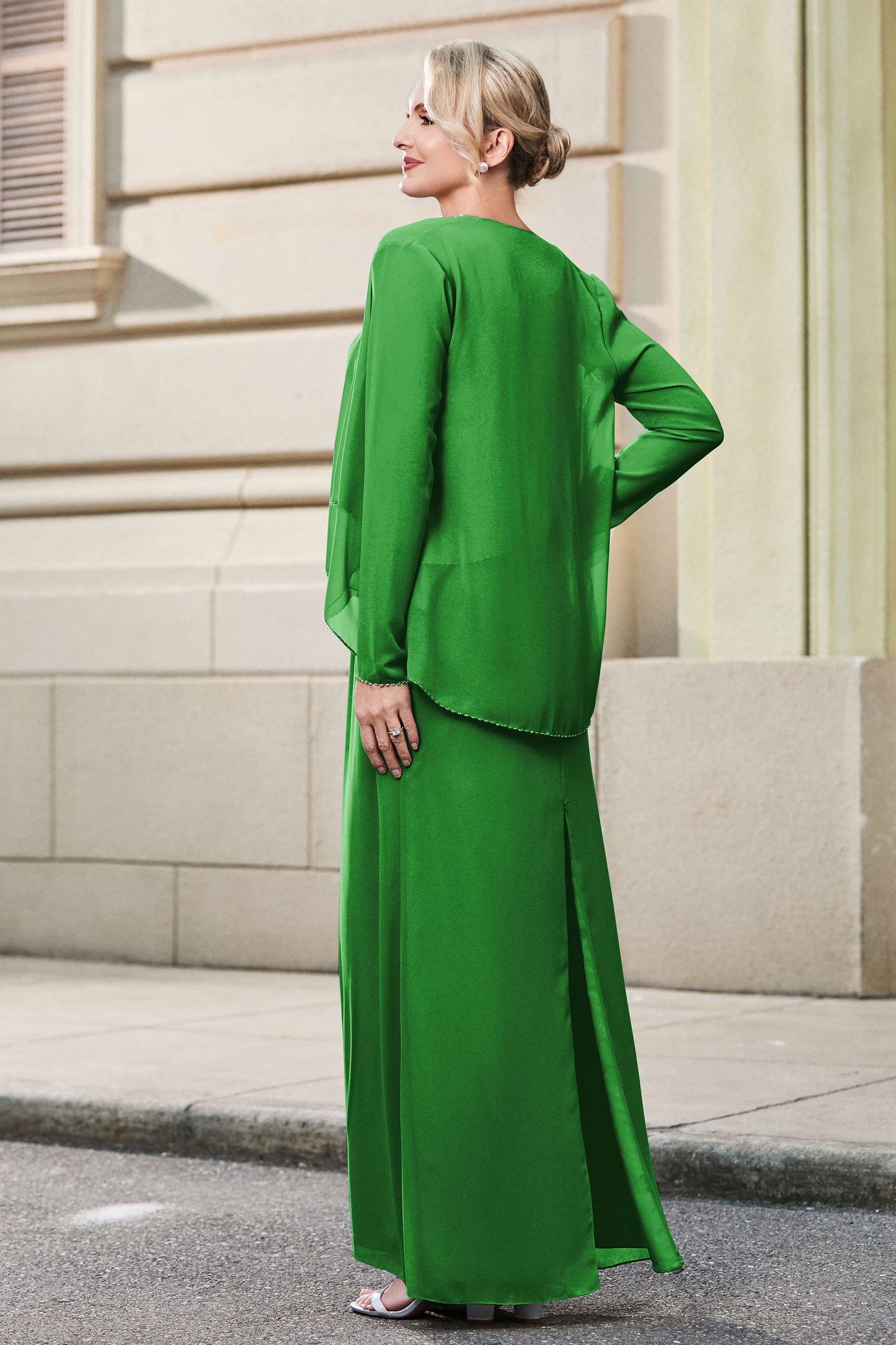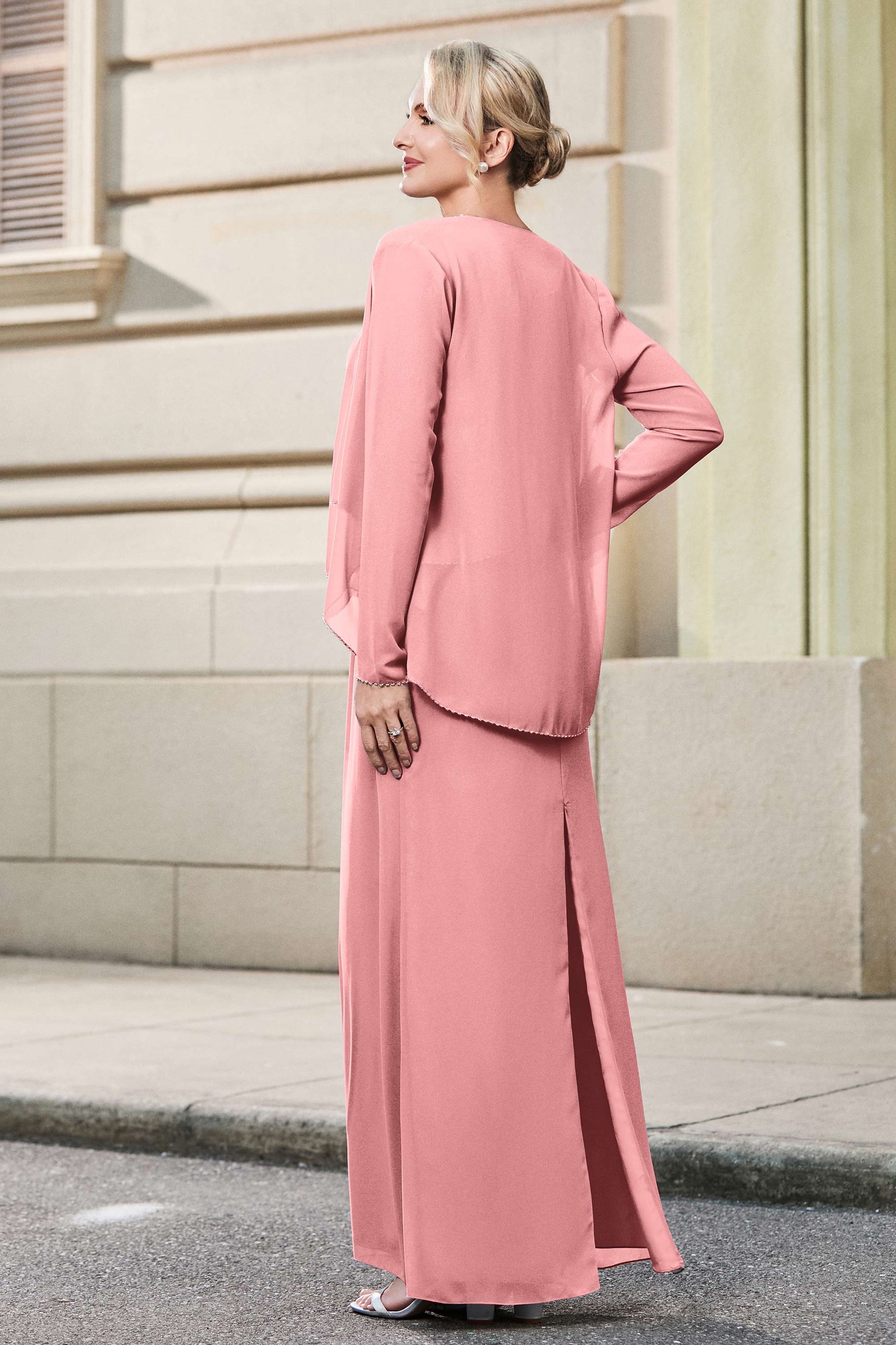 This dress offers an effortlessly chic and sophisticated look. The scoop neckline adds a flattering touch, while the back slit provides a modern, daring twist. Paired with a matching jacket, this dress is perfect for those who seek elegance with a hint of contemporary style.