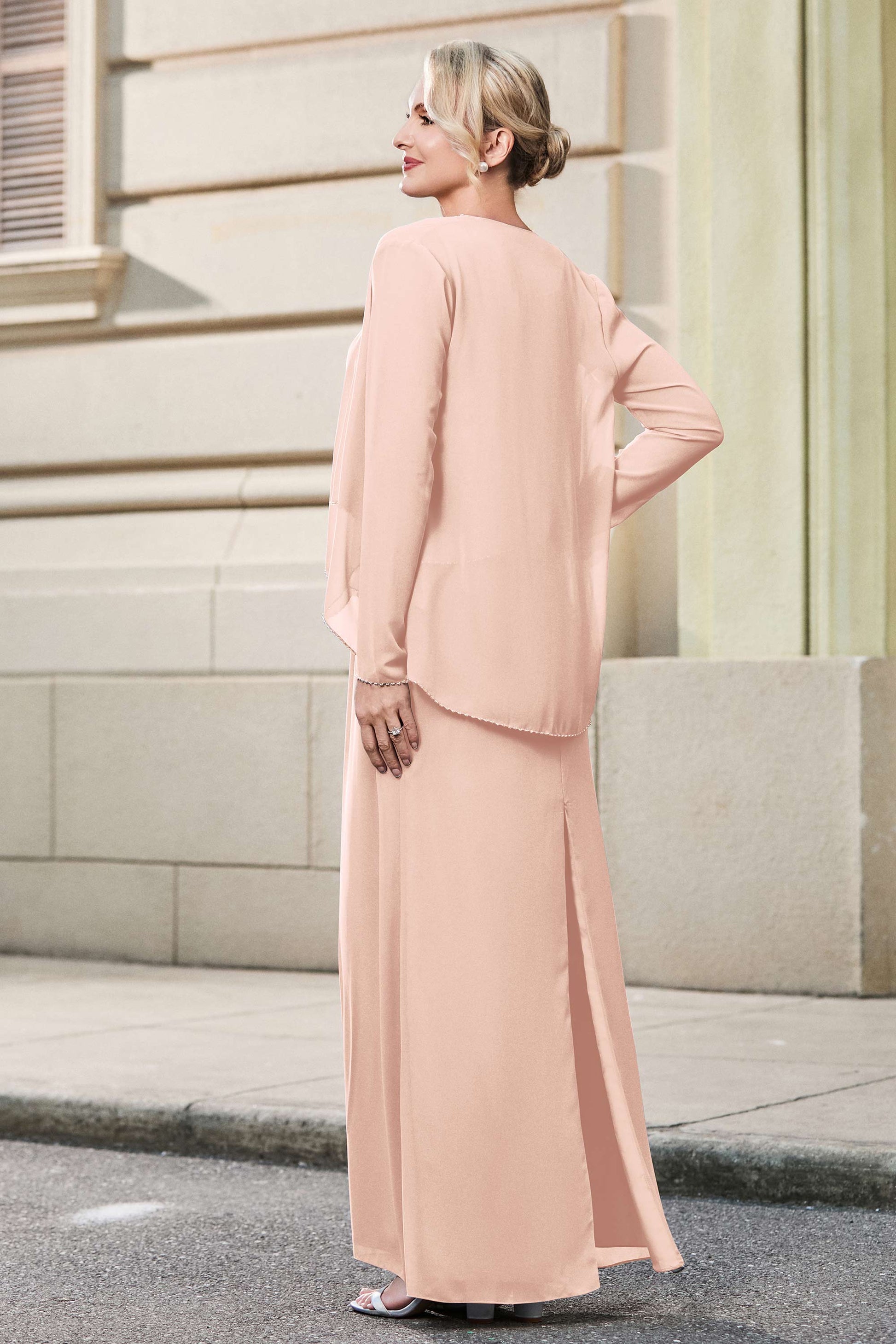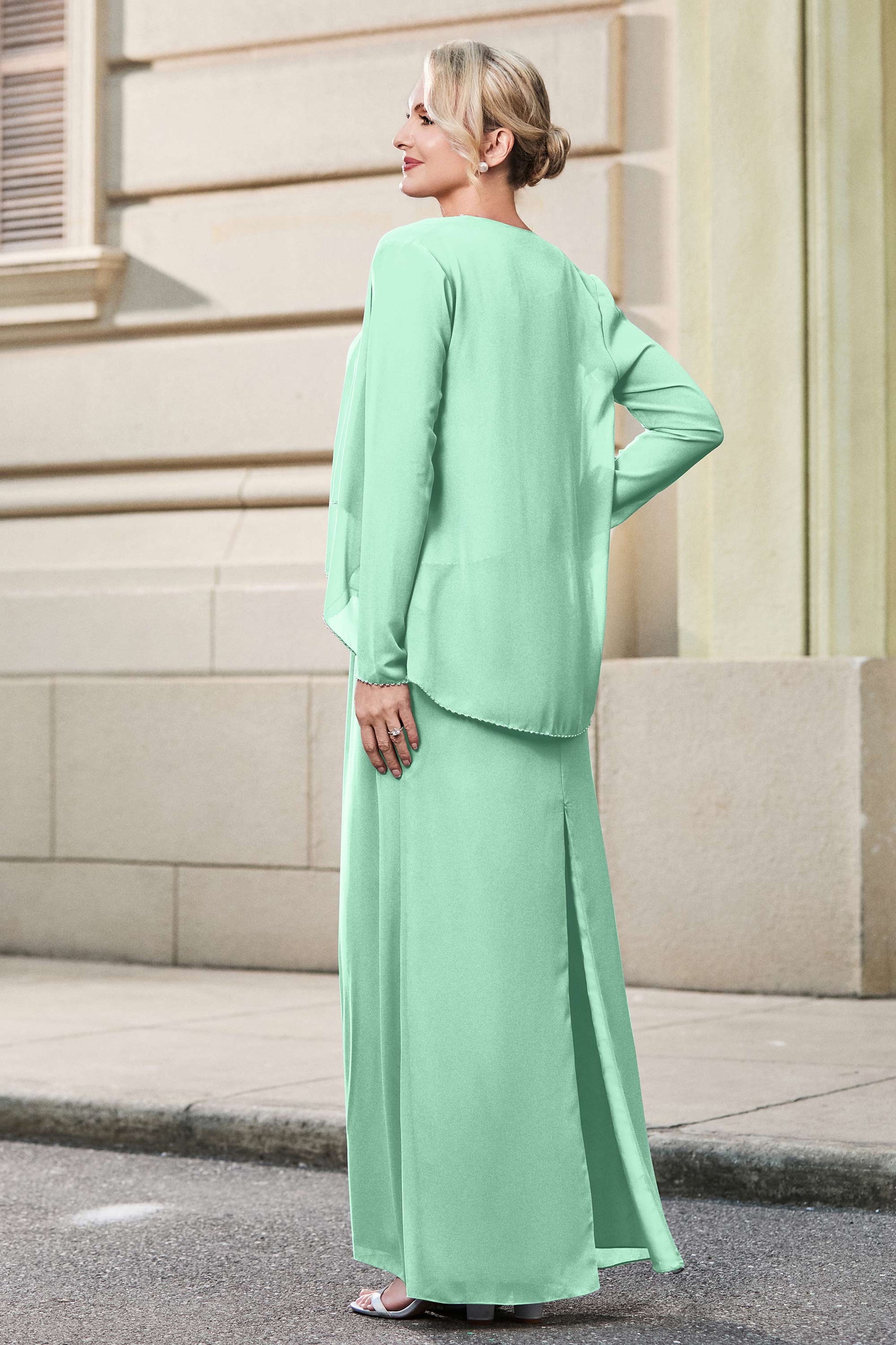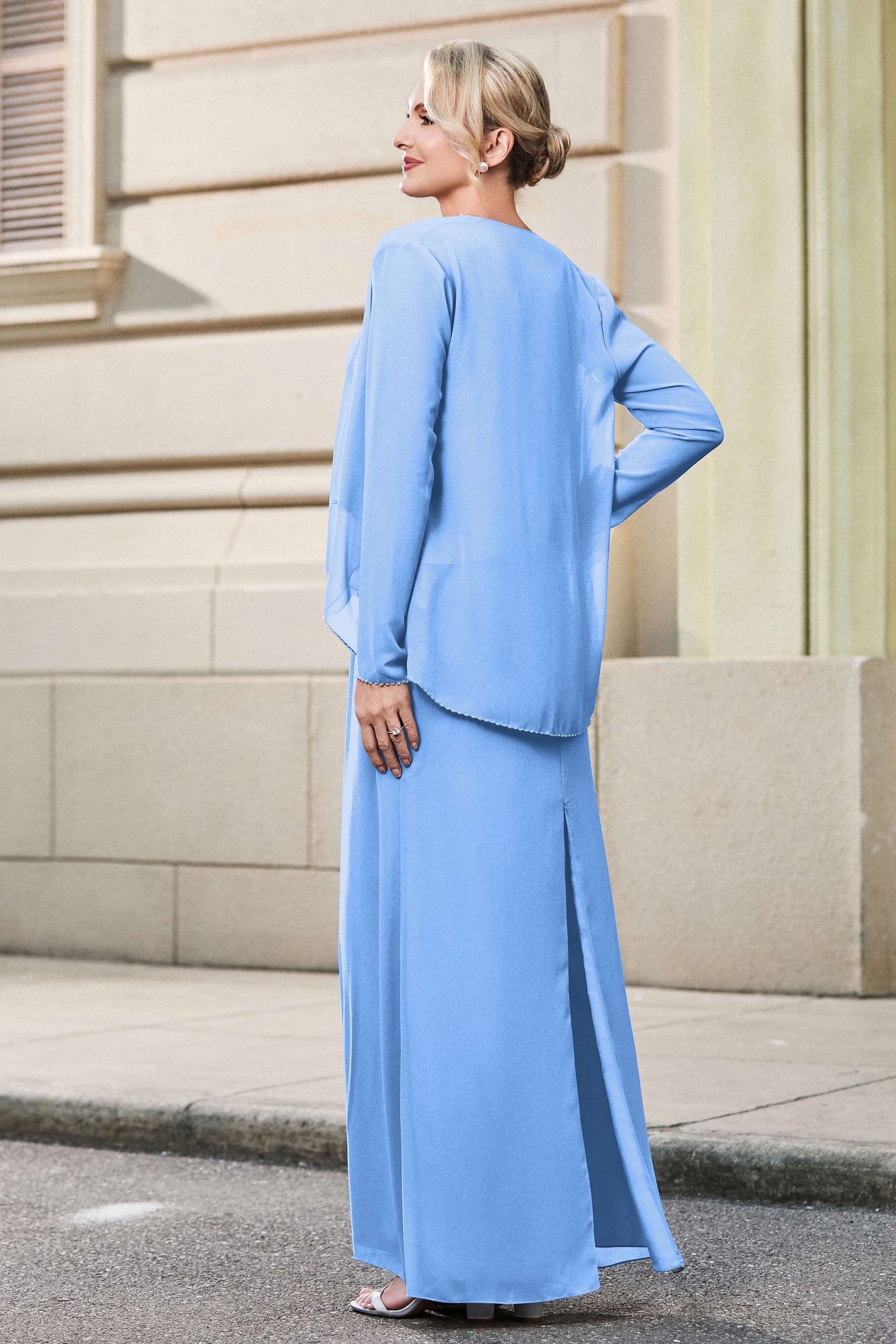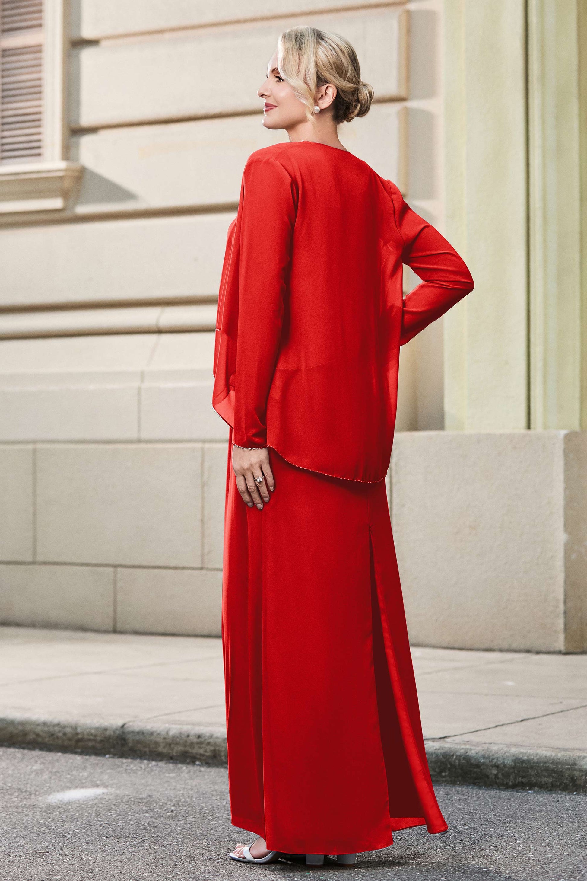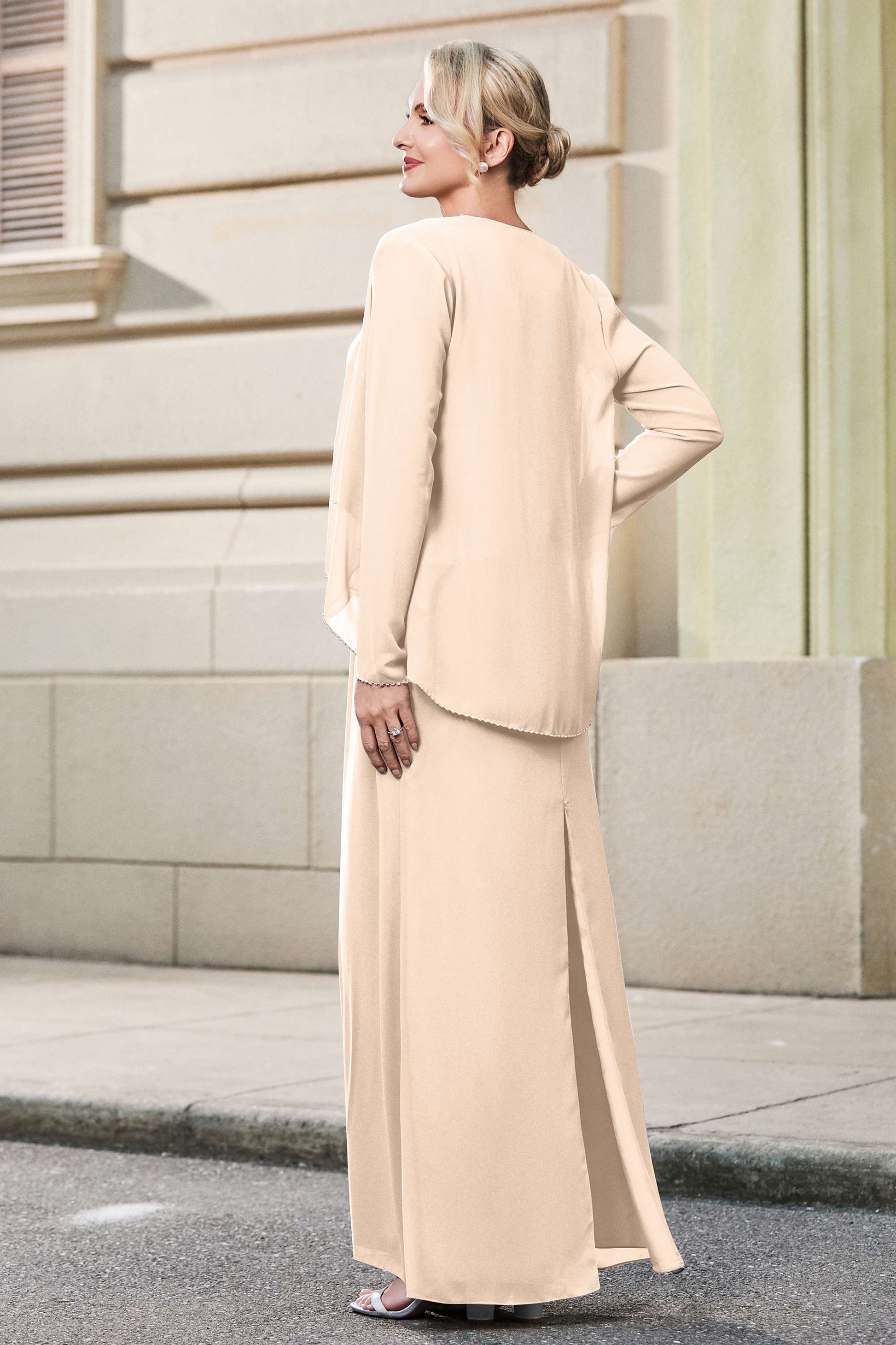 This dress offers an effortlessly chic and sophisticated look. The scoop neckline adds a flattering touch, while the back slit provides a modern, daring twist. Paired with a matching jacket, this dress is perfect for those who seek elegance with a hint of contemporary style.
