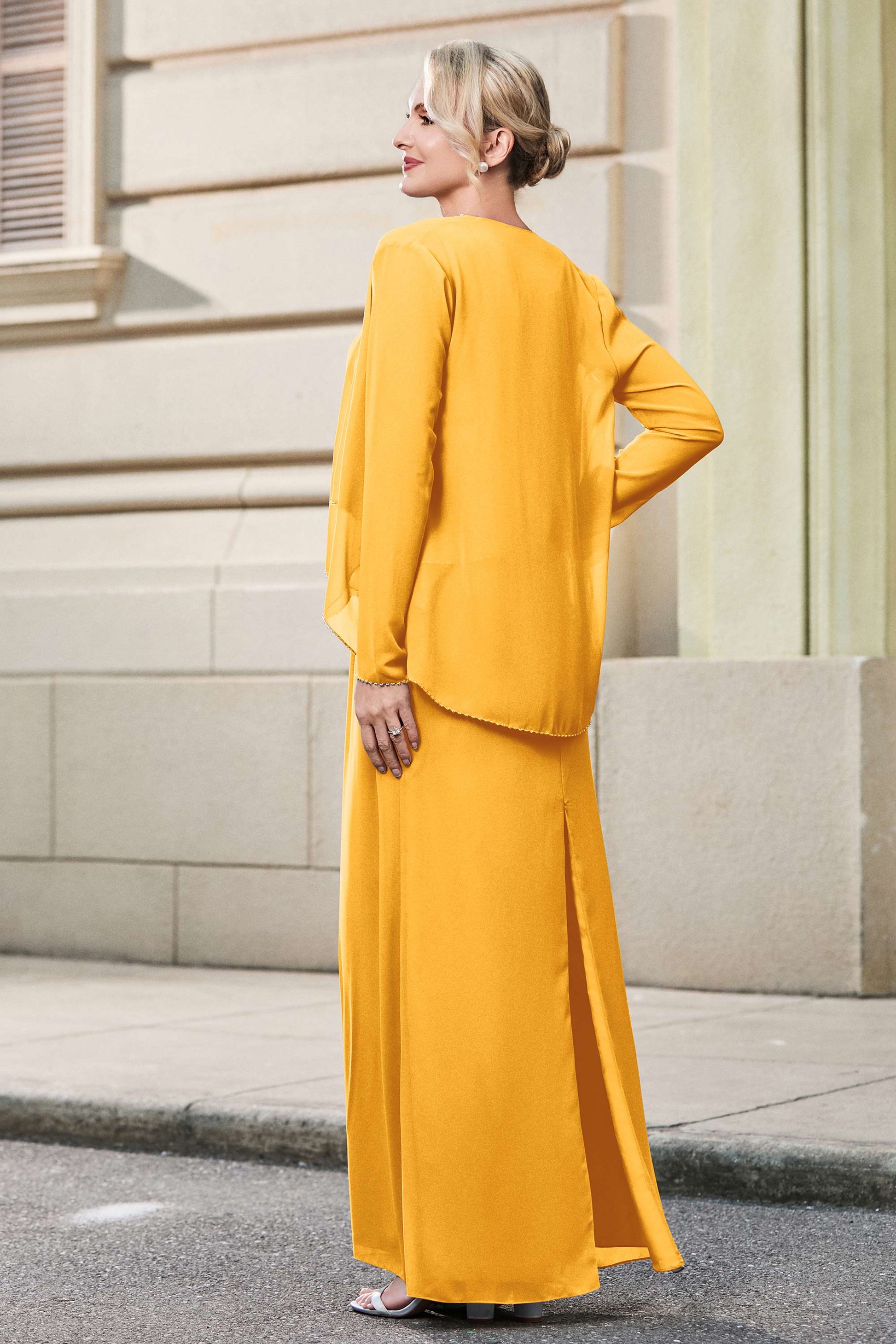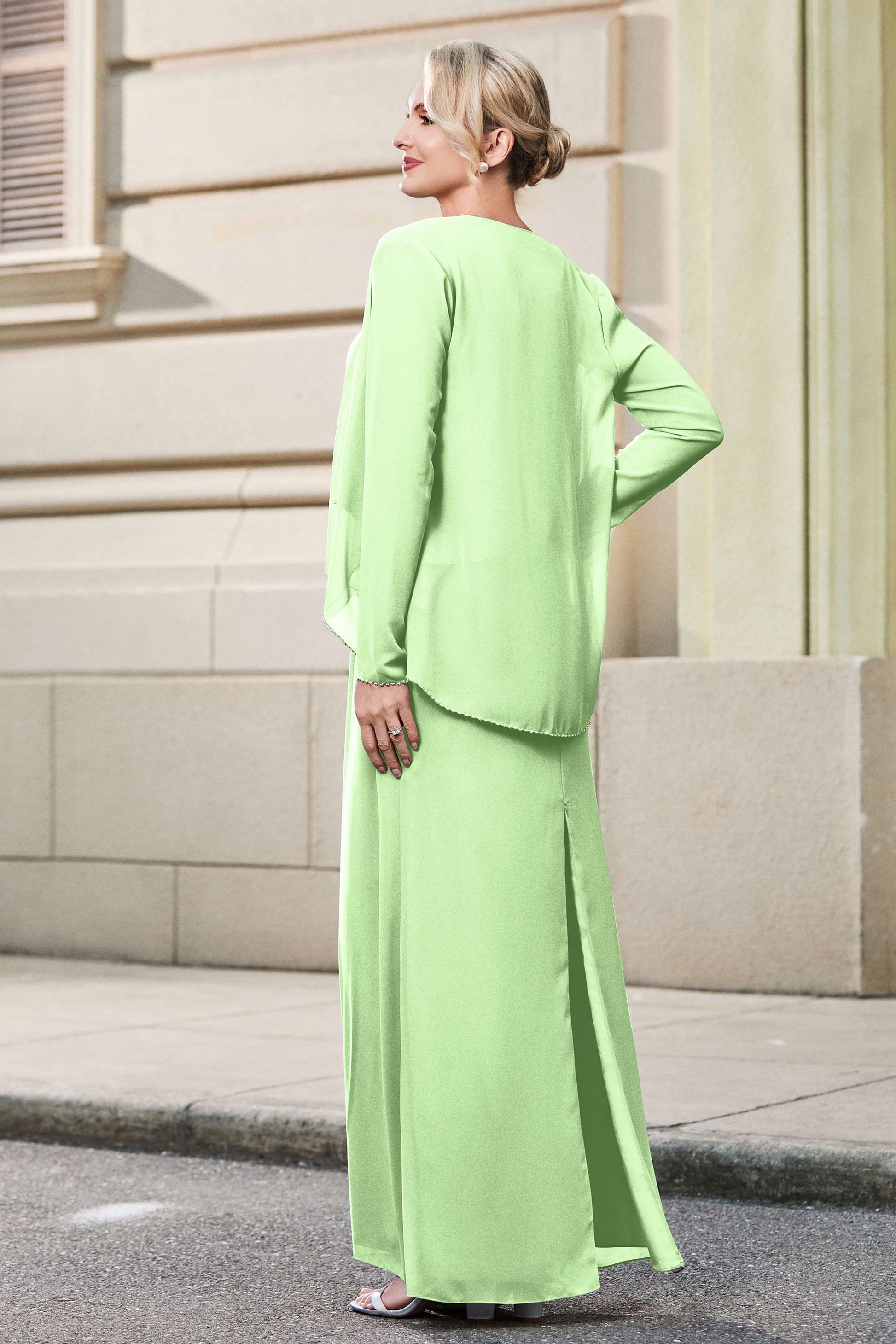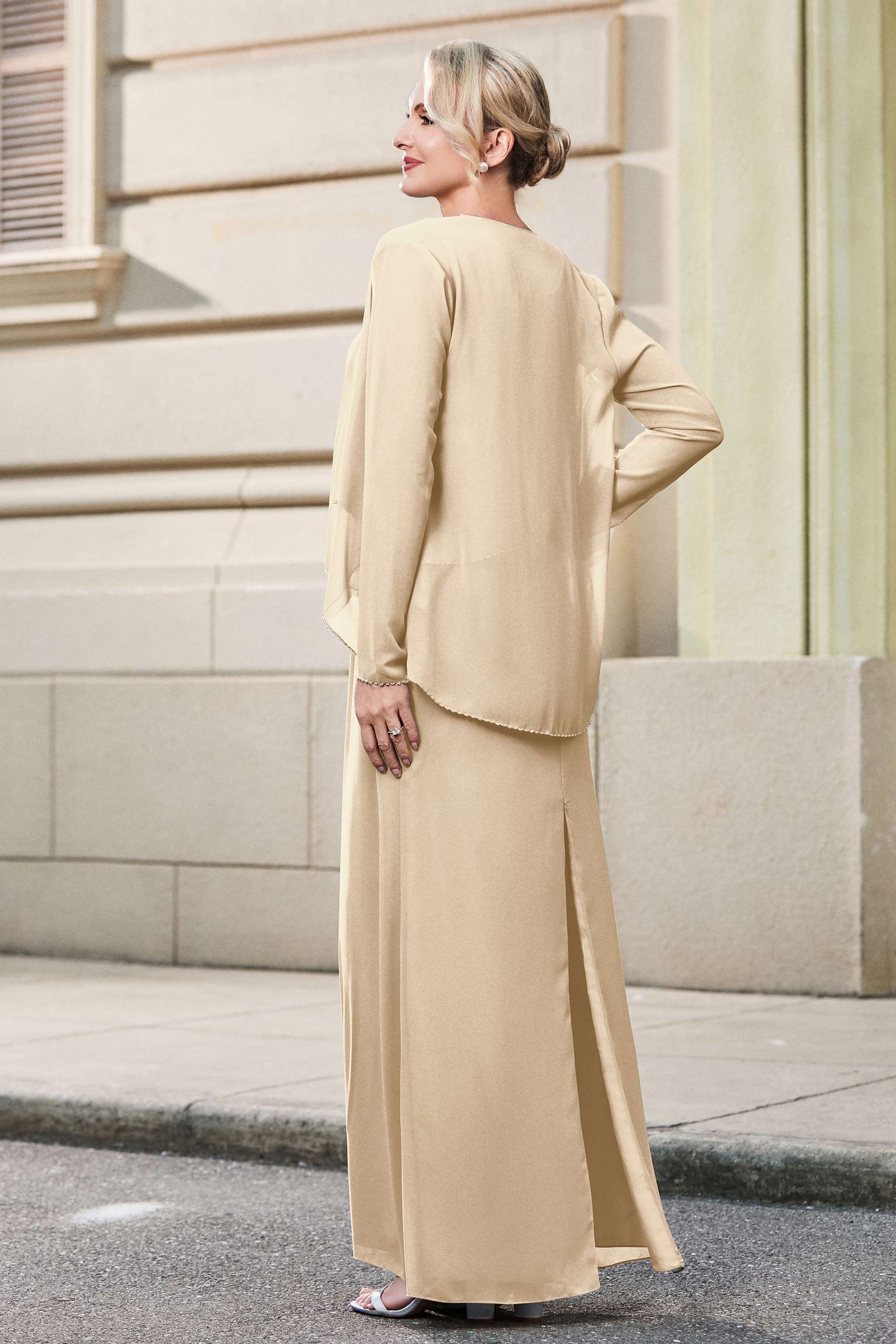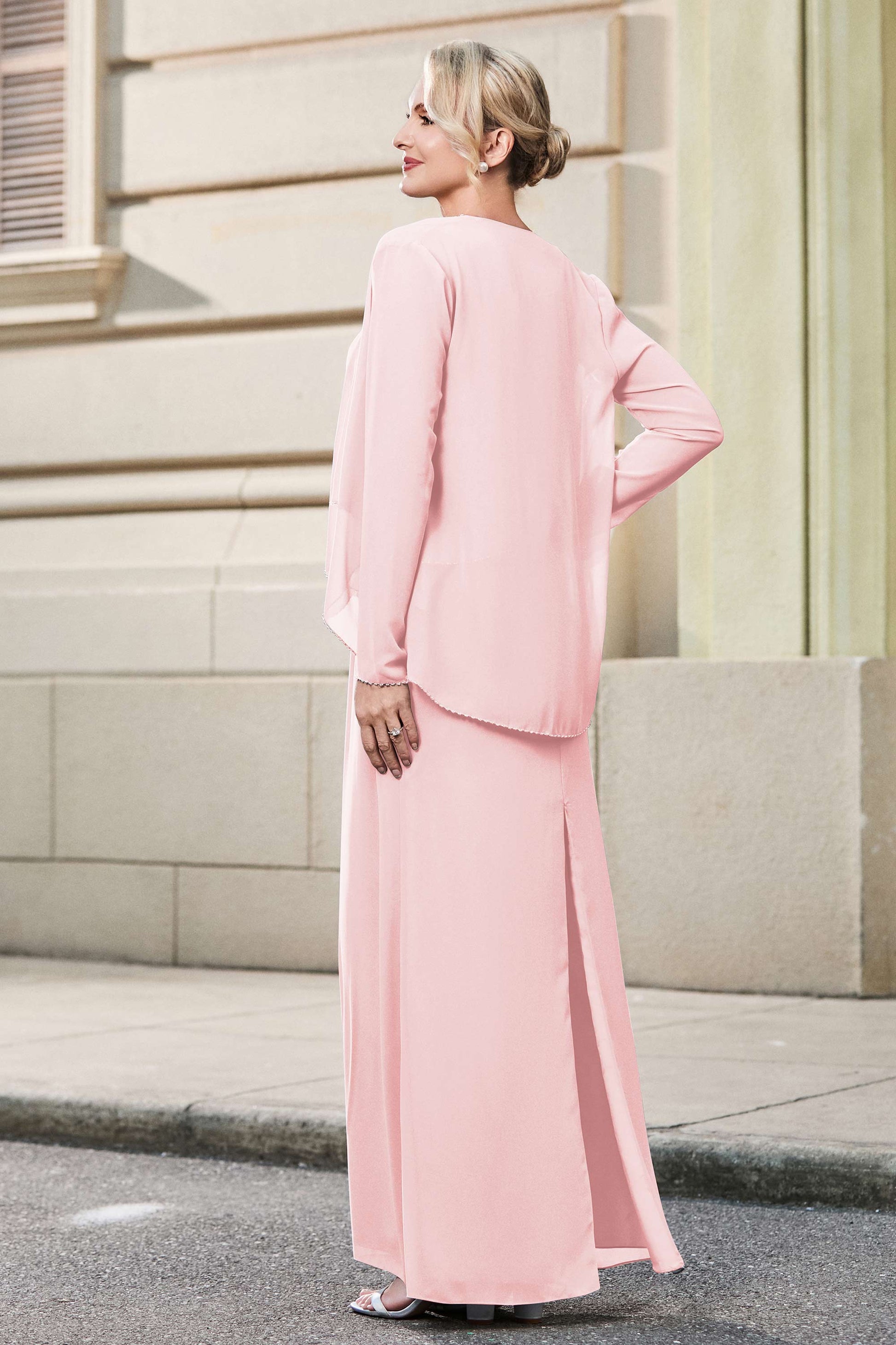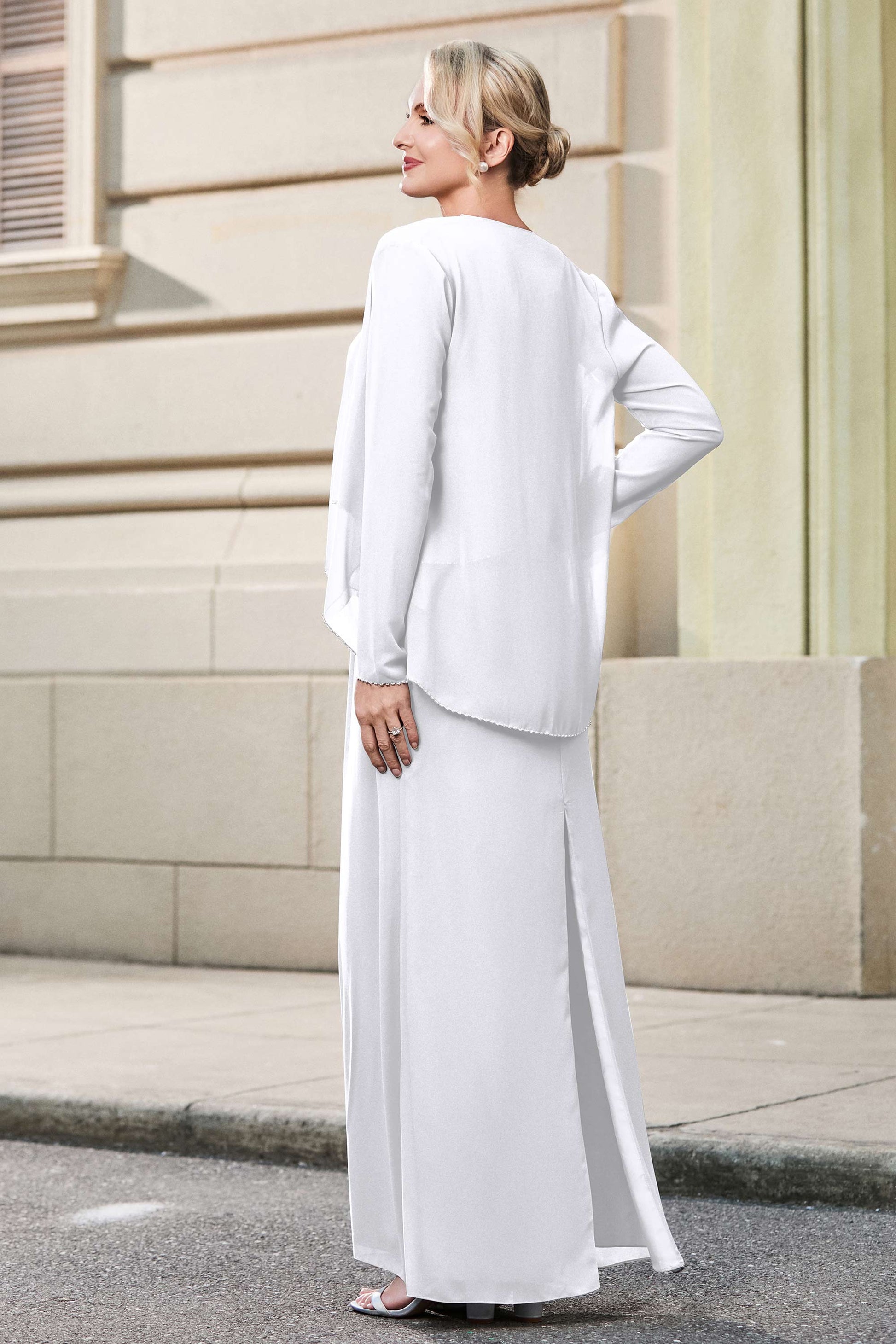 This dress offers an effortlessly chic and sophisticated look. The scoop neckline adds a flattering touch, while the back slit provides a modern, daring twist. Paired with a matching jacket, this dress is perfect for those who seek elegance with a hint of contemporary style.