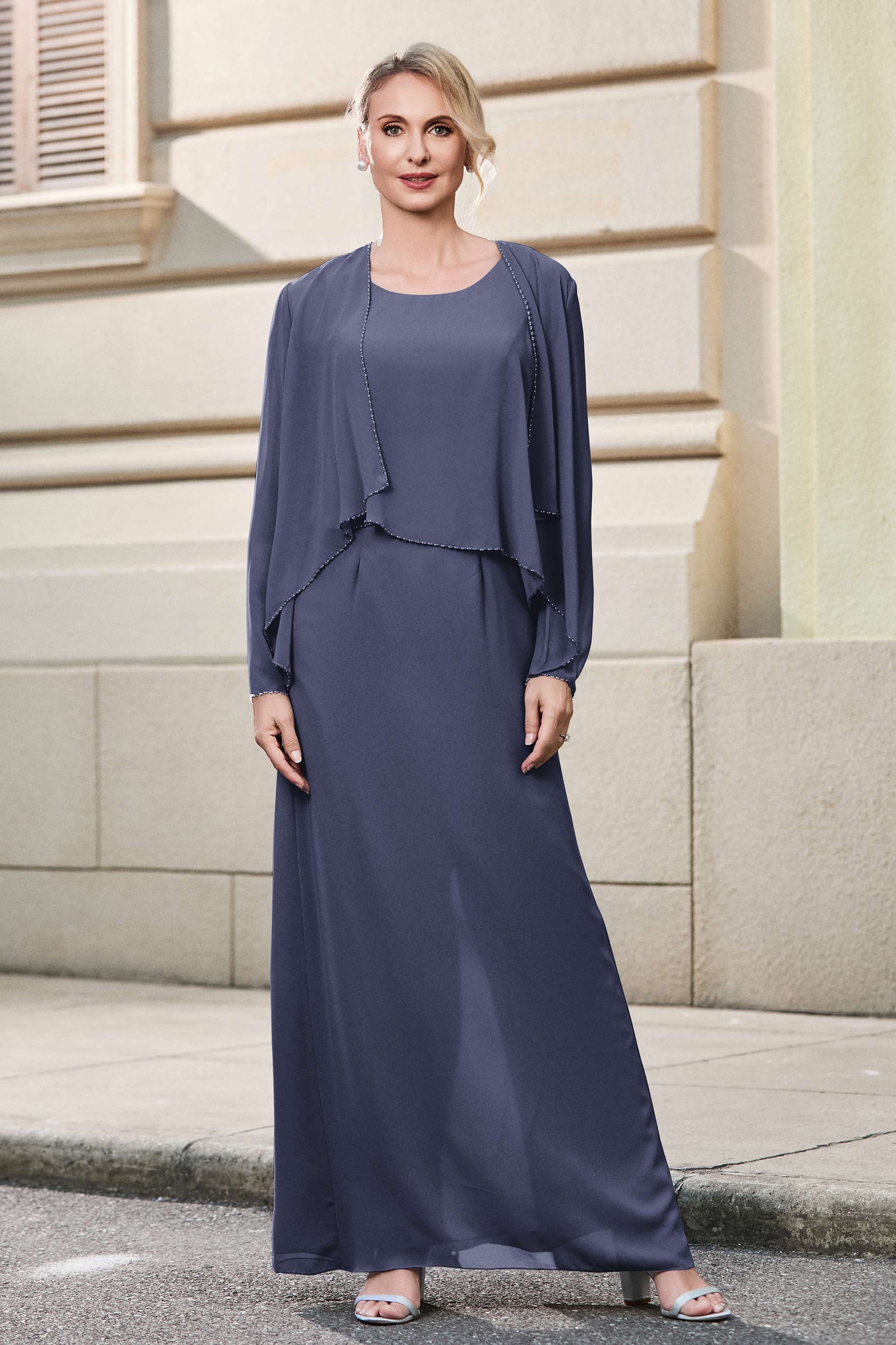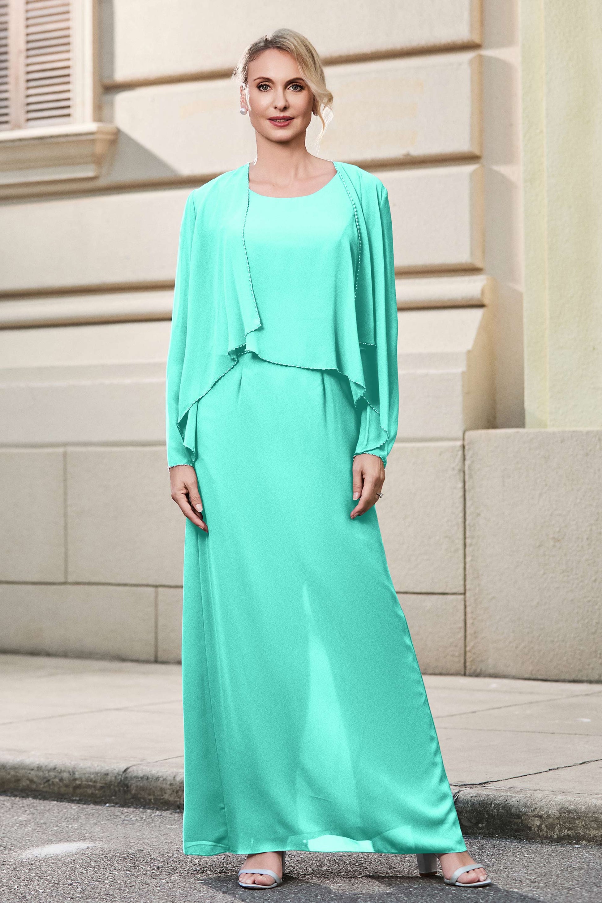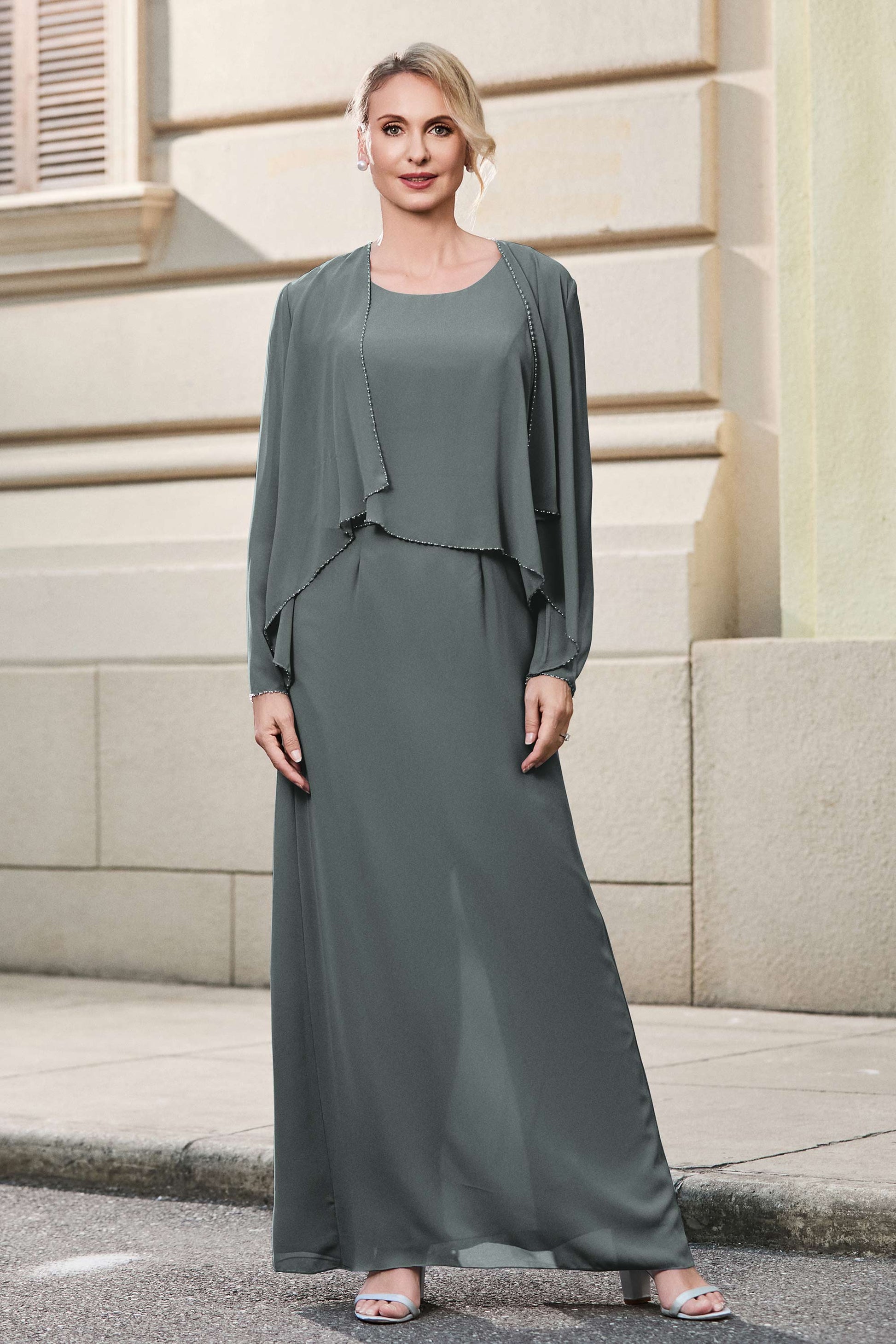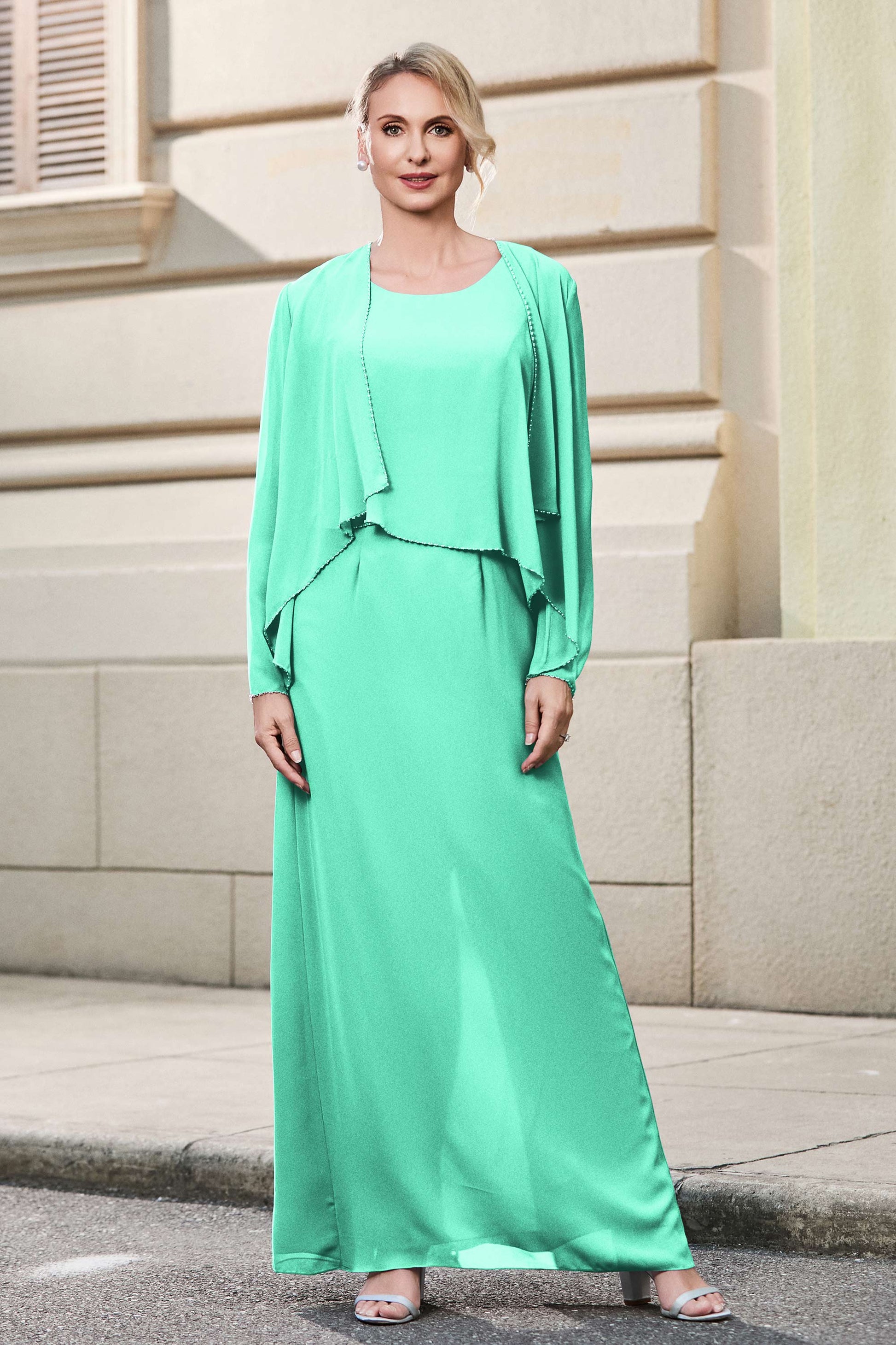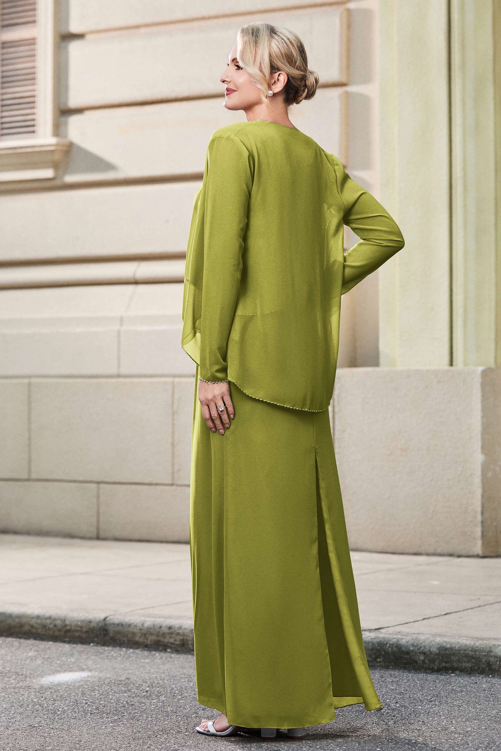 This dress offers an effortlessly chic and sophisticated look. The scoop neckline adds a flattering touch, while the back slit provides a modern, daring twist. Paired with a matching jacket, this dress is perfect for those who seek elegance with a hint of contemporary style.