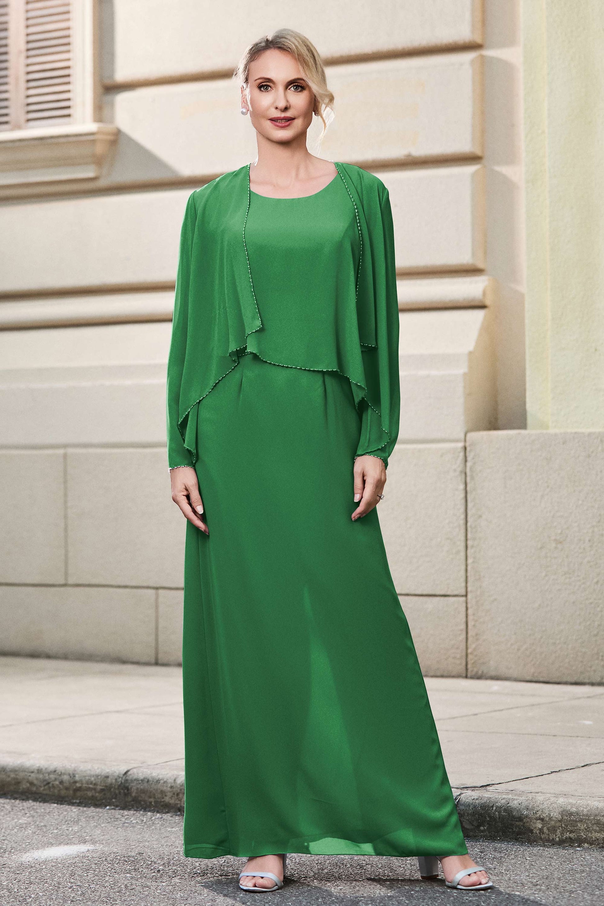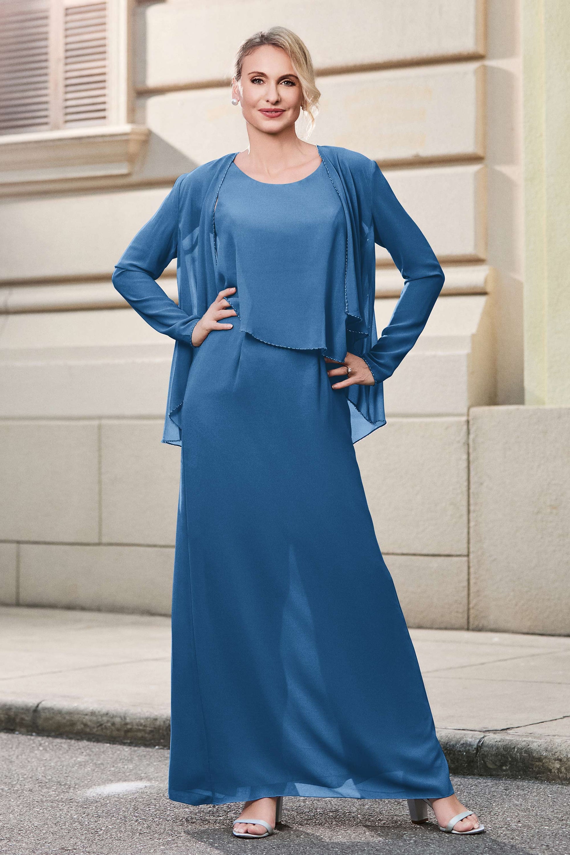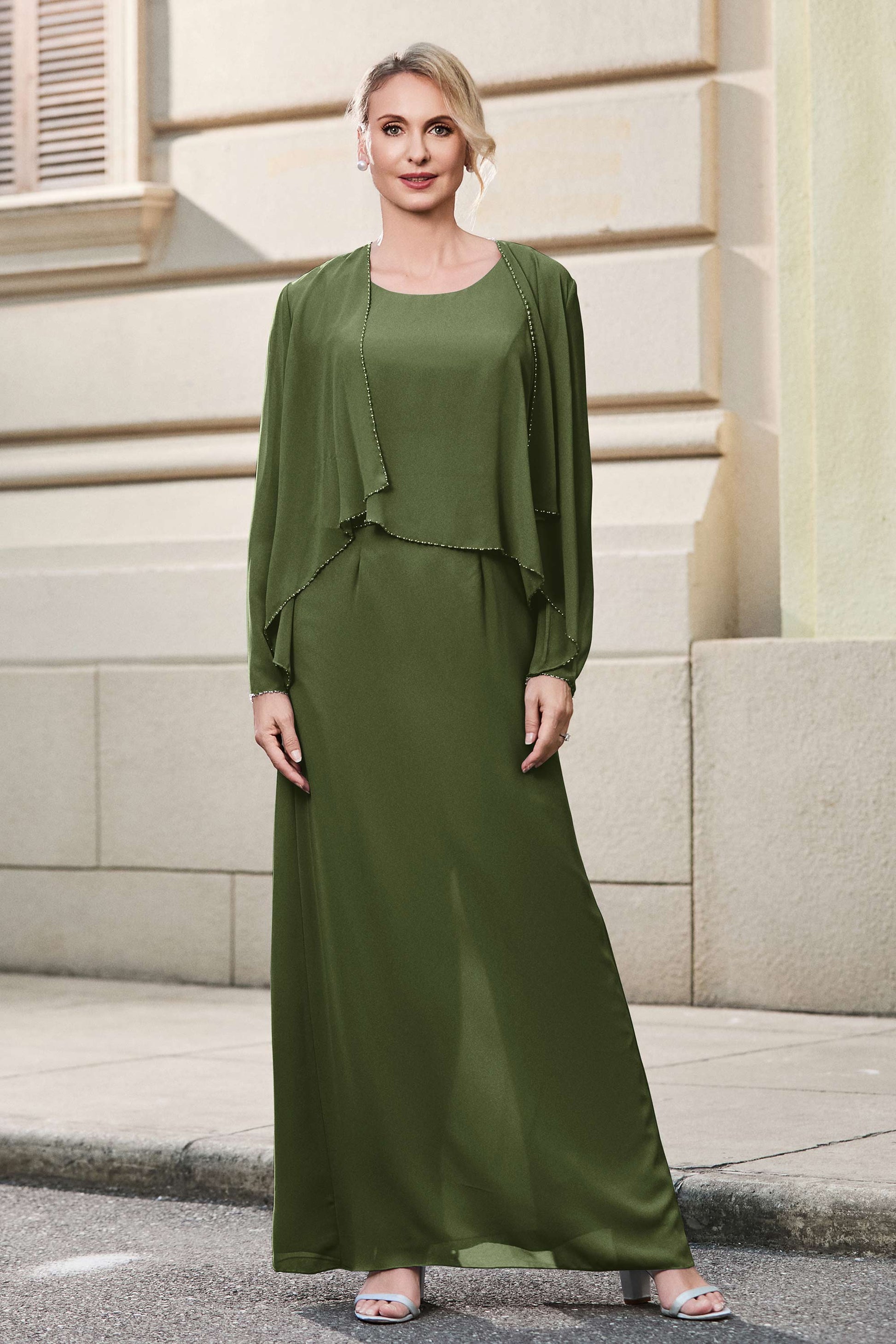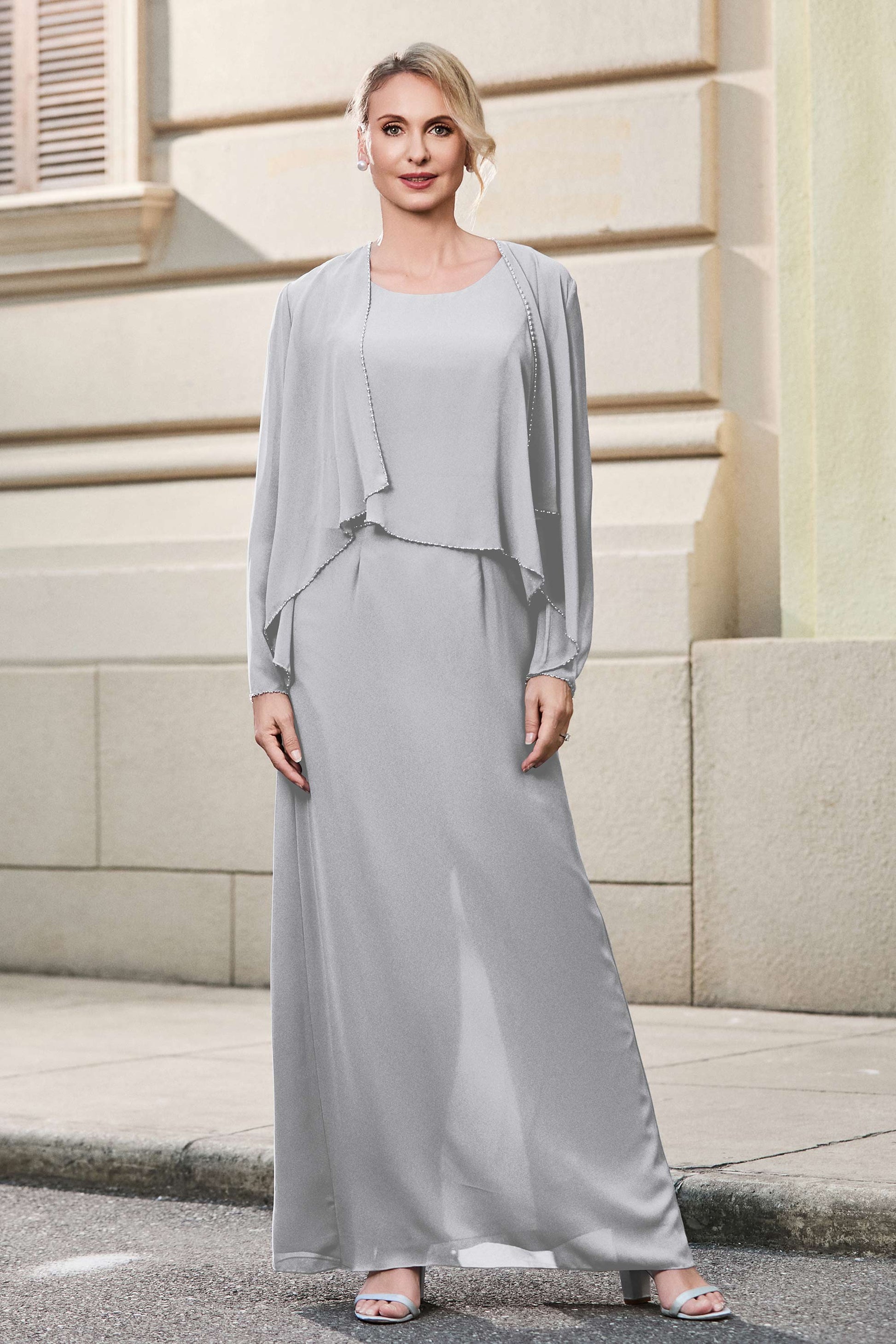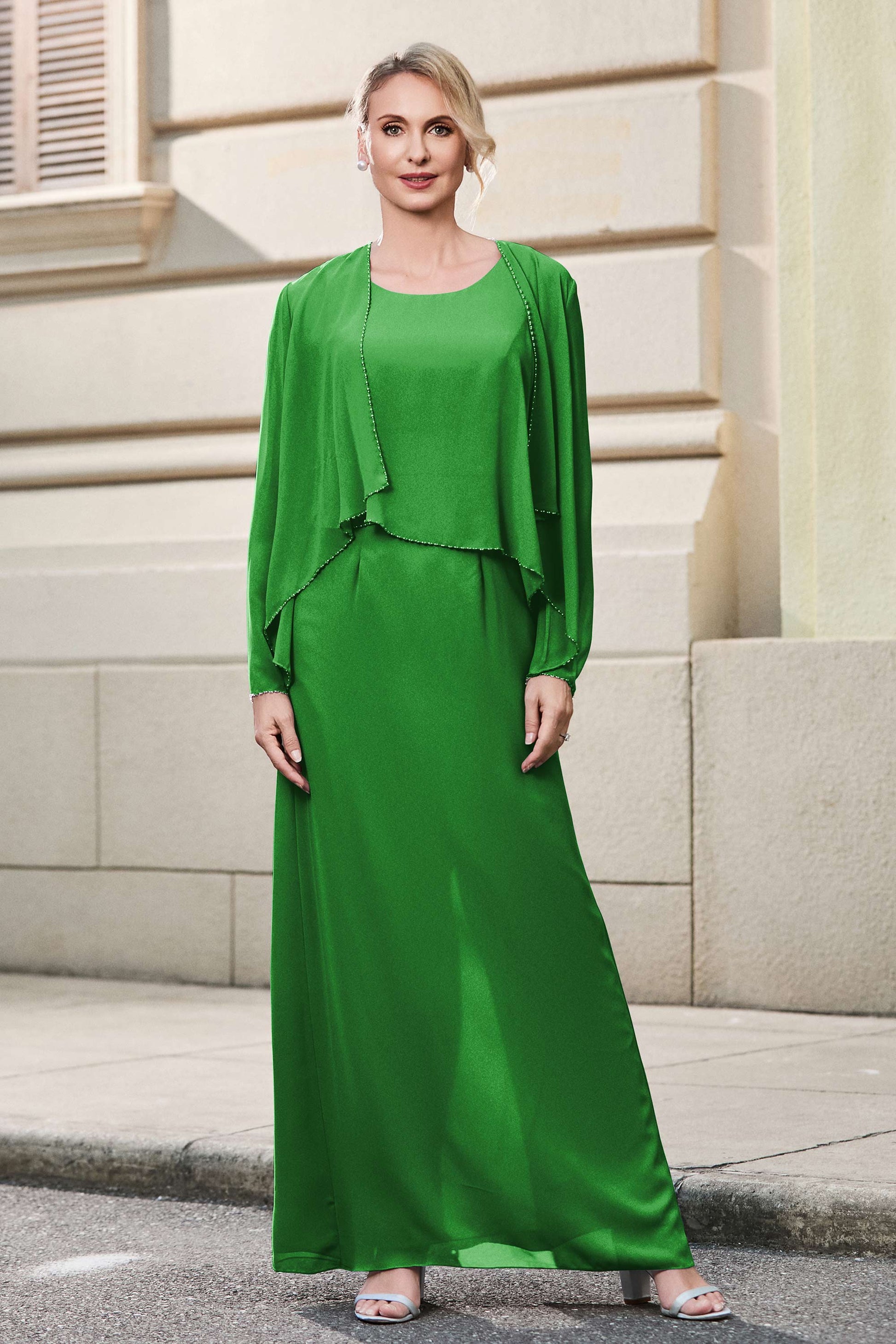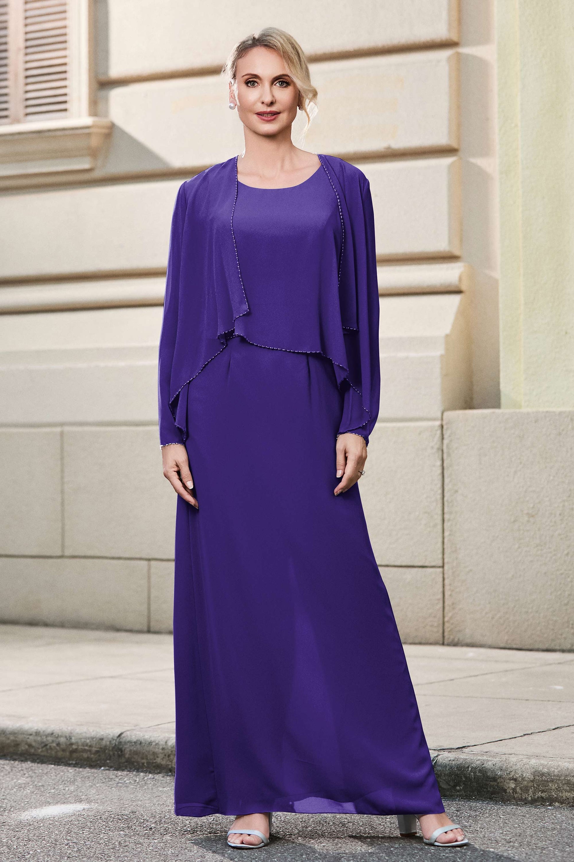 This dress offers an effortlessly chic and sophisticated look. The scoop neckline adds a flattering touch, while the back slit provides a modern, daring twist. Paired with a matching jacket, this dress is perfect for those who seek elegance with a hint of contemporary style.